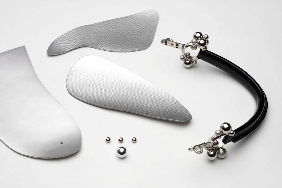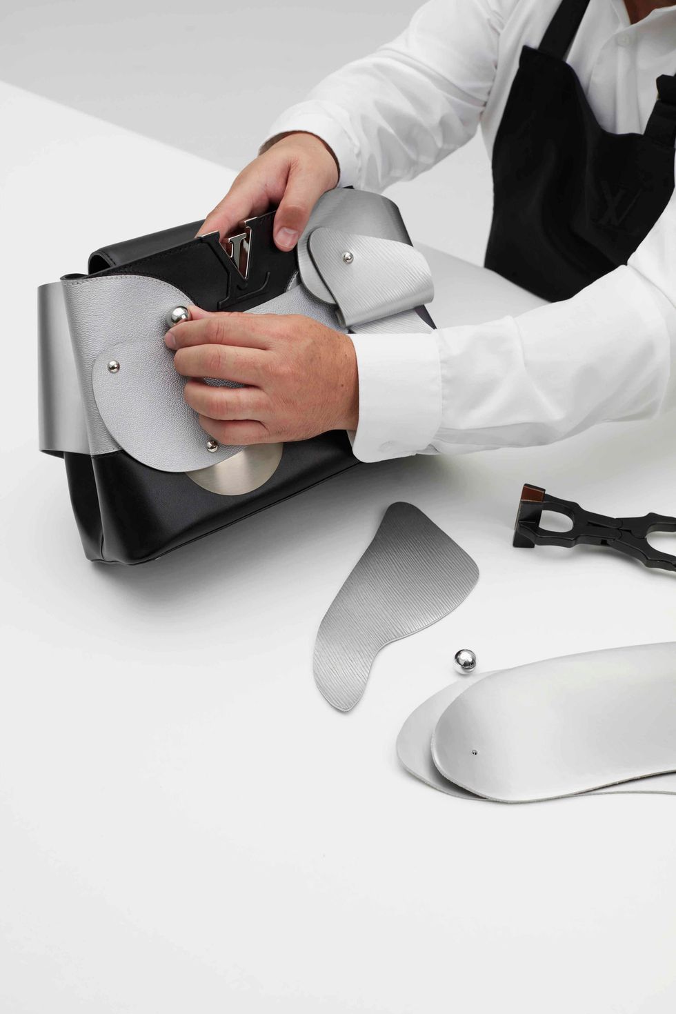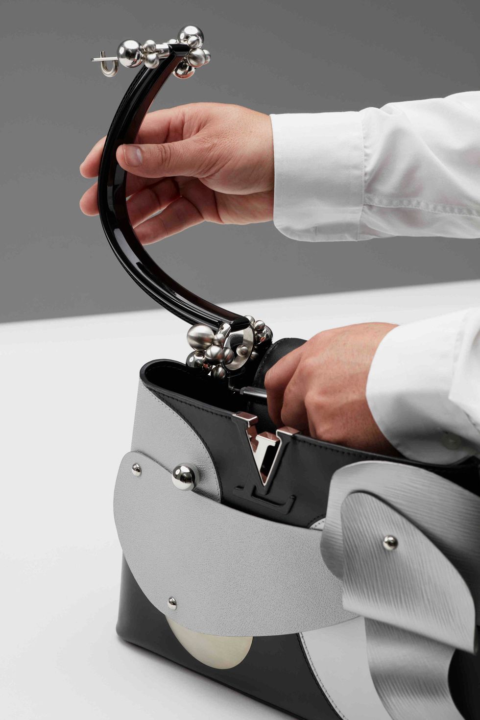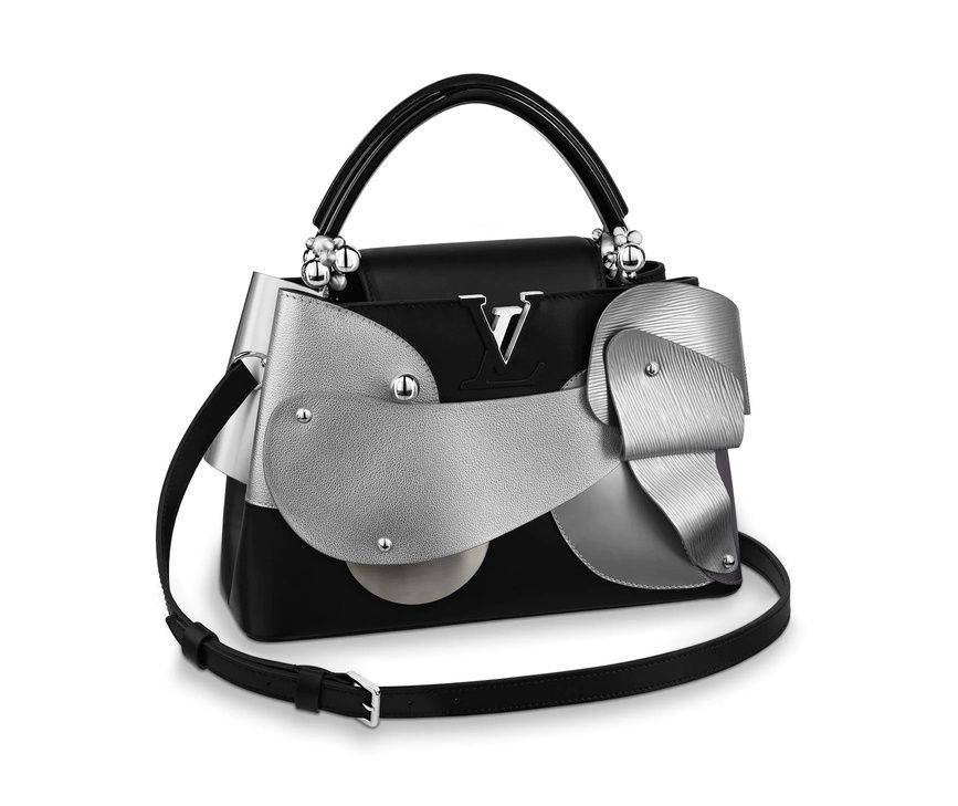 In 2019, Liu Wei unveiled Microworld, a large-scale sculptural installation that debuted at the Venice Biennale. The Beijing-based artist based his Capucine on that work, whose aluminum petals from the sculpture are recreated using five different types of silver leather that are molded onto the bag's exterior or attached using Louis Vuiton-engraved rivets. The Plexiglas handle is held in place by rings covered in metal spheres in different finishes that match the original artwork.