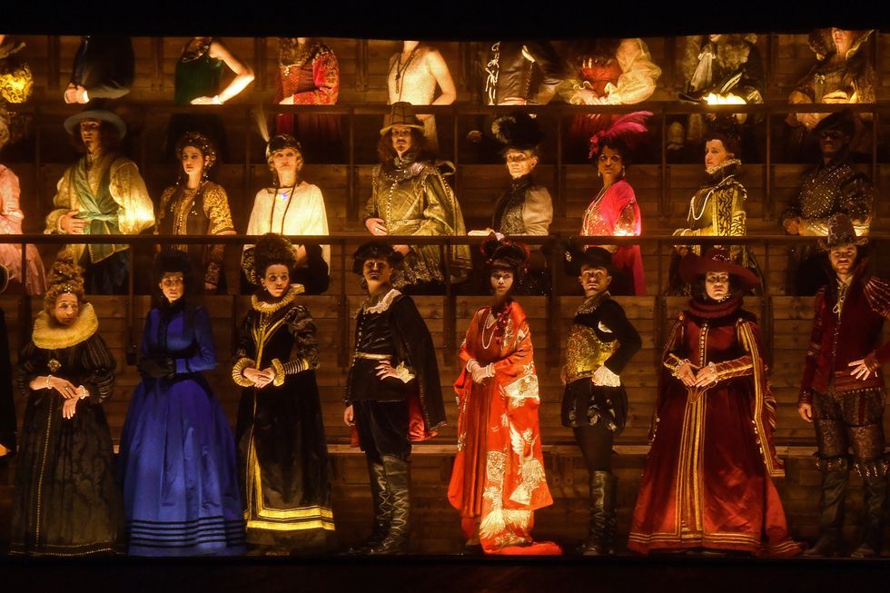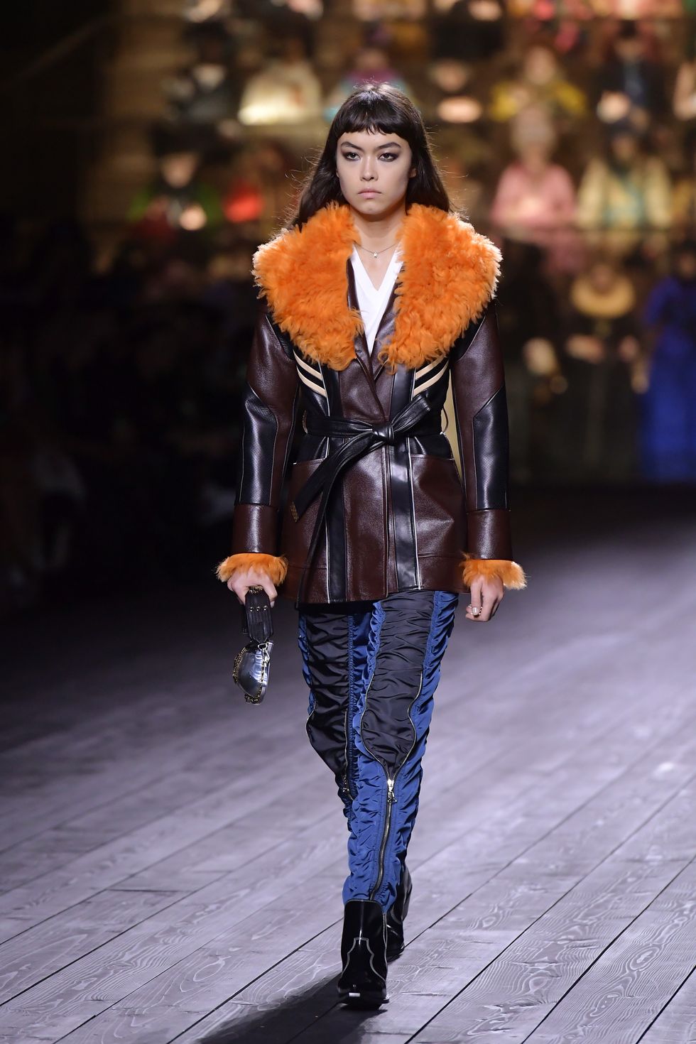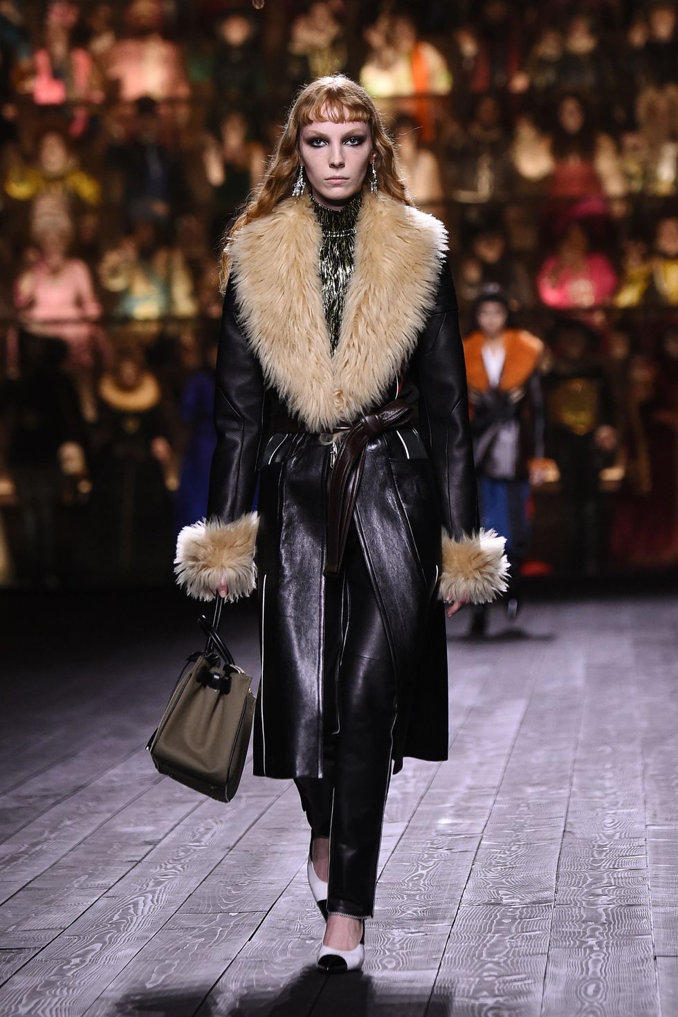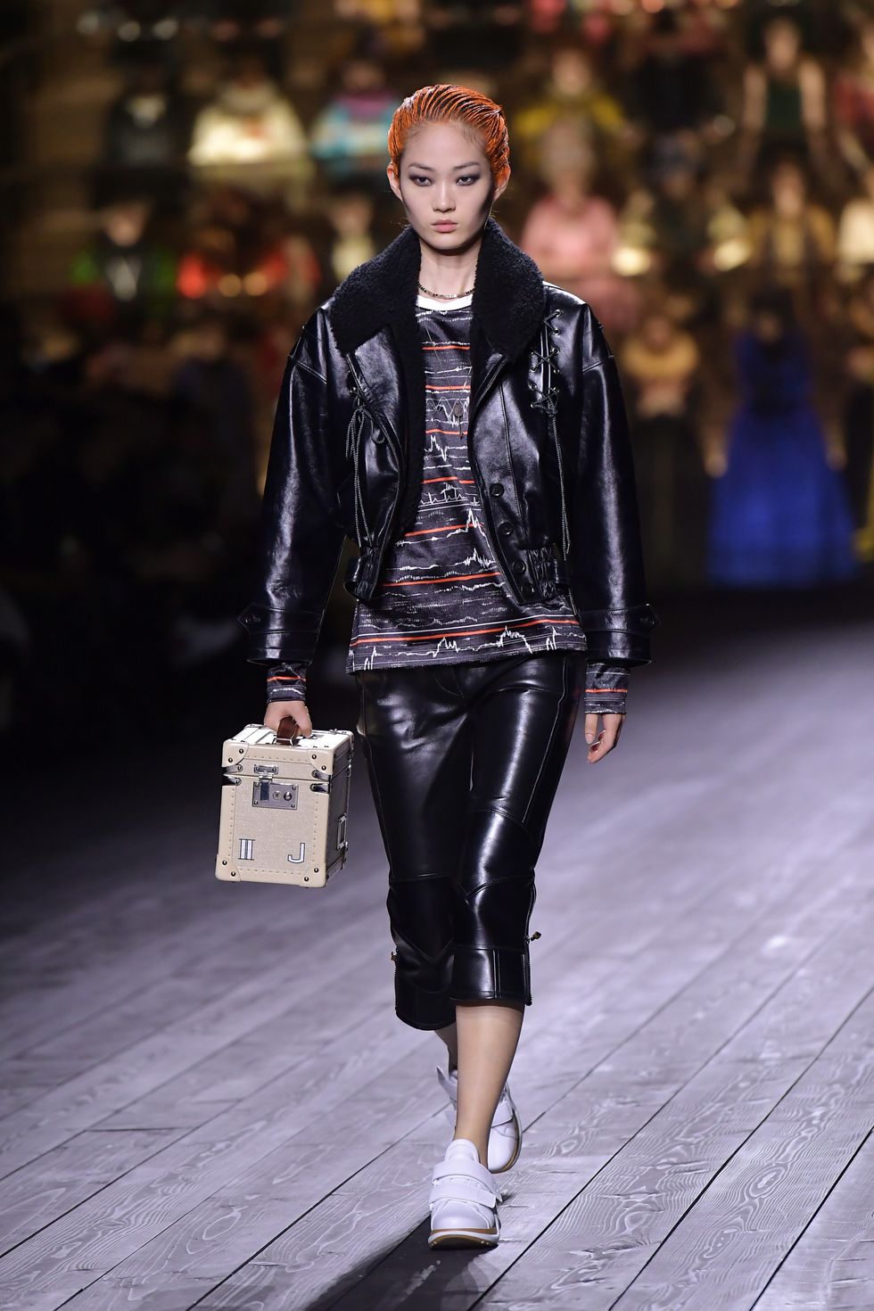 Before the first model walked out at Louis Vuitton's Fall 2020 show today, the curtain rose to unveil some 200 people in the grandstand dressed up in historical garb. Everything from 15th century regal court uniforms to 1950 housewife dresses were on display, as if a time machine had exploded in the audience.