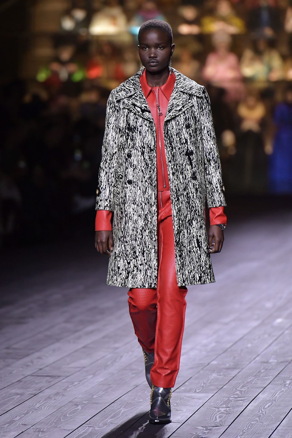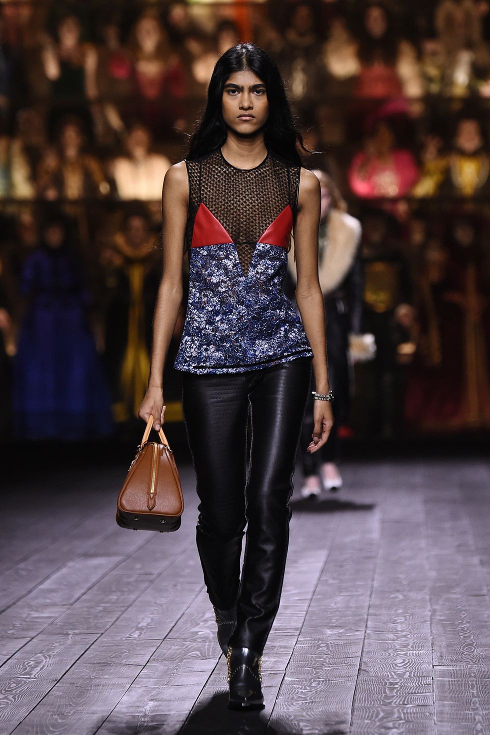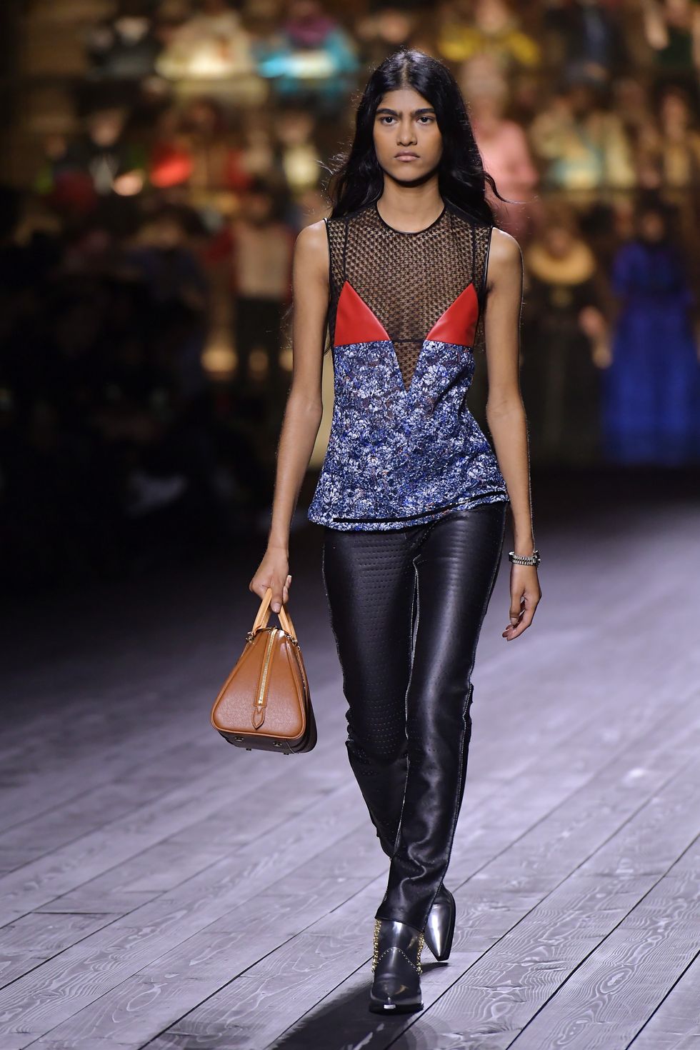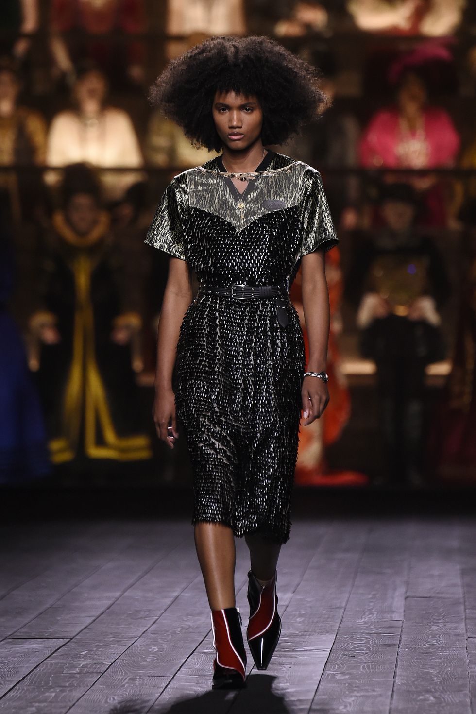 Even though the backdrop was essentially a history book come to life, the clothes were decidedly futuristic. Creative Director Nicolas Ghesquiere's signature post-modern/ sci-fi aesthetic provided a nice contrast to the anachronisms behind the models thanks to pieces like geometric-printed dresses and the clashing of loud textures.