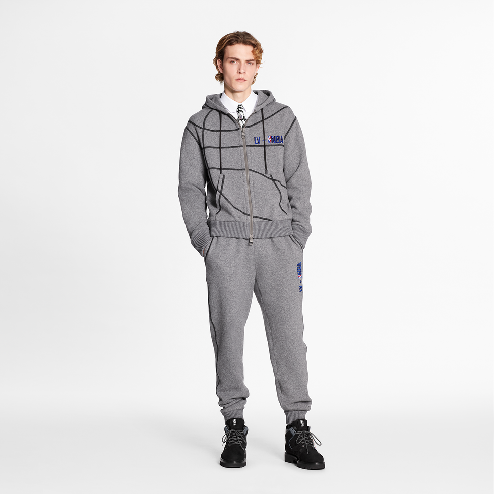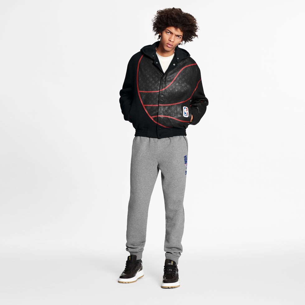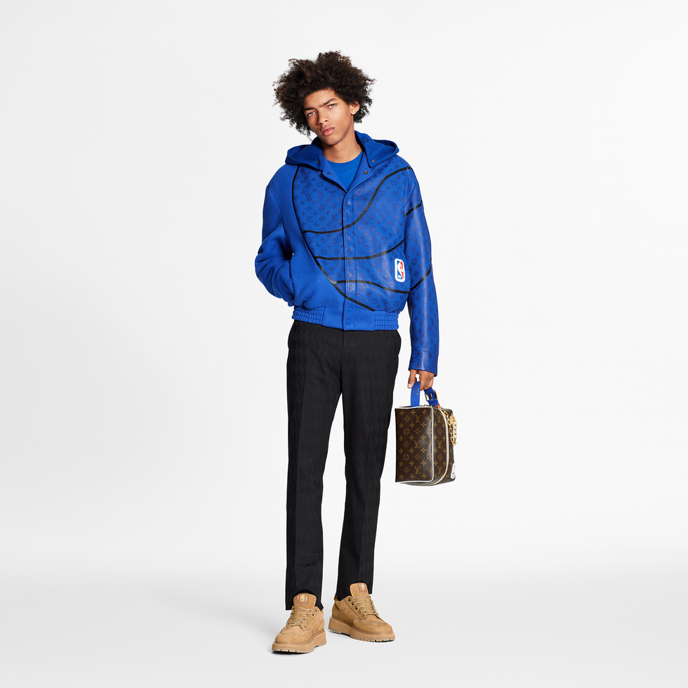 As part of the NBA's multi-year partnership with Louis Vuitton, the collection, designed by Men's Artistic Director Virgil Abloh, mimics the wardrobe of a professional basketball player in three distinct realms: travel, game arrivals and press conferences. Grey cashmere tracksuits adorned with basketball-informed graphics stand out among the travel offerings and a blue-hooded leather jacket makes a statement upon game arrival, while suits and dress shirts comprise the more formal press conference attire.