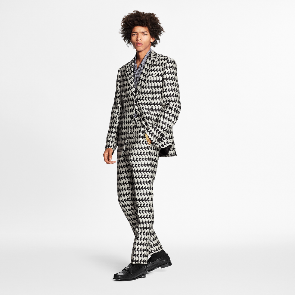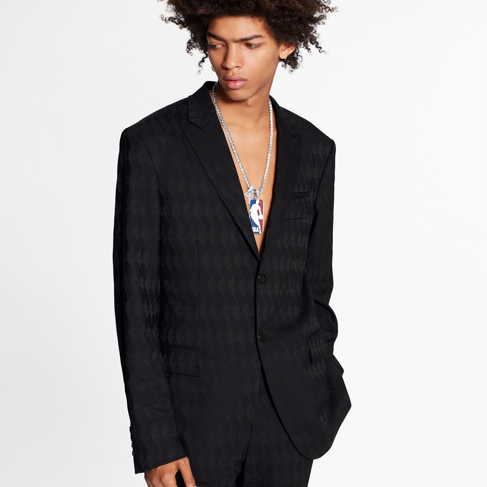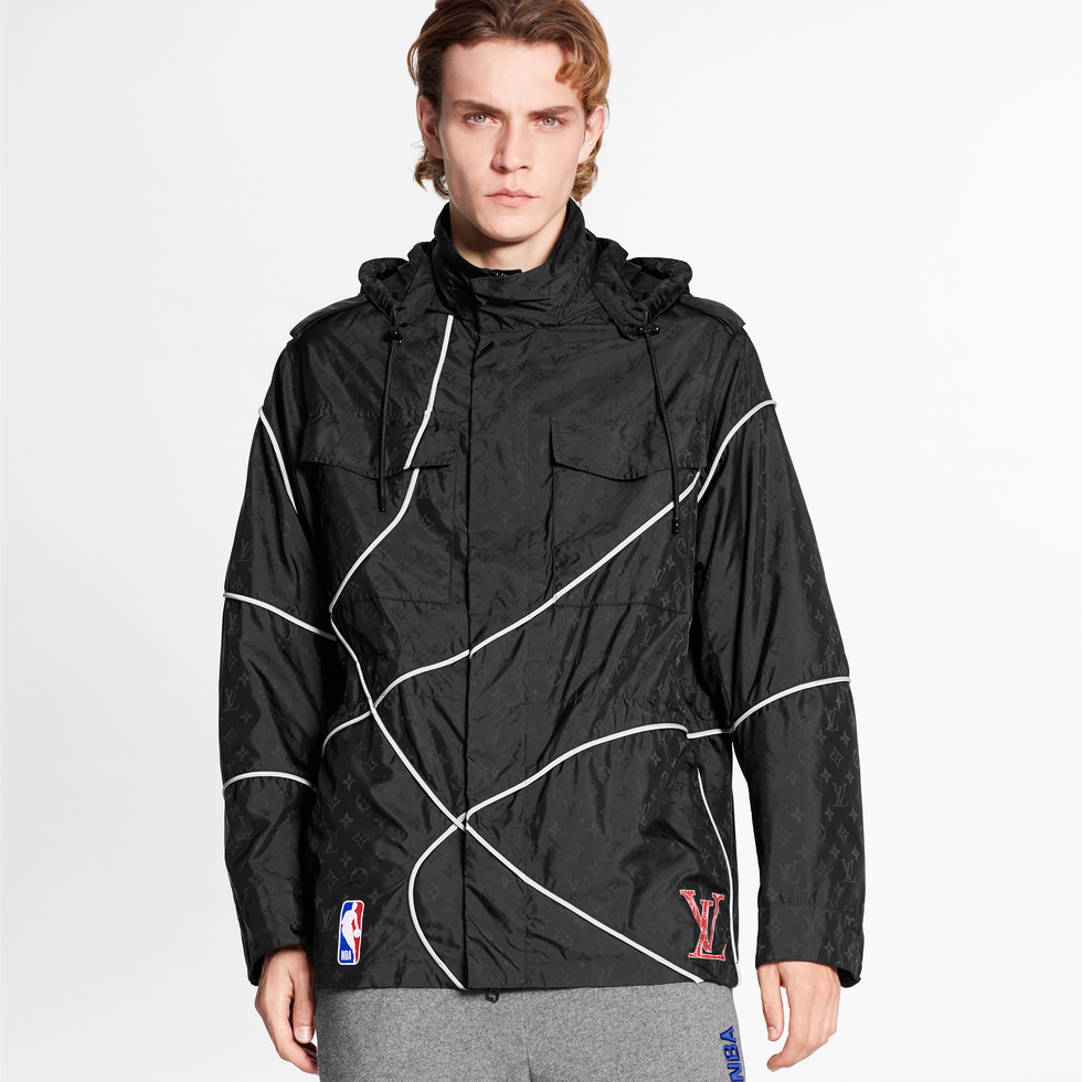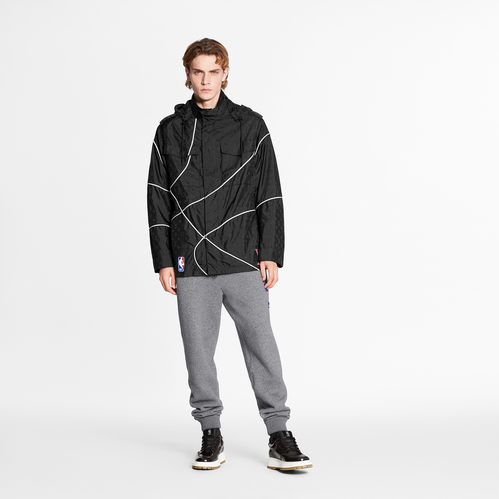 As part of the NBA's multi-year partnership with Louis Vuitton, the collection, designed by Men's Artistic Director Virgil Abloh, mimics the wardrobe of a professional basketball player in three distinct realms: travel, game arrivals and press conferences. Grey cashmere tracksuits adorned with basketball-informed graphics stand out among the travel offerings and a blue-hooded leather jacket makes a statement upon game arrival, while suits and dress shirts comprise the more formal press conference attire.