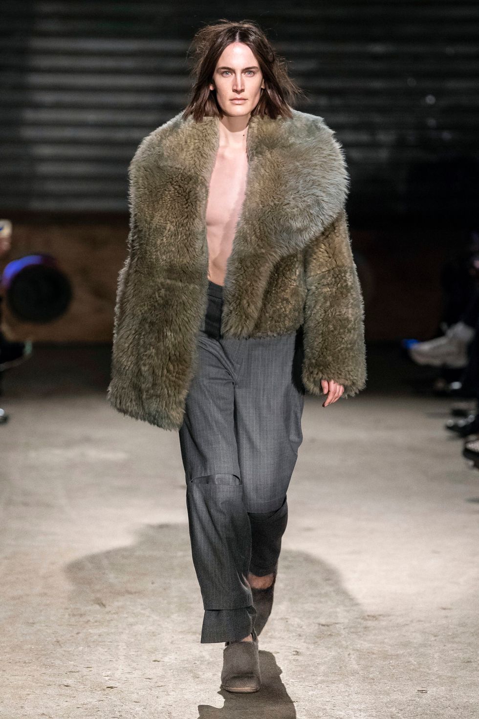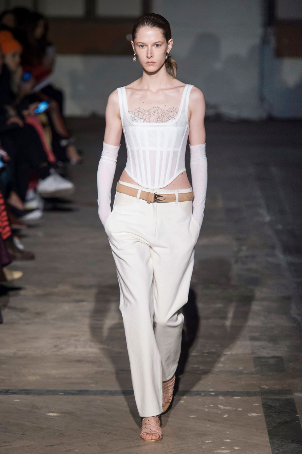 Dion Lee showed at least eight variations on low-rise pants, pairing them with structured corsets to emphasize slim hips. Brandon Maxwell opened his show with a pair of black low-rise track pants; Eckhaus Latta opened their (awesome) show with low-slung trousers with gaps at the knees. A sharp collection from Proenza Schouler included wide-legged slacks with waistlines far below the waist and maxi skirts in similar proportion, smartly styled over leather pants. Opening Ceremony's fall lookbook includes two versions of low-waisted pants, and Priscavera's take on the silhouette came in the form of transparent vinyl jeans. Both Area and LRS showed miniskirts that fastened far below belly buttons.