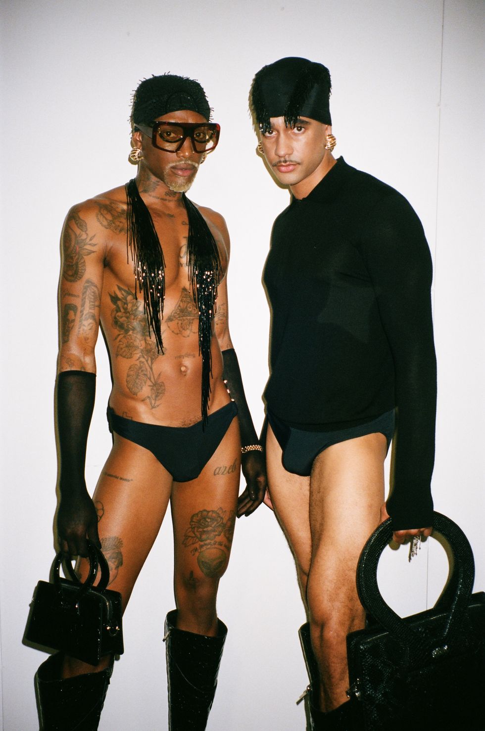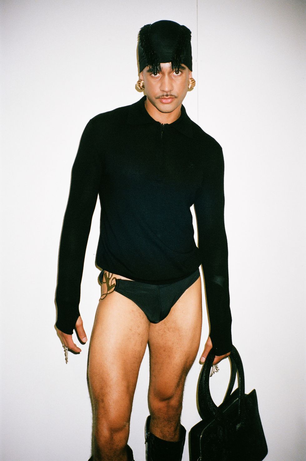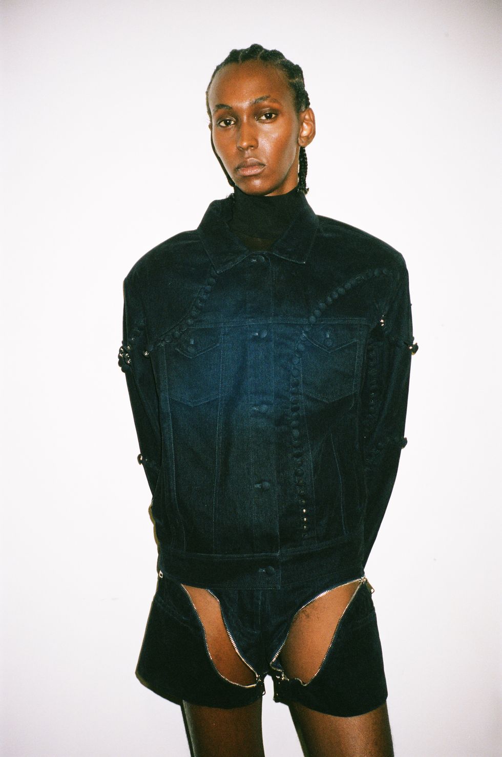 Suddenly, as car-trunk subwoofers on either of the runway whirred with bass-heavy compositions by Aaron David Ross (ADR), show opener Alex Consani strode out ferociously in a trailing black corset and sheer tights. As black L-logo flags waved overhead and the message was clear: Let them all talk.