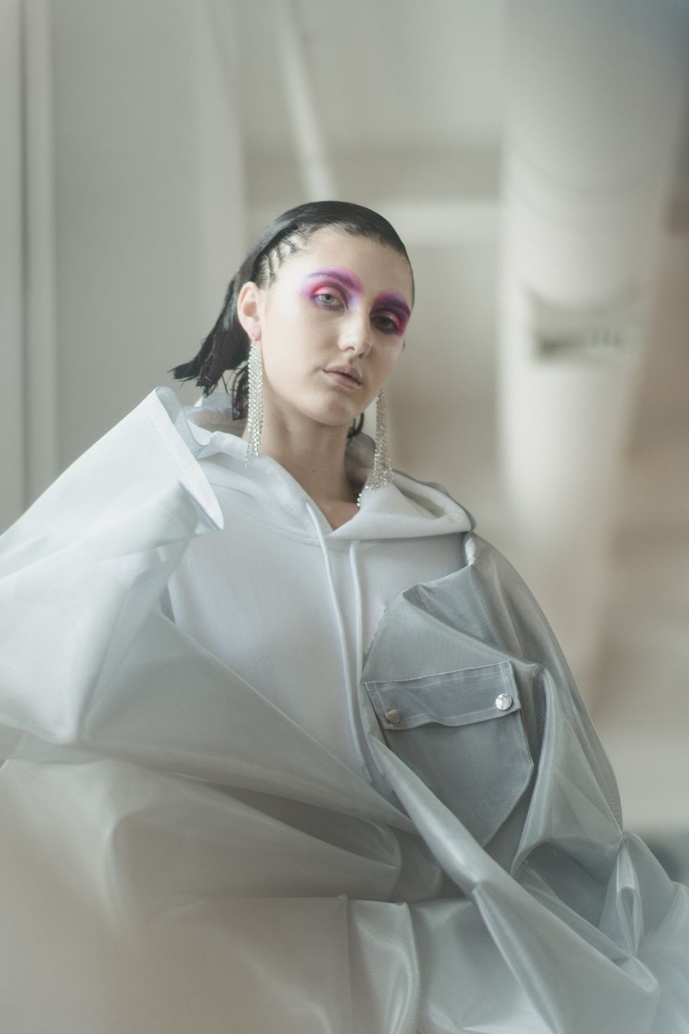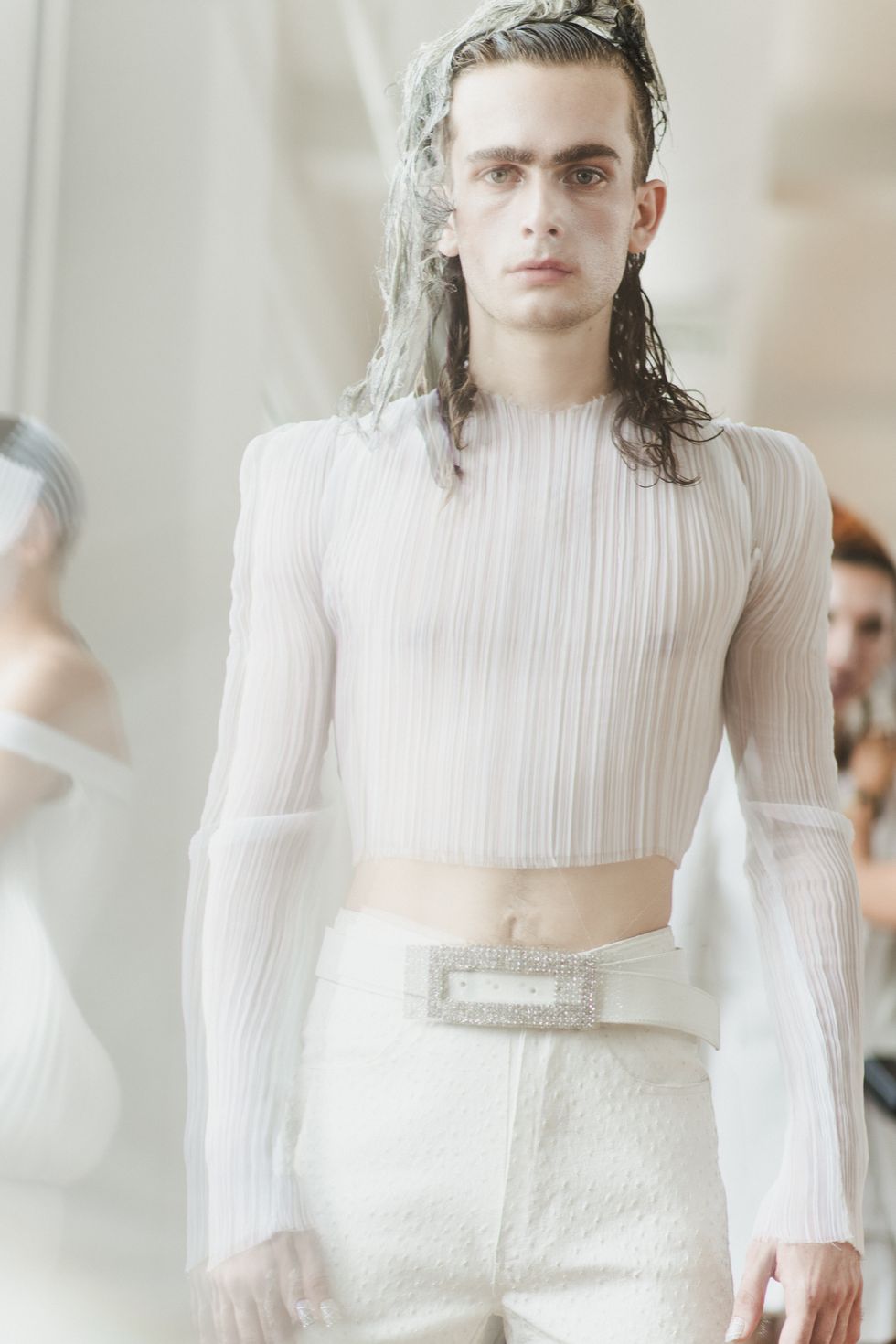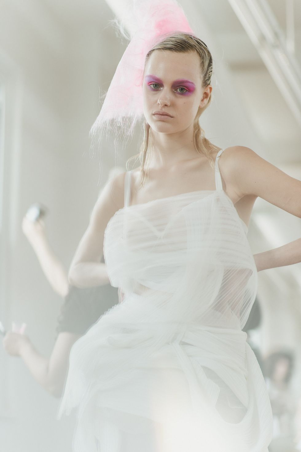 If the goal was to distract people from the hellscape that is our current world, Lopez definitely succeeded. The show guests watched open-mouthed as models strolled by in ornate confections that seemed to float (as Dante put it, the designer "[deals] with shadows as with solid things"). They wore sculptural knife pleats and headpieces that looked like whipped cotton candy, and smeared, lived-in makeup.