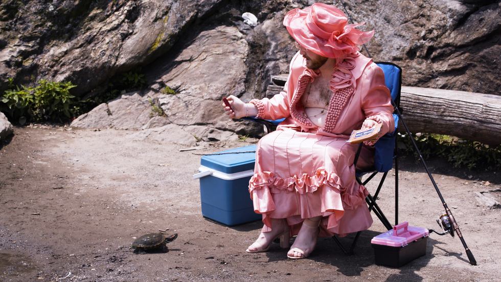 Imagine this: You're running around Central Park on your lunch break when you catch a glimpse of candy pink silk out of the corner of your eye. Slowing your pace, you take out your AirPods and go over to investigate, only to find a man, bare-chested in a ruffly dress and a Sunday service hat, sitting in a fold out chair and singing to the turtles, all while feeding them some Oscar Meyer weiners with a stick. It is, undoubtedly, a sight to behold.