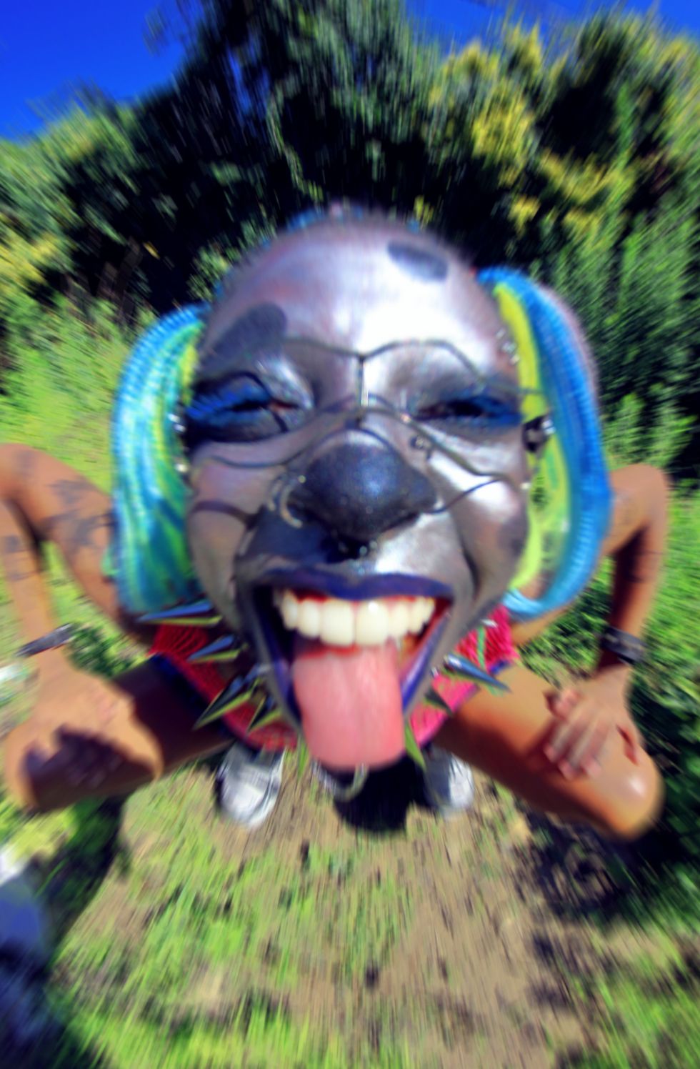 LustSickPuppy is a shape-shifting sex canine from outer space. I'd best describe her as cute and slightly disturbing. I love glitter and blood, so you're getting both of those. I take on many forms depending on my mood and appetite. My music is a reflection of that. It acts as a warning to proceed with caution. When I perform my makeup looks typically bounce between puppy paint or a smiley face — both because they are non-threatening and a huge juxtaposition to the music. It's meant to disarm the audience and warp their reality with what's about to happen. It's like when you go to pet a dog and it bites your hand off and then sits there being cute with your bloody disembodied hand in its mouth. I want people to step into my world, so I will present them with a character from that universe. I love this combo of cute mixed with dark and scary.