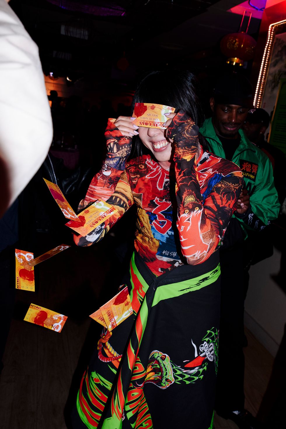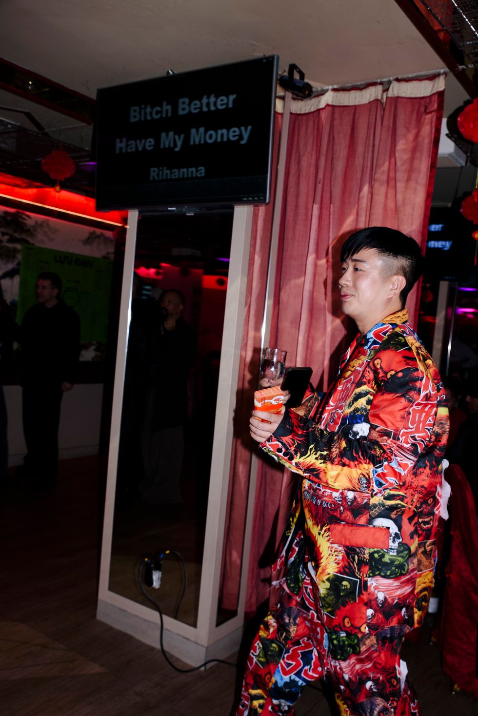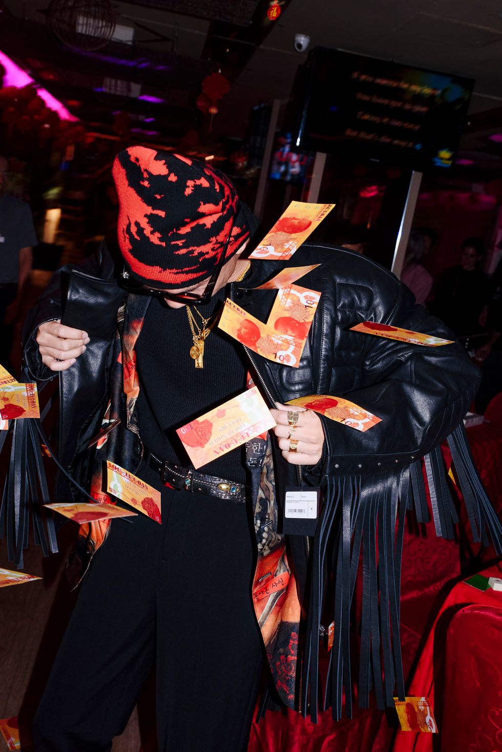 Guests mingled about the spacious red-lit restaurant, dressed in LU’U DAN looks from seasons past, and started by watching a tutorial from the designer himself on how to play the traditional game. Later on, they’d compete to win the brand’s signature Hell-Fire Moto L-D Jacket and writer Susie Lau would eventually take home the grand prize after several rounds of playing.