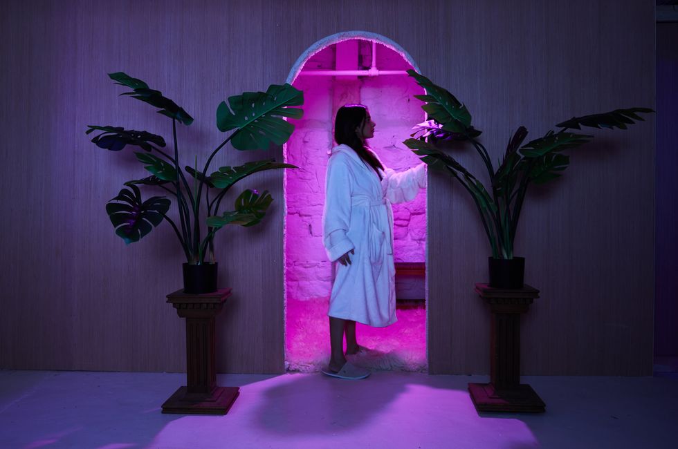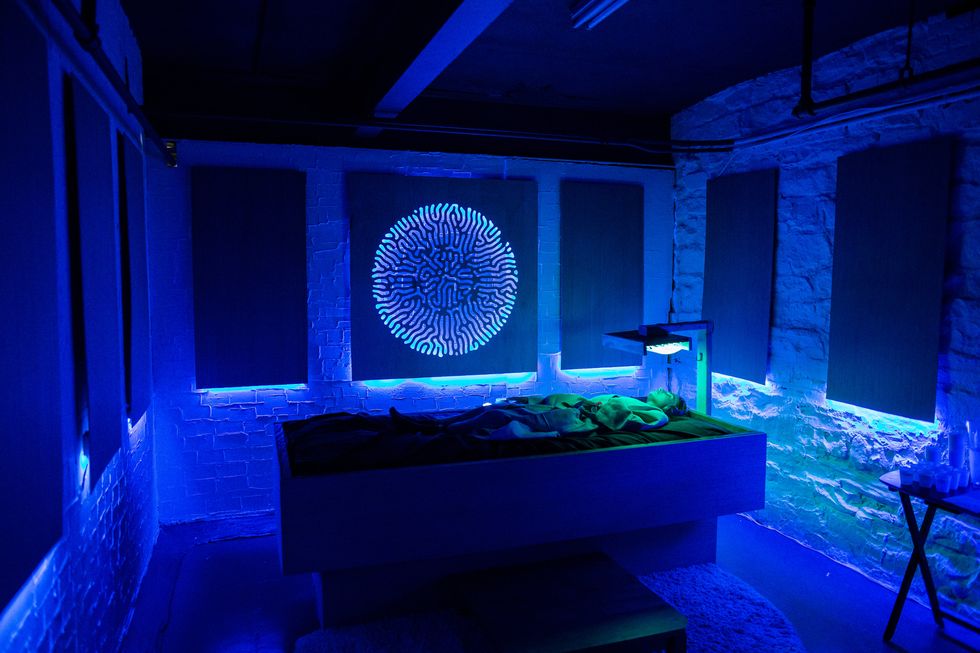 The spa's water bed is fitted with soundproof headphones underneath an overhead light screen. A dial allows you to amp up the light display's intensity, which in turn syncs up to the audio experience and the bed's vibrations. A similar rush of water is experienced in a group sound spa, where you're completely immersed in a pitch-black surround sound room with branches cracking and downpours of rain. If done correctly, Luxury Escapism should feel like a week's worth of rest and relaxation.