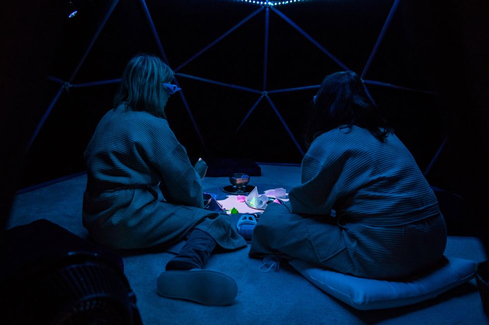 Luxury Escapism immediately offers a cup of hot tea, with plush slippers and robes. Whispering is required and cellphones are prohibited. Staff members guide guests into what feels like a playground for adults, with various tents, a rock garden and mood lighting. Each station is equipped with its own site-specific VR goggles; ones in a hammock take you on a soothing forest river cruise, while another station's emulated a psychedelic '60s flower garden.