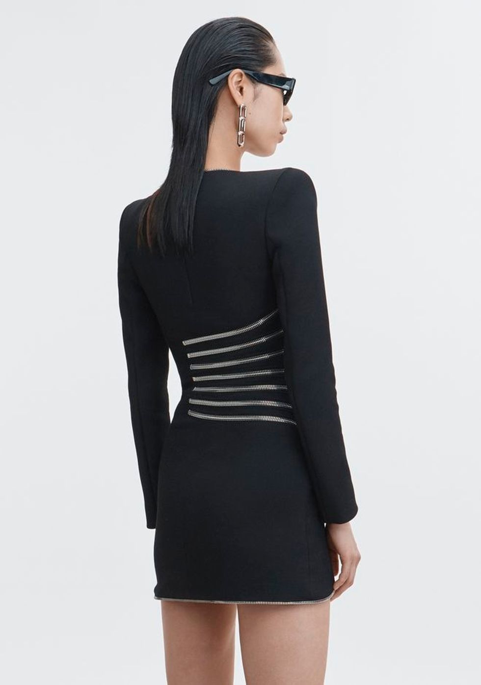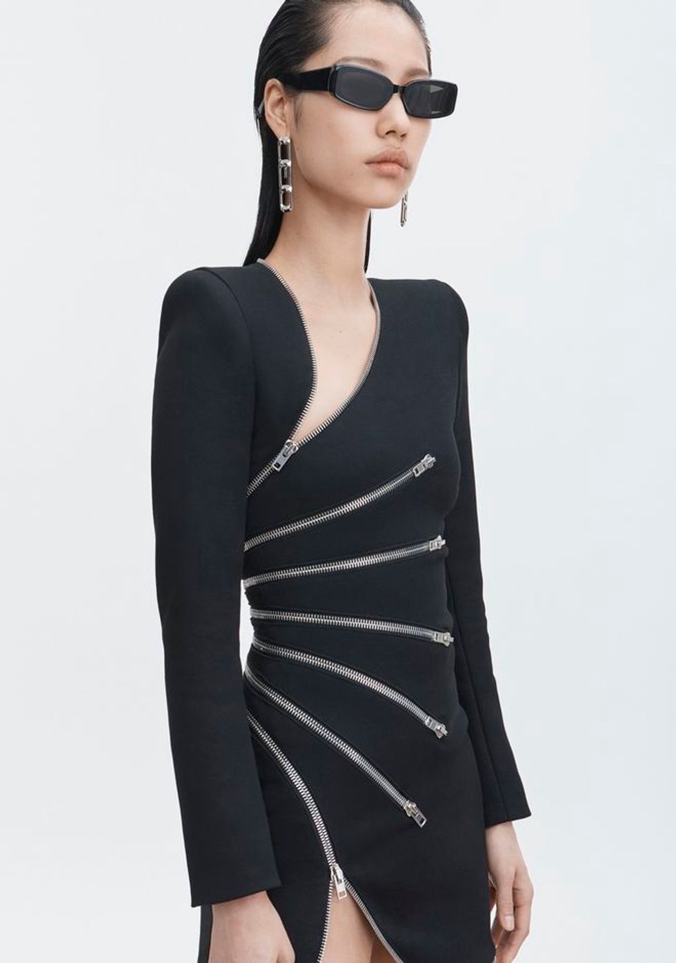 Boasting an asymmetrical neckline and hemline, the dress is accented by zippers that fan out from the right side of the waist. It's classic with an update, and originally debuted during Wang's Fall 2018 runway show, where he transformed Condé Nast's former office at 4 Times Square into a fluorescent cubicle-filled catwalk.