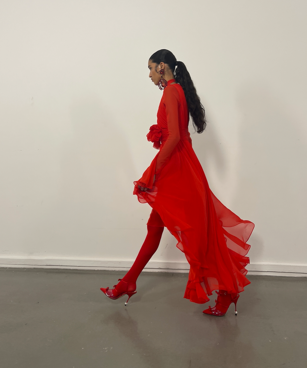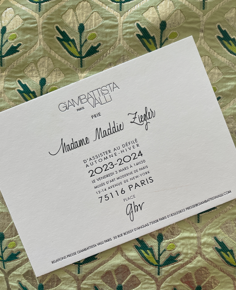 To give us a glimpse of what a typical day looks like at Paris Fashion Week, Ziegler took PAPER behind the scenes for the Giambattista Valli show, a brand known for its feminine, feathered frocks and candy-colored tulle confections. (She called her mint green, scalloped look for the show "chic Tinkerbell.")