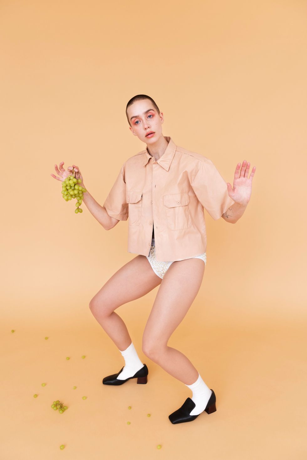 I'm working on about 20 original songs right now. I'm really trying to level up and hone my production game while nailing down a cohesive sound. I'll also be putting out a collaborative A-side / B-side soon. It's kind of heavy but addresses my darkest inner life in a very silly way. As far as fashion goes, I recently did a collaboration with non-binary label Official Rebrand and we're going to be putting out an original tee soon. I'm stupid excited about that. I've also been lucky enough to work with some incredible creative minds on upcoming projects — jewelry designer Paige Cheyne, creative director/photographer May Daniels, and my BFF who can do literally everything (seriously everything, go hire him now) Tanner Williams.