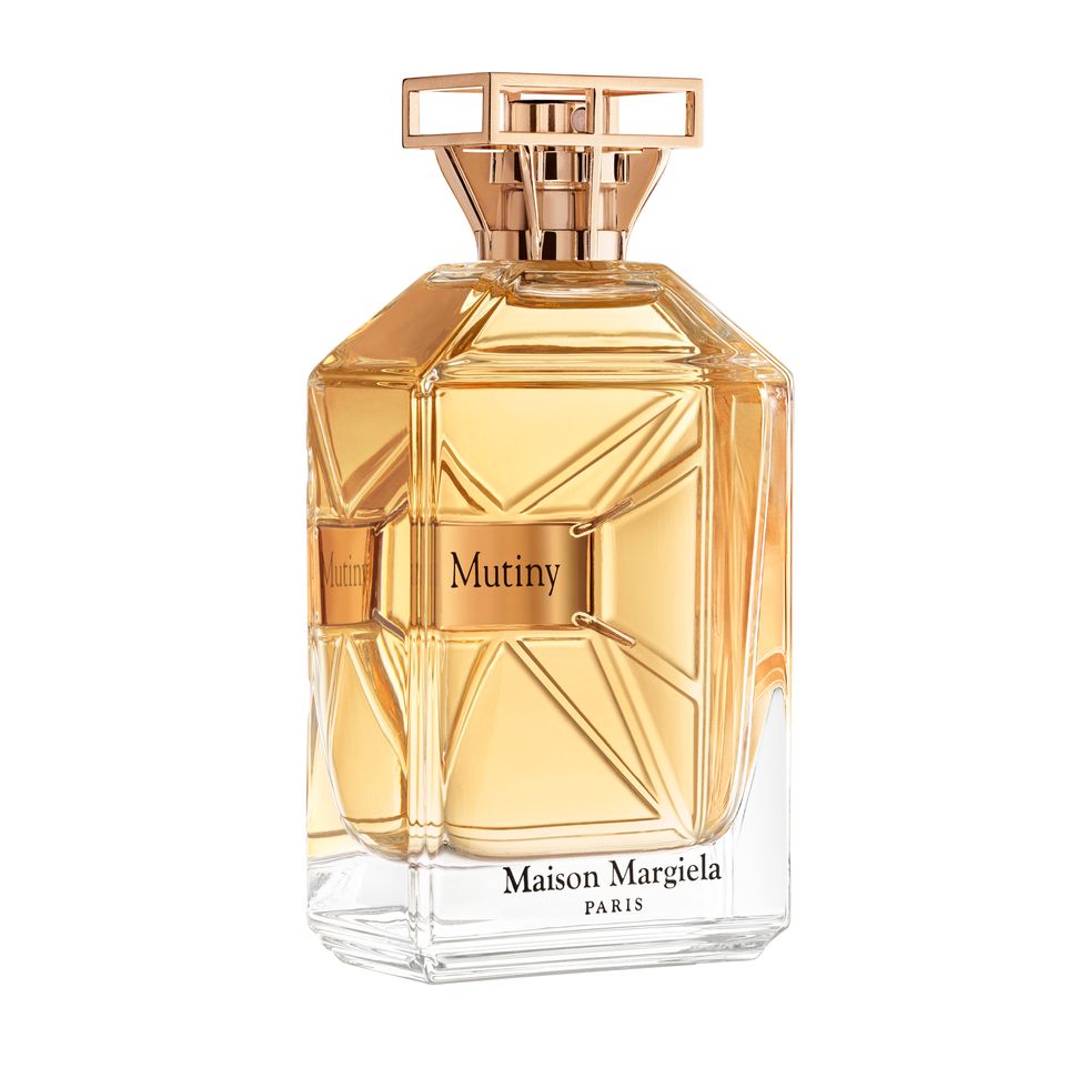 "Mutiny embraces the rejection of pre-ordained classifications," Galliano states toward the end of his address. Like the fragrance's ambassadors, its bottle also bucks the cookie-cutter mold. In keeping with Margiela's tradition of de and re construction, a gilded cap is stripped down to a frame and the label is inverted, visible through the back of the facetted bottle.