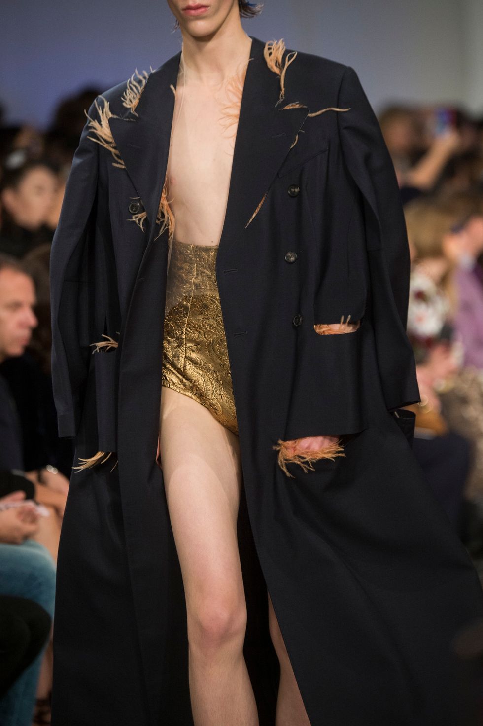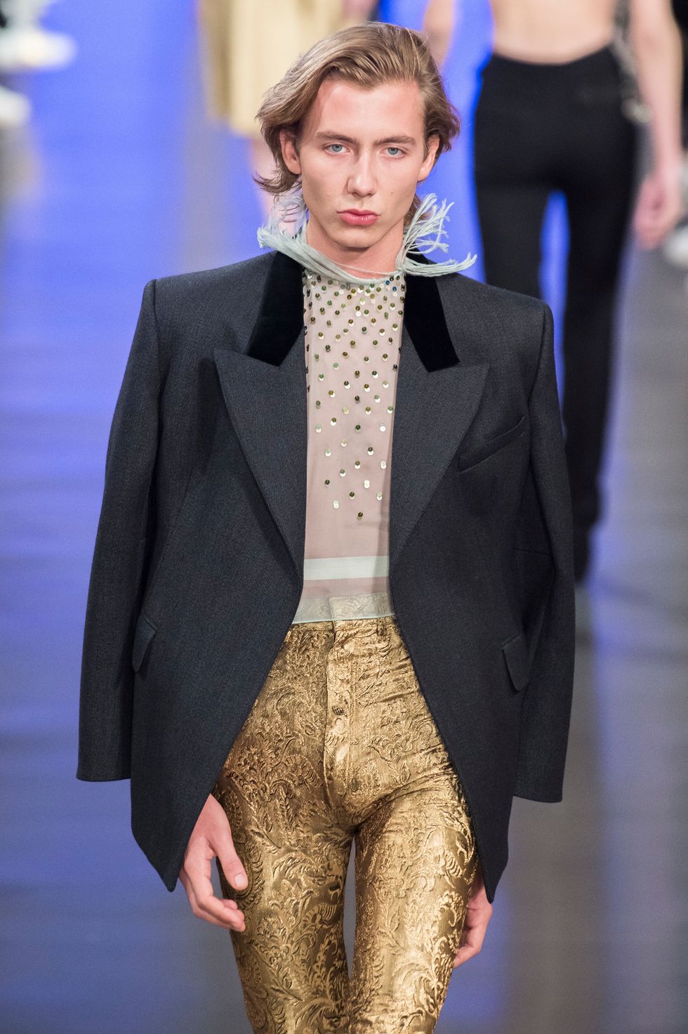Margiela's catwalk was full of extravagant slits, slips, and tailoring, but it was a tuft of feathers that left us breathless. Tucked into gold jacquard trousers and a black velvet jacket, the aqua mint top embroidered in sequins and feather trim left model Paul Hameline looking like the regal fairy prince of our dreams.