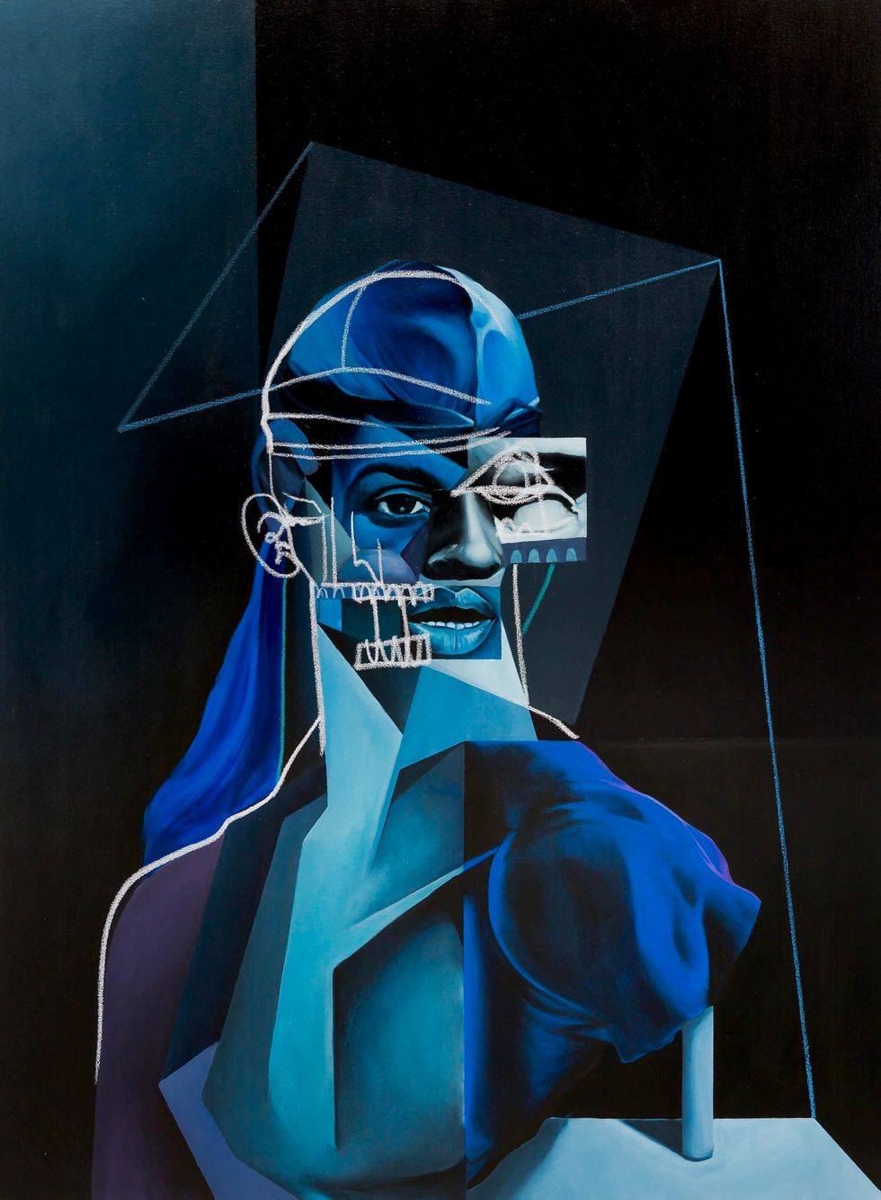 Roberts culled inspiration from Pablo Picasso's mental state and middle-class angst depicted during his iconic Blue Period — as well as his own (and his community's) experiences as a young Black man in America navigating the everyday tensions of systemic oppression and institutional racism. In doing so, the moody portrait and landscape paintings comprising Blk & Blue examine the conditions responsible for said hardship affecting Black and brown people, and illuminate the mental health consequences made manifest by generational trauma, including PTSD, anxiety, depression, and bipolar disorder. And like Picasso, Roberts felt called to explore these themes using shades of blue and grey, with symbolic splashes of color.