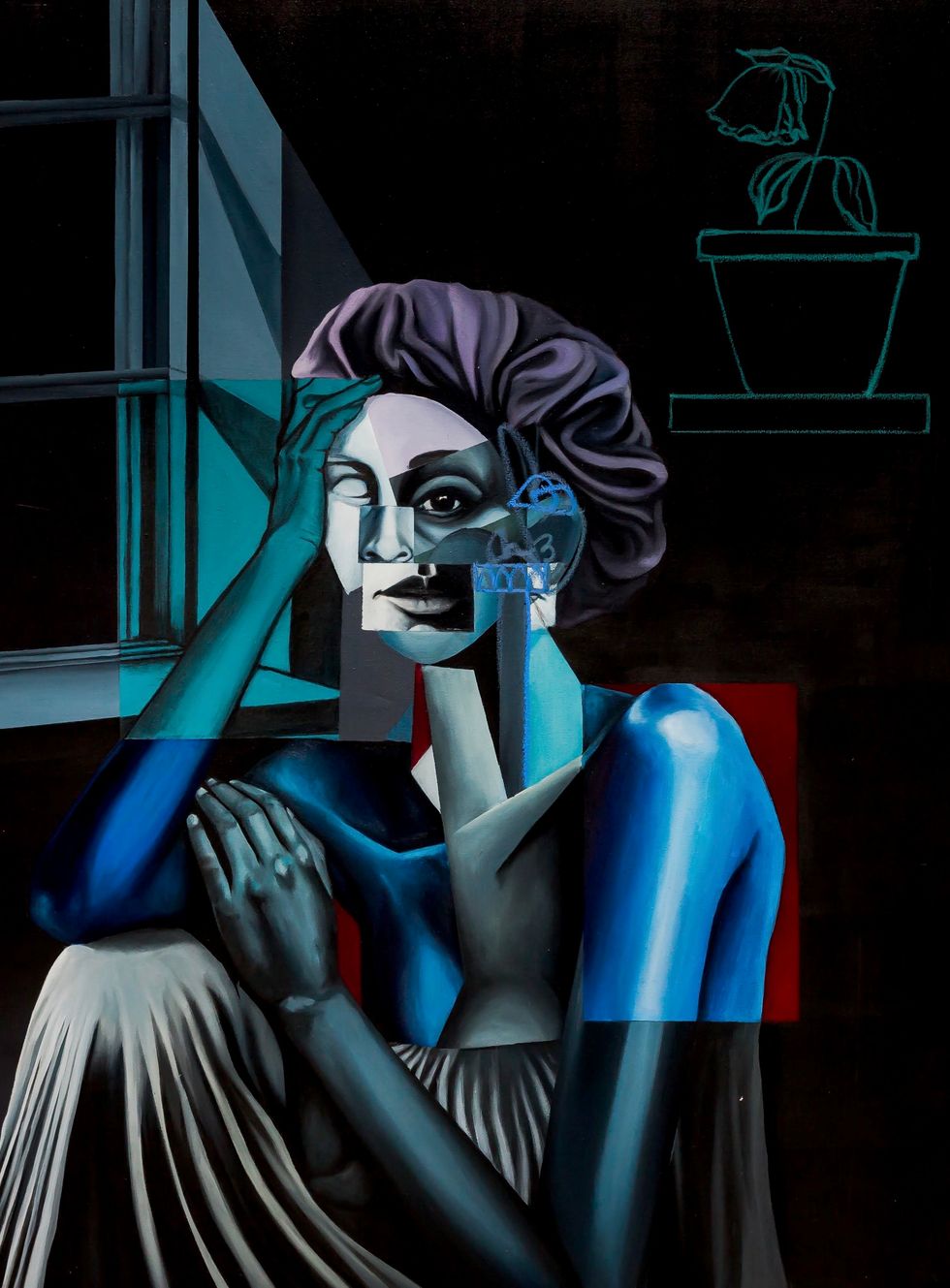 Roberts culled inspiration from Pablo Picasso's mental state and middle-class angst depicted during his iconic Blue Period — as well as his own (and his community's) experiences as a young Black man in America navigating the everyday tensions of systemic oppression and institutional racism. In doing so, the moody portrait and landscape paintings comprising Blk & Blue examine the conditions responsible for said hardship affecting Black and brown people, and illuminate the mental health consequences made manifest by generational trauma, including PTSD, anxiety, depression, and bipolar disorder. And like Picasso, Roberts felt called to explore these themes using shades of blue and grey, with symbolic splashes of color.