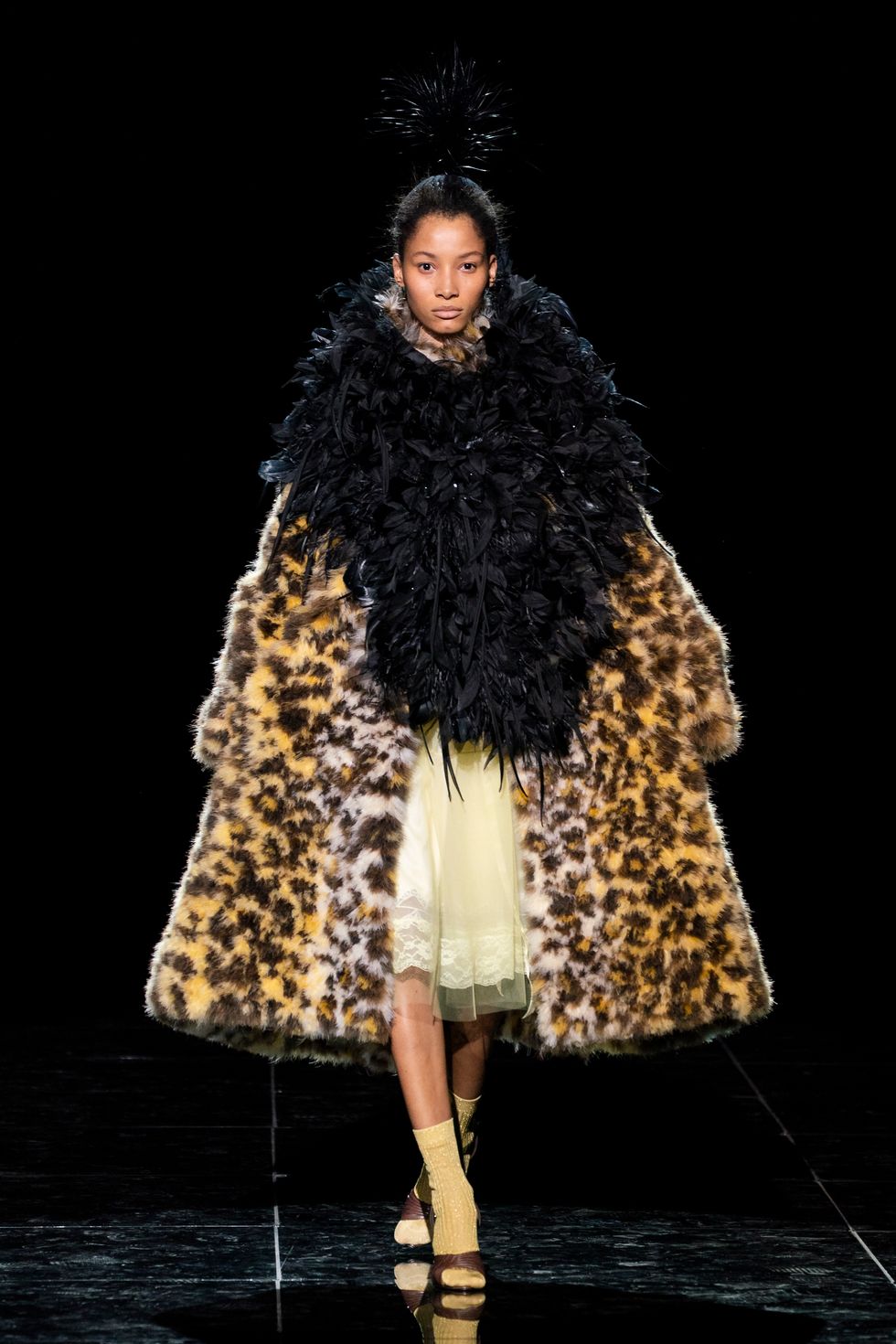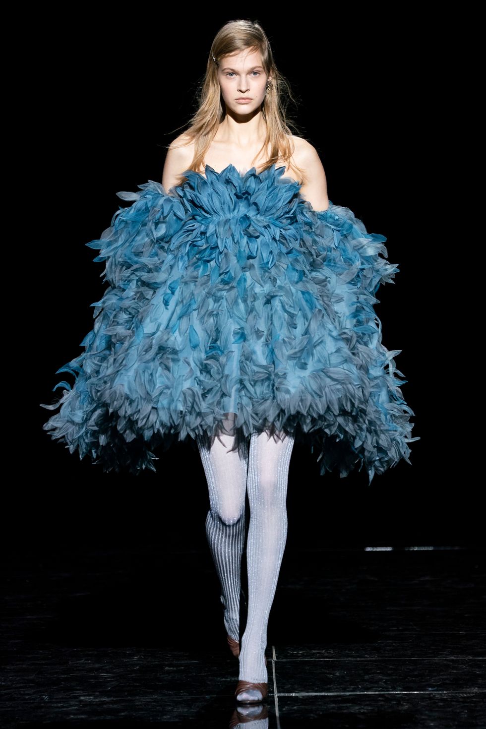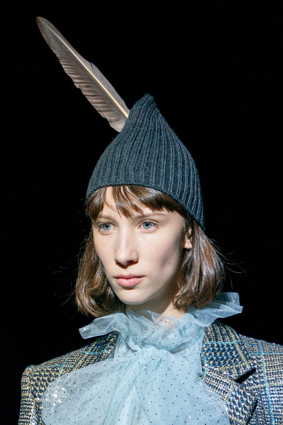 The most stunning pieces of the collection were the feathered frocks, coats and more. Christy Turlington (who also walked in the designer's aforementioned grunge collection) closed the show wearing a structured gown covered in almost metallic black feathers. A mini version of the same dress also came in cornflower blue, and a sequin cape with feathers was a textural dream.