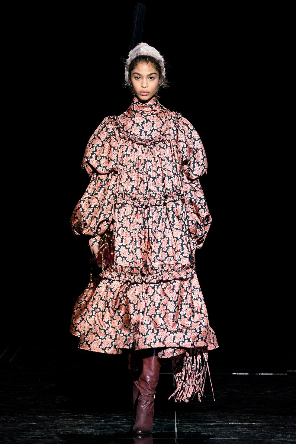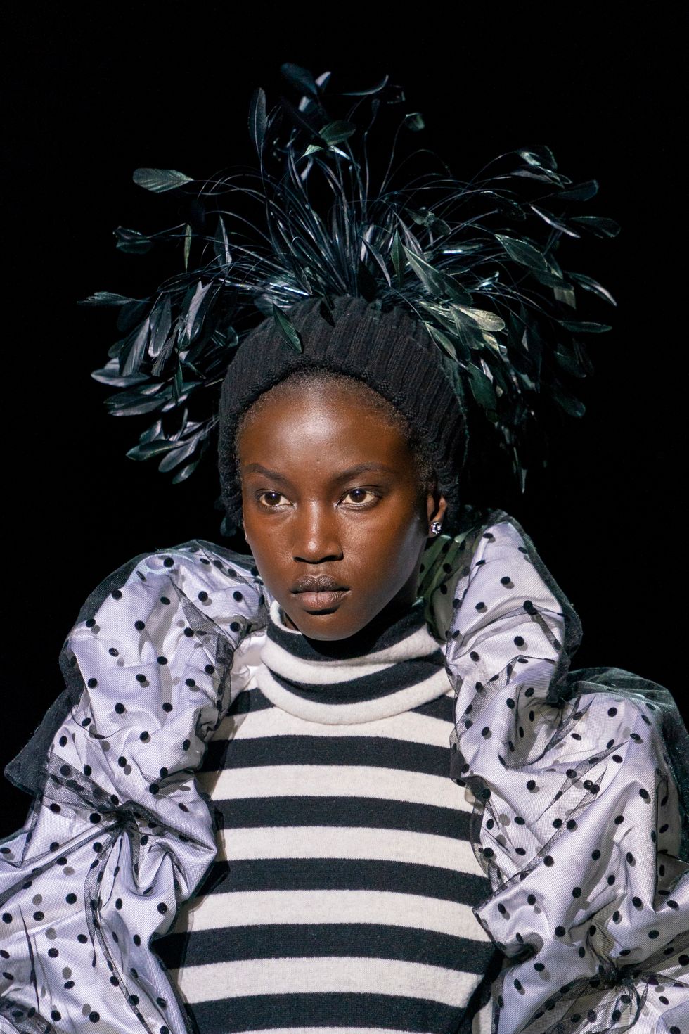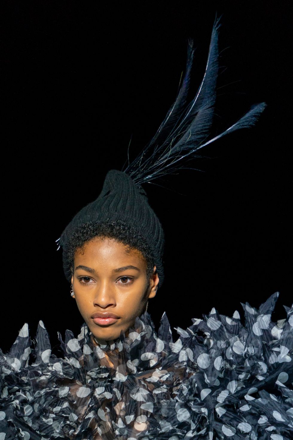 Almost every single model's head was topped with a Stephen Jones millinery creation. Slim cut beanies were a striking contrast to the glamorous outfits (and a welcome reference to Jacobs' iconic grunge collection done 25 years ago for Perry Ellis, which he recently rereleased in the form of a capsule collection). Some of the knitted hats matched the clothing and most of them were covered in feathers.