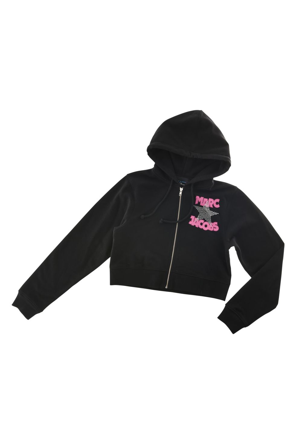 Among the pieces are a giant diamanté tee, baby tee, short shorts, a ruched slip dress with lace, a cropped zip up hoodie and a pants set. Additionally, a Marc Jacobs handbag from her personal archive was recreated in black and hot pink. The small leather shoulder bag has a chain strap and charms that spell Marc Jacobs, and the chain can be removed to be worn as a necklace.