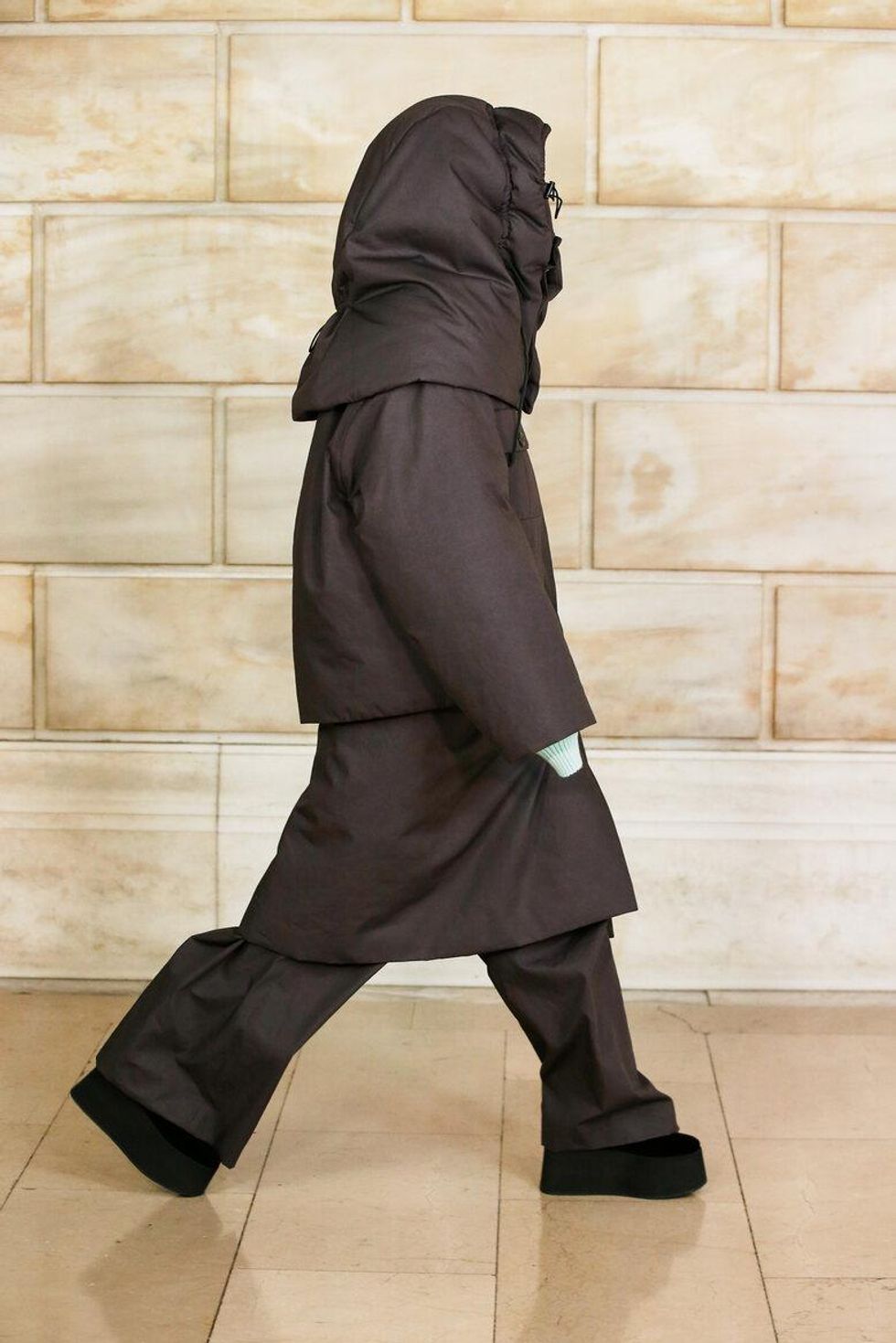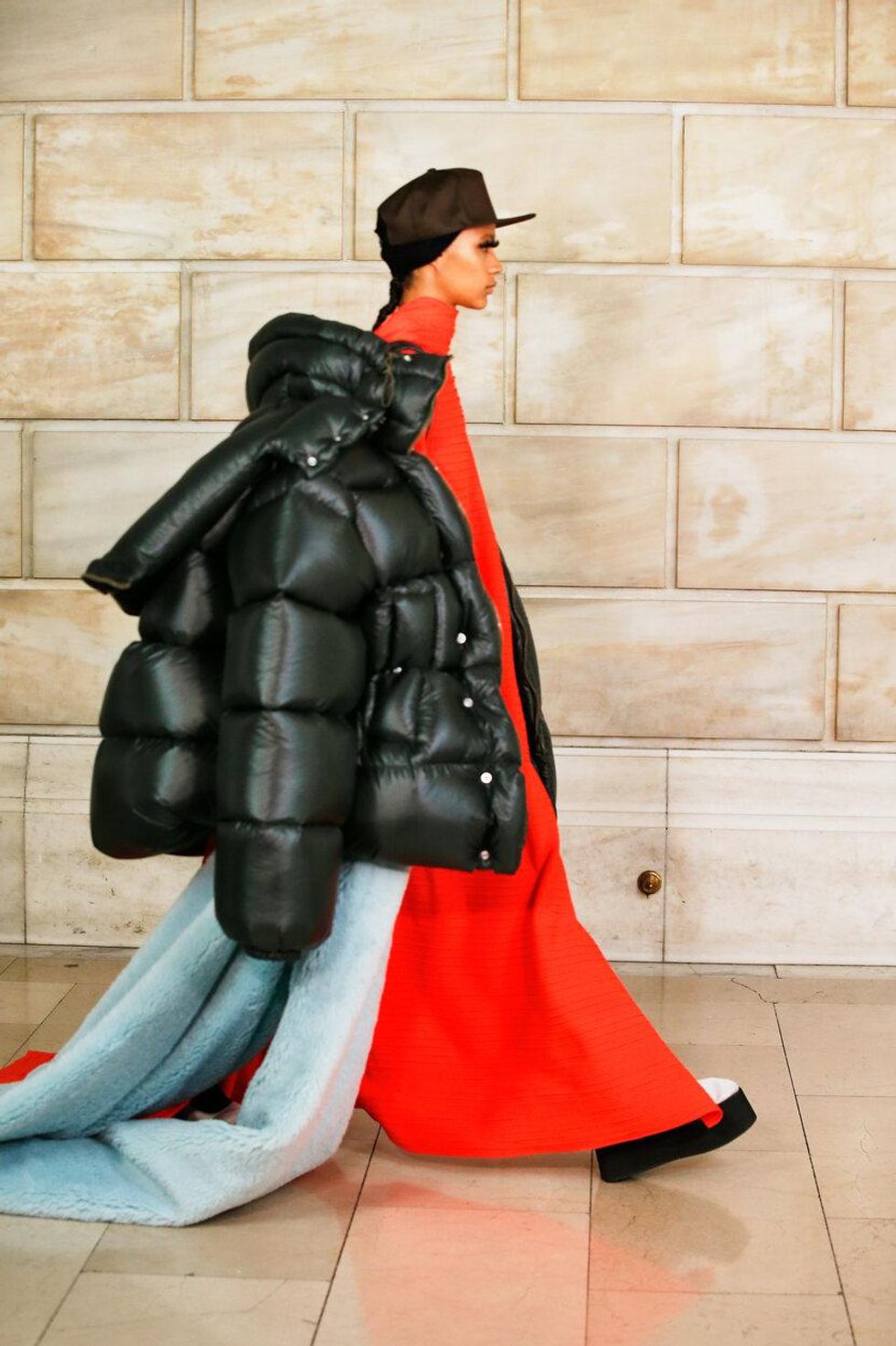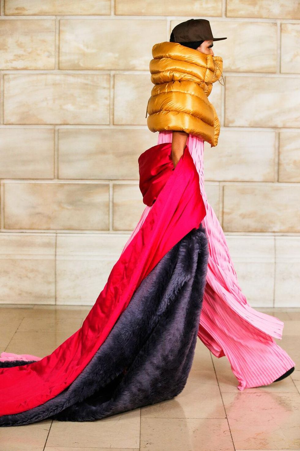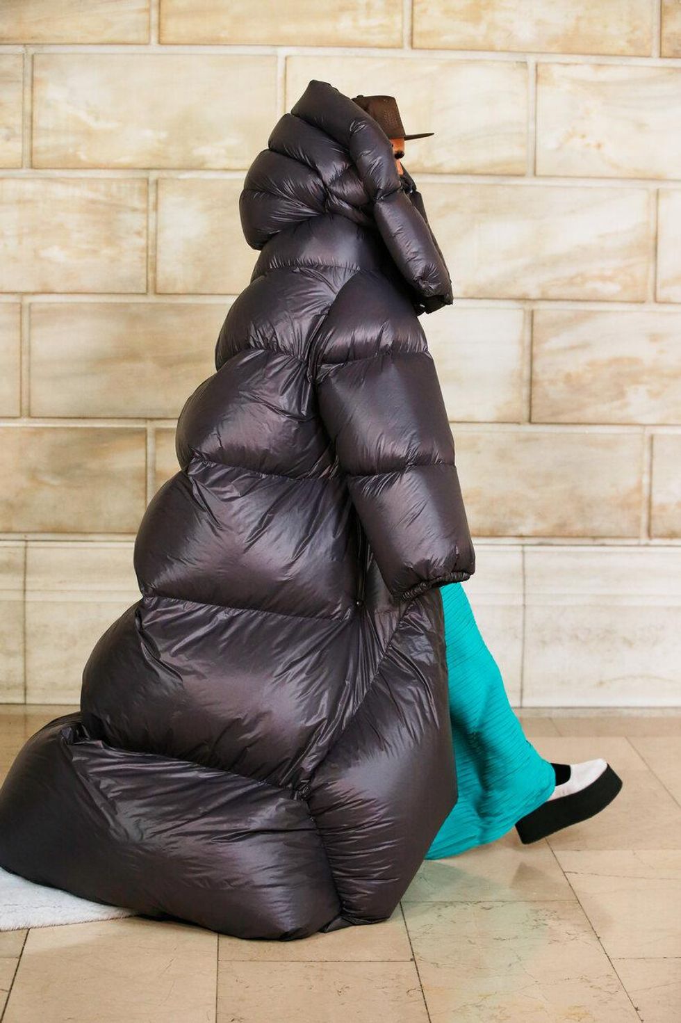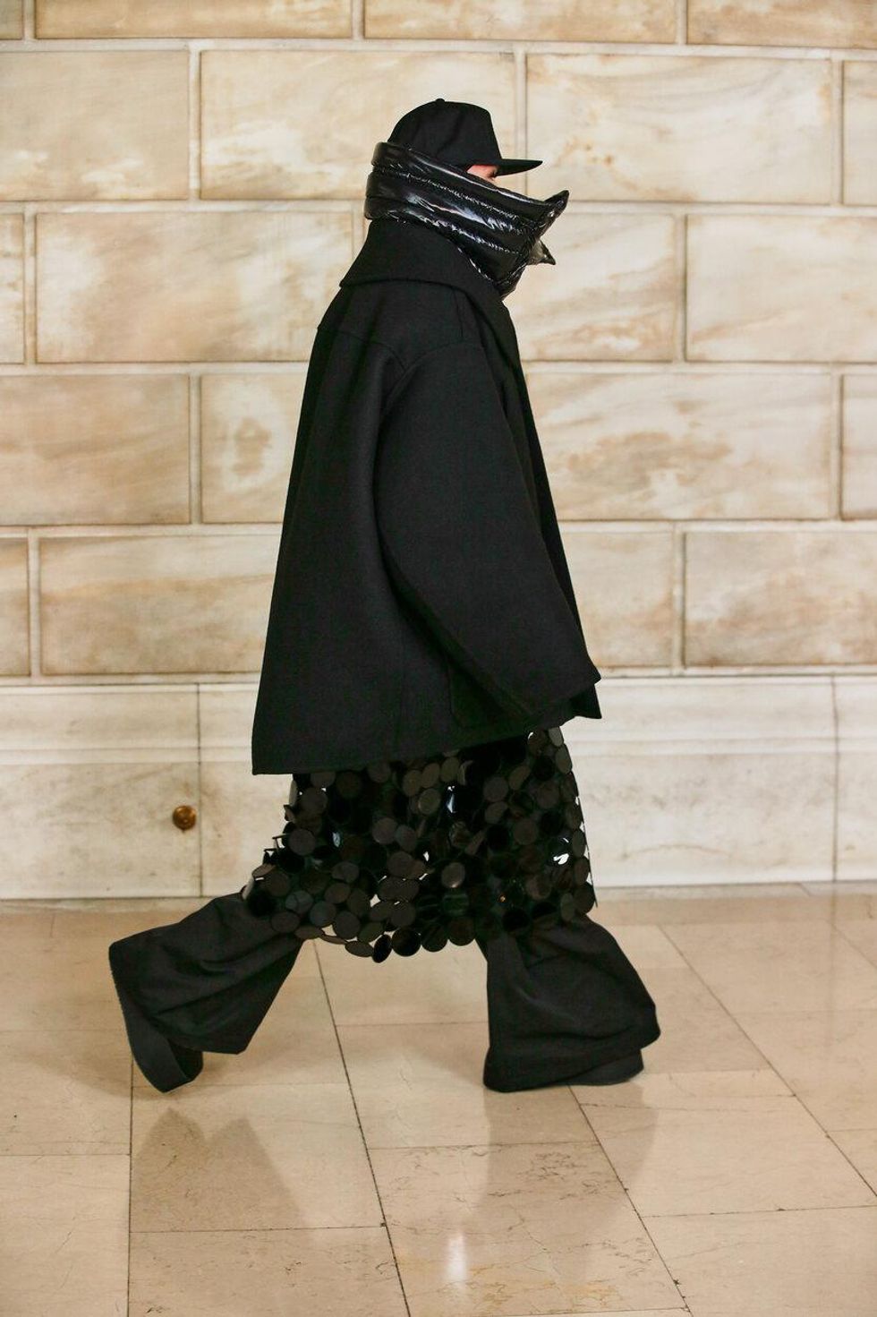 There were 70 looks in total, with the official runway photographs taken from the side of the models rather than the front, perhaps to showcase the depth and unique proportions of the clothes, which featured long trains, sweeping coats, roomy puffers, giant platforms, colorful paillettes and graphic logos. See the full collection, below.
