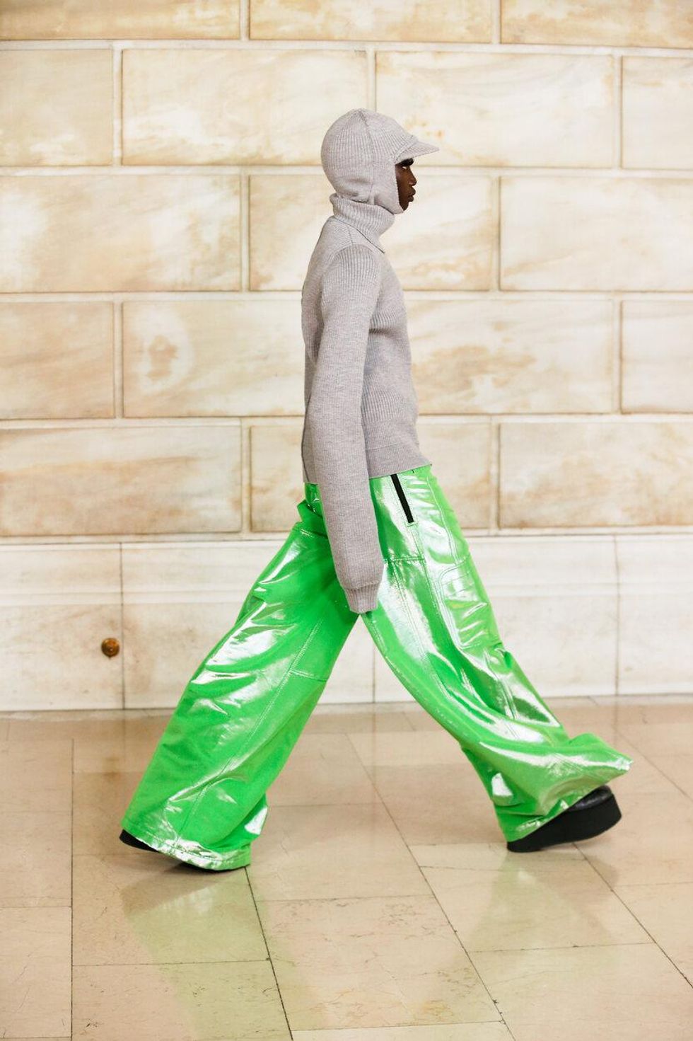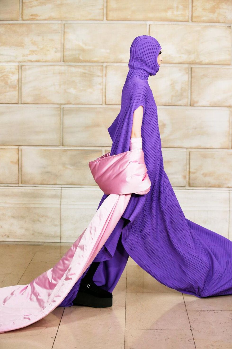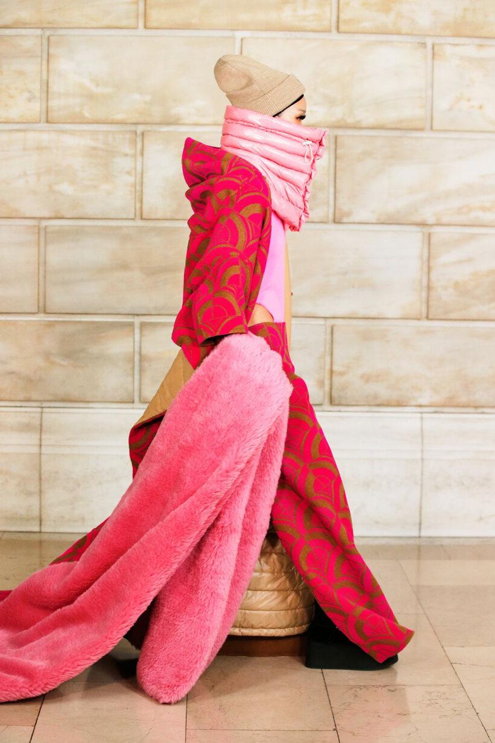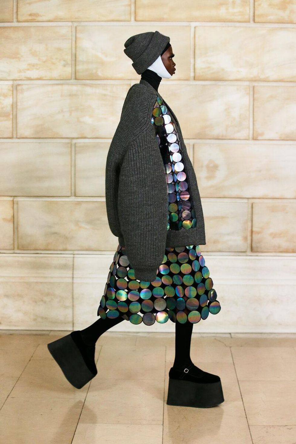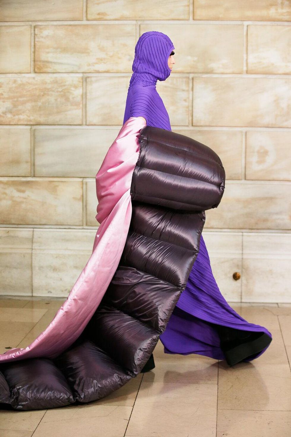 There were 70 looks in total, with the official runway photographs taken from the side of the models rather than the front, perhaps to showcase the depth and unique proportions of the clothes, which featured long trains, sweeping coats, roomy puffers, giant platforms, colorful paillettes and graphic logos. See the full collection, below.