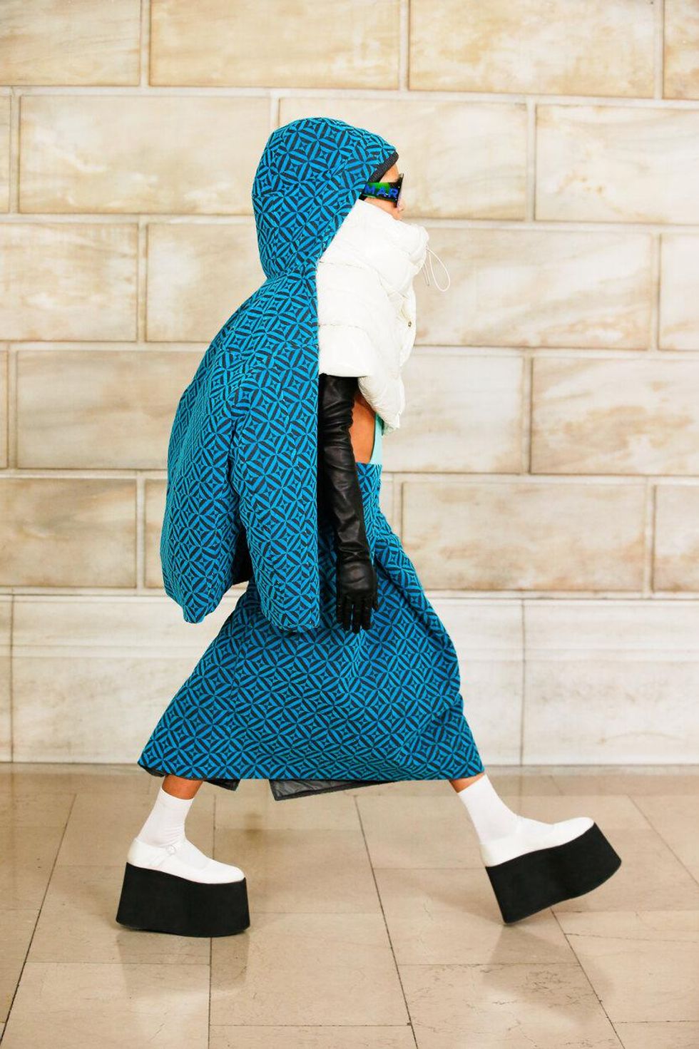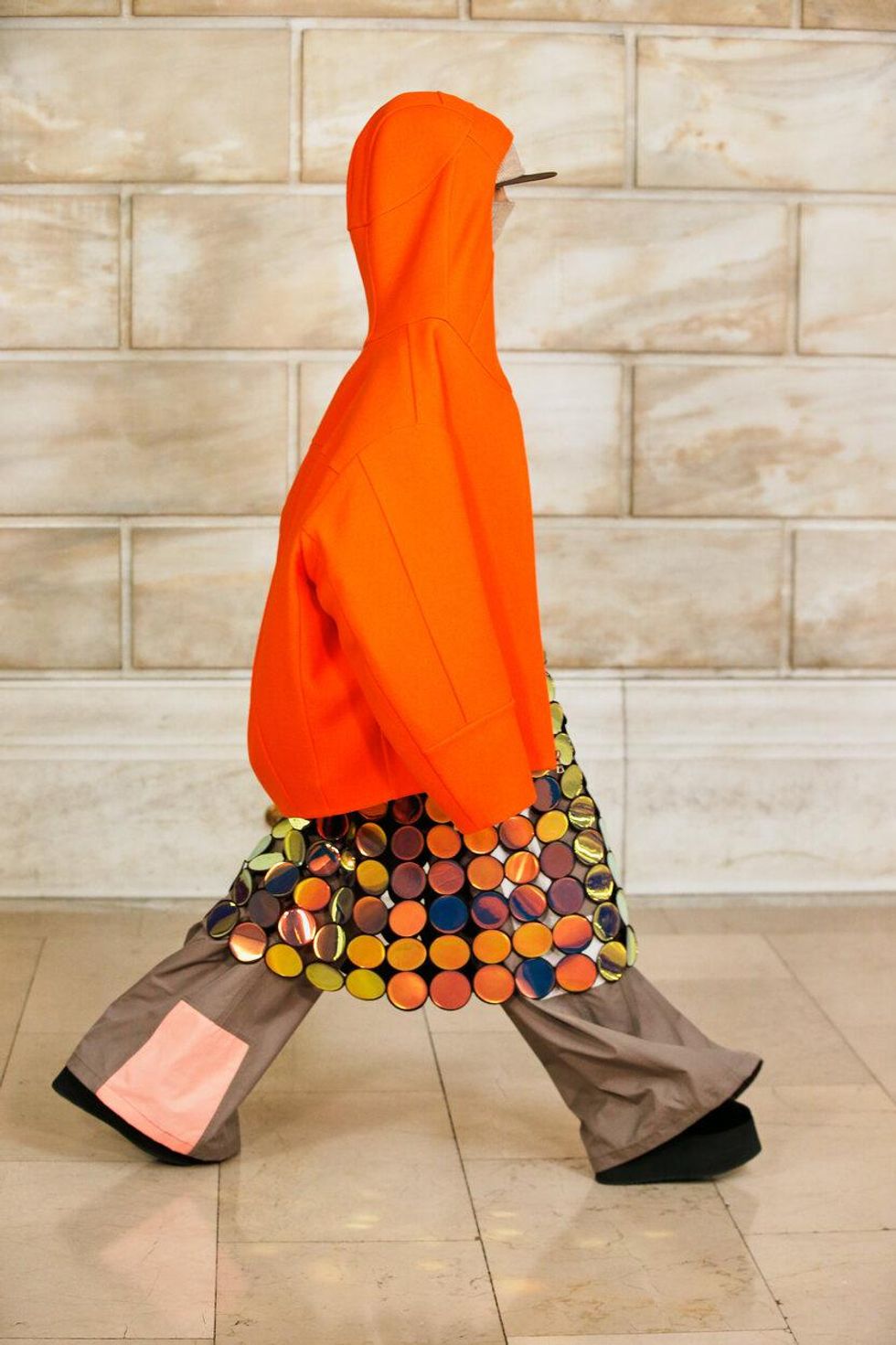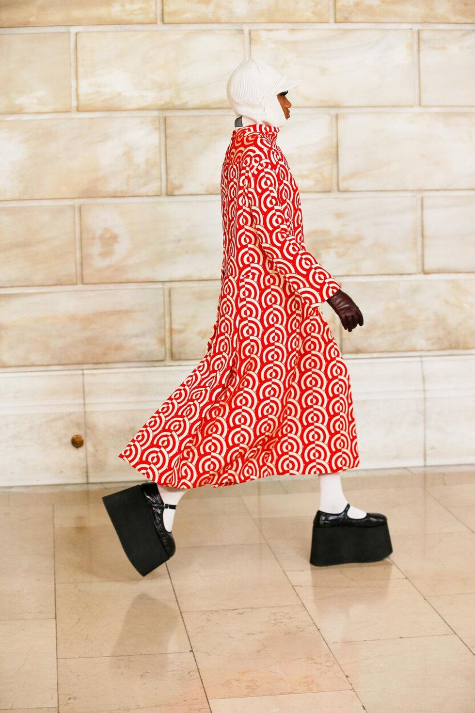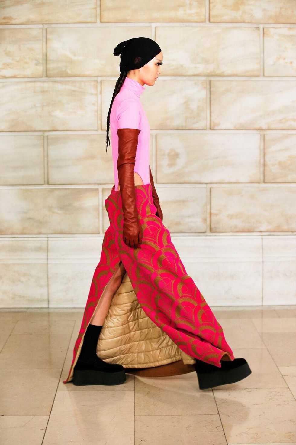 There were 70 looks in total, with the official runway photographs taken from the side of the models rather than the front, perhaps to showcase the depth and unique proportions of the clothes, which featured long trains, sweeping coats, roomy puffers, giant platforms, colorful paillettes and graphic logos. See the full collection, below.
