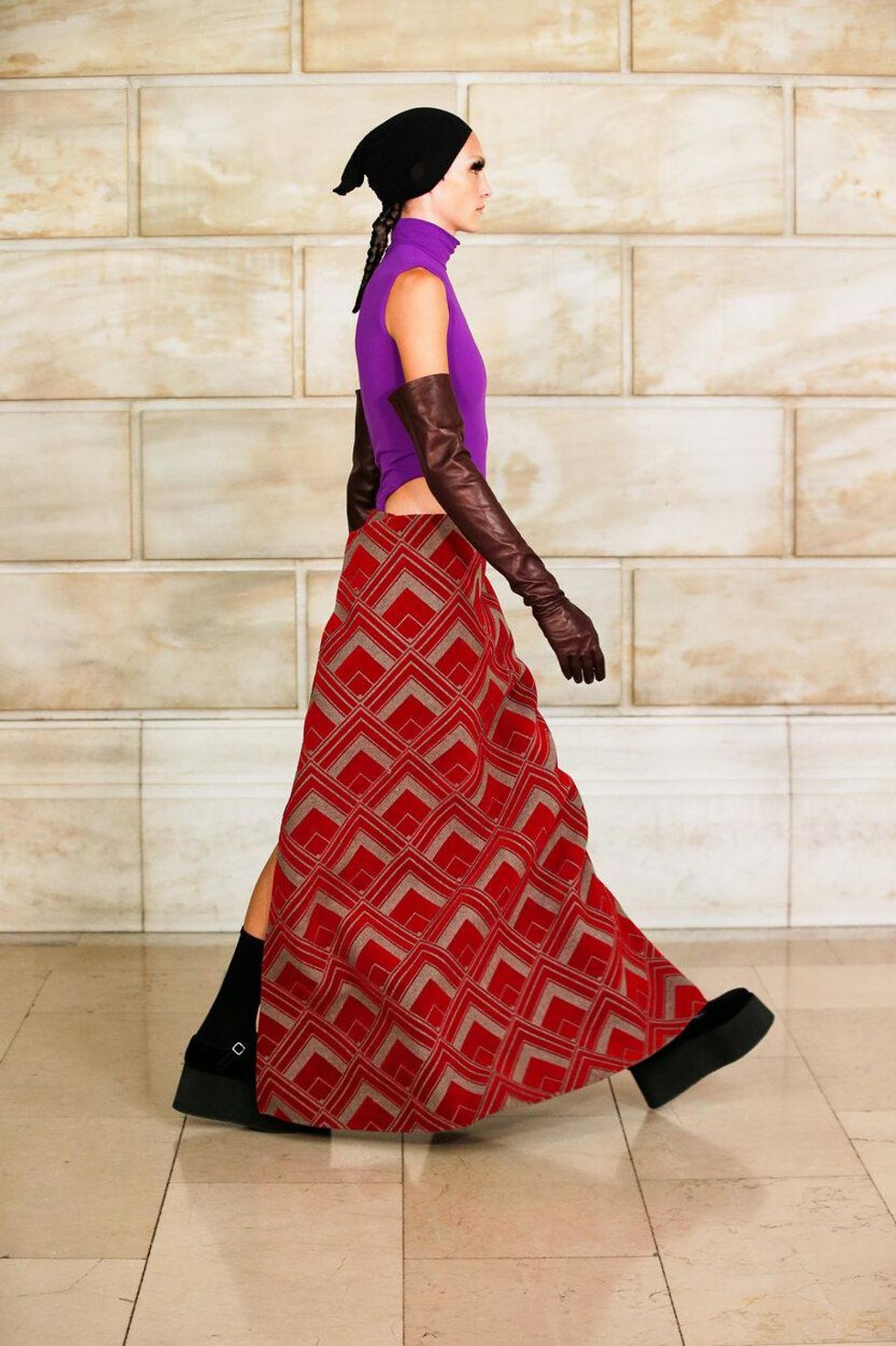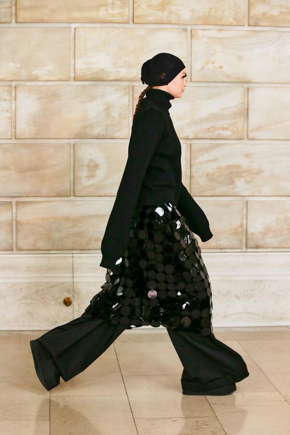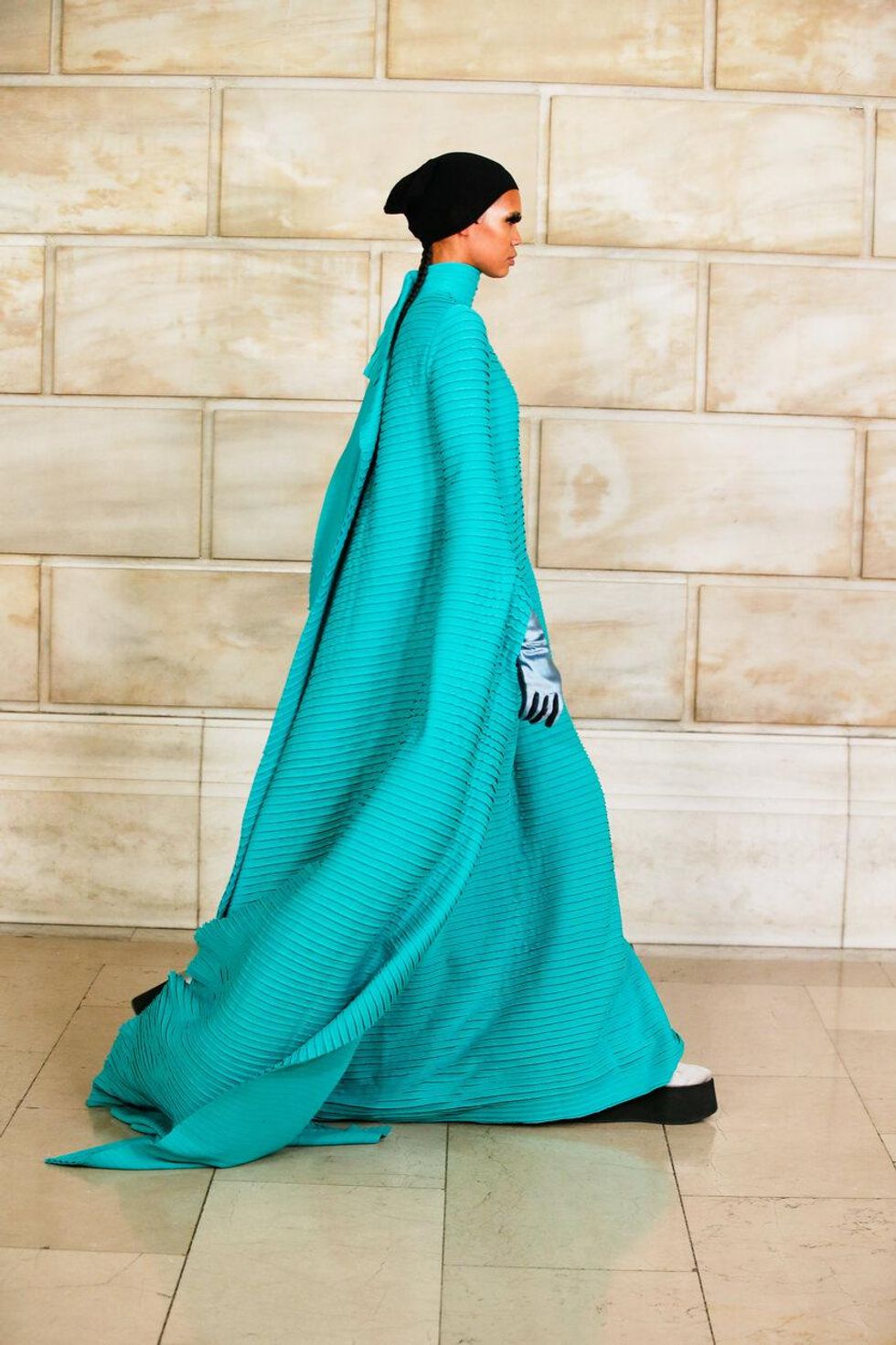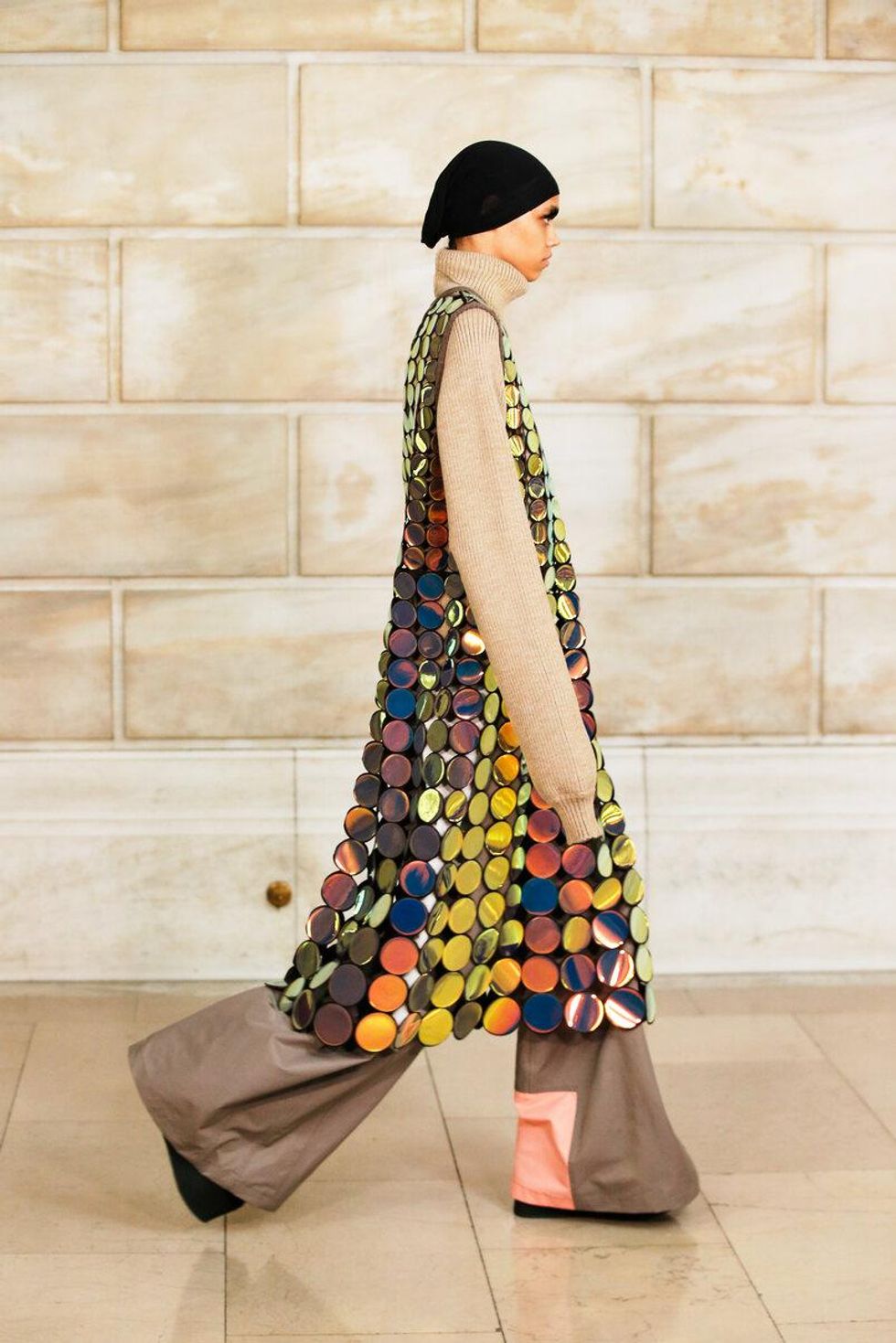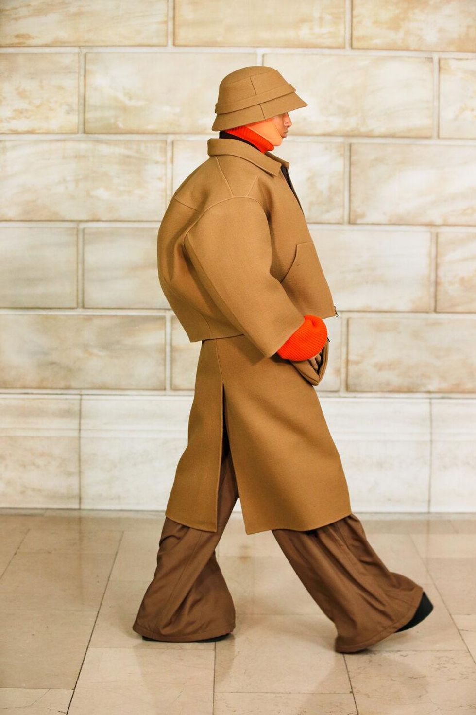 There were 70 looks in total, with the official runway photographs taken from the side of the models rather than the front, perhaps to showcase the depth and unique proportions of the clothes, which featured long trains, sweeping coats, roomy puffers, giant platforms, colorful paillettes and graphic logos. See the full collection, below.
