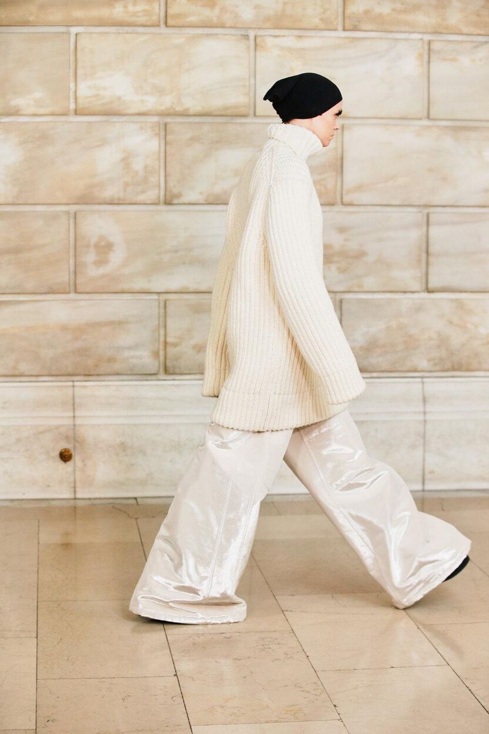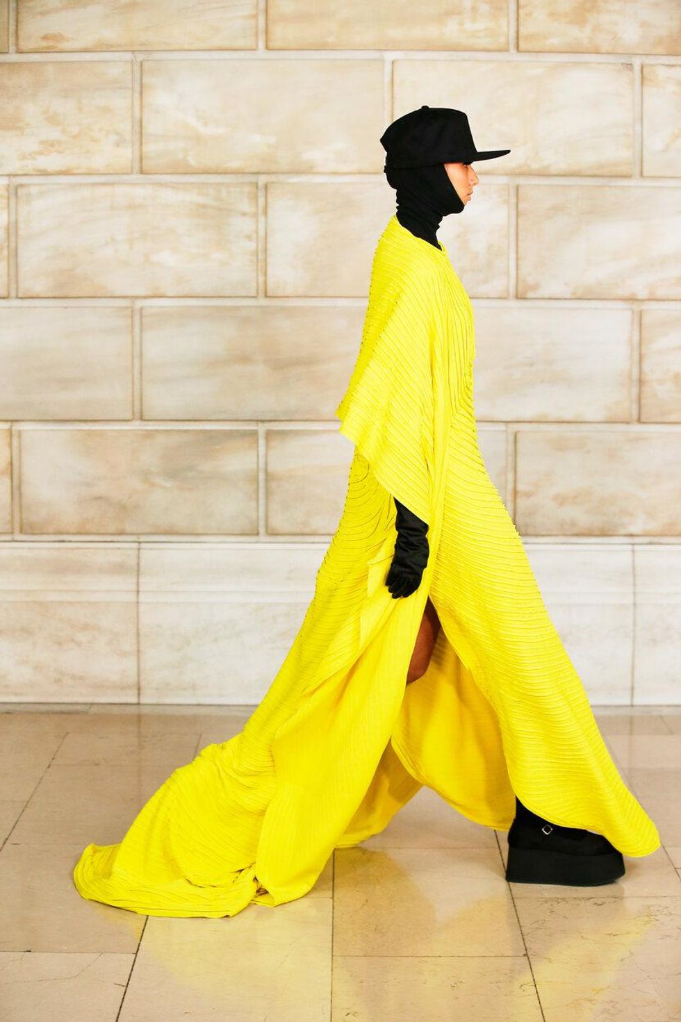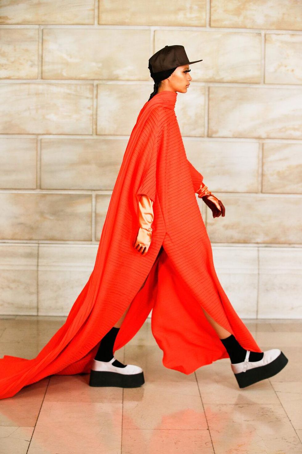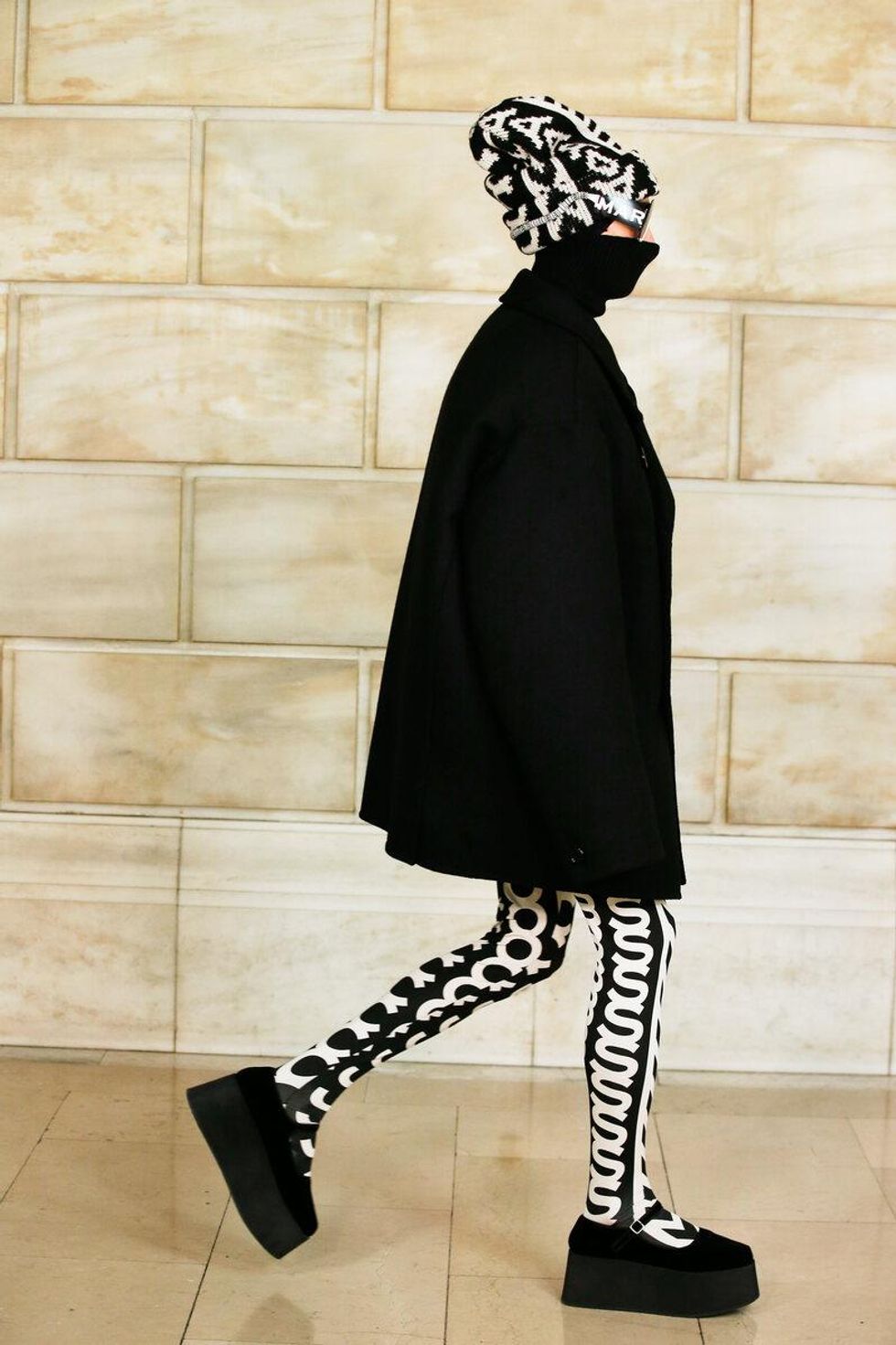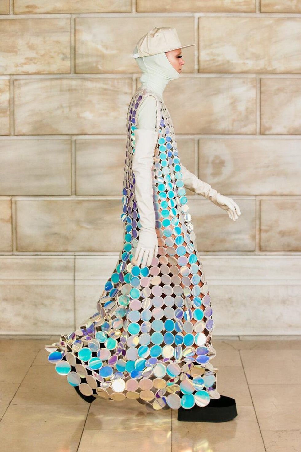 There were 70 looks in total, with the official runway photographs taken from the side of the models rather than the front, perhaps to showcase the depth and unique proportions of the clothes, which featured long trains, sweeping coats, roomy puffers, giant platforms, colorful paillettes and graphic logos. See the full collection, below.