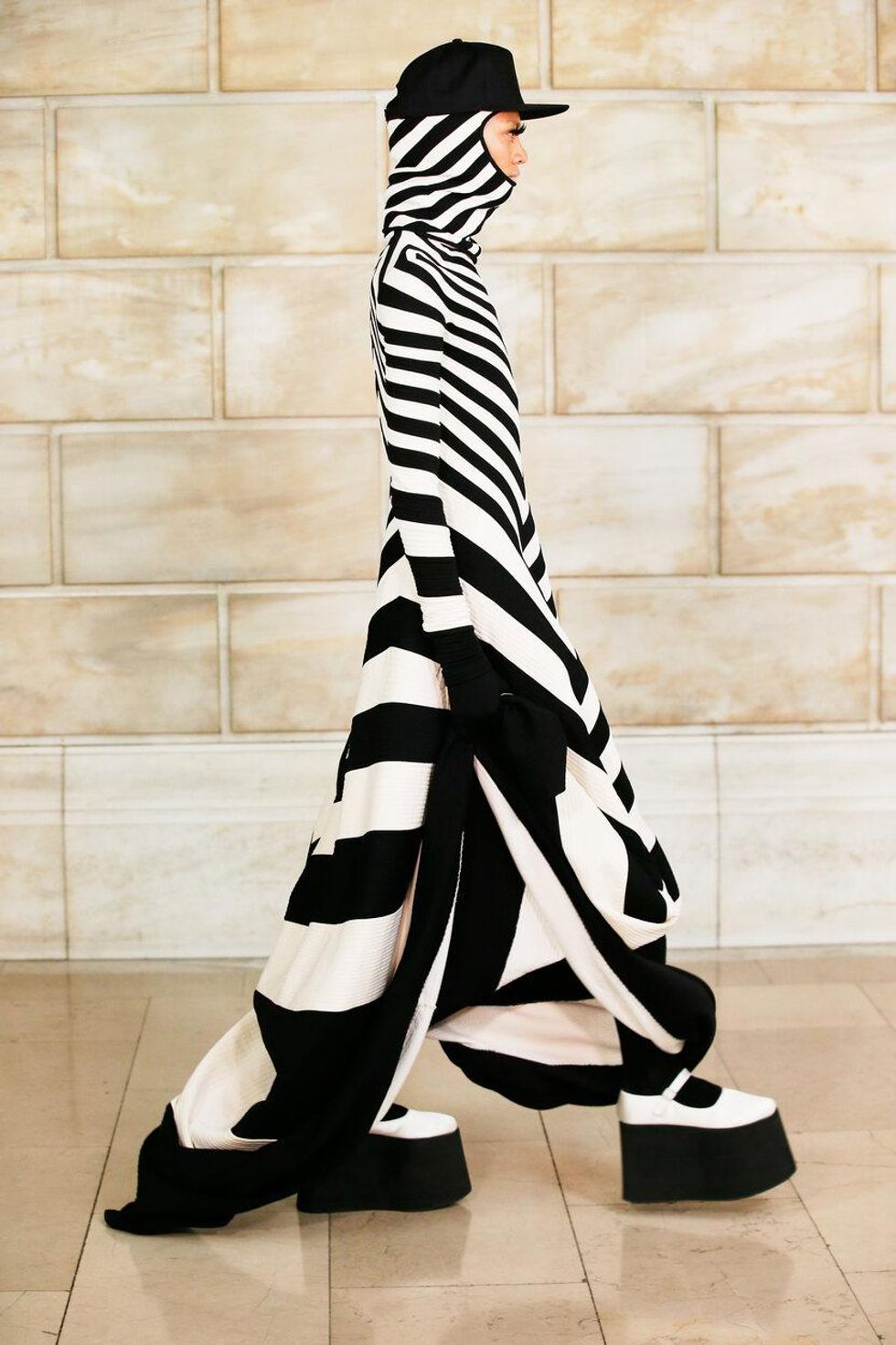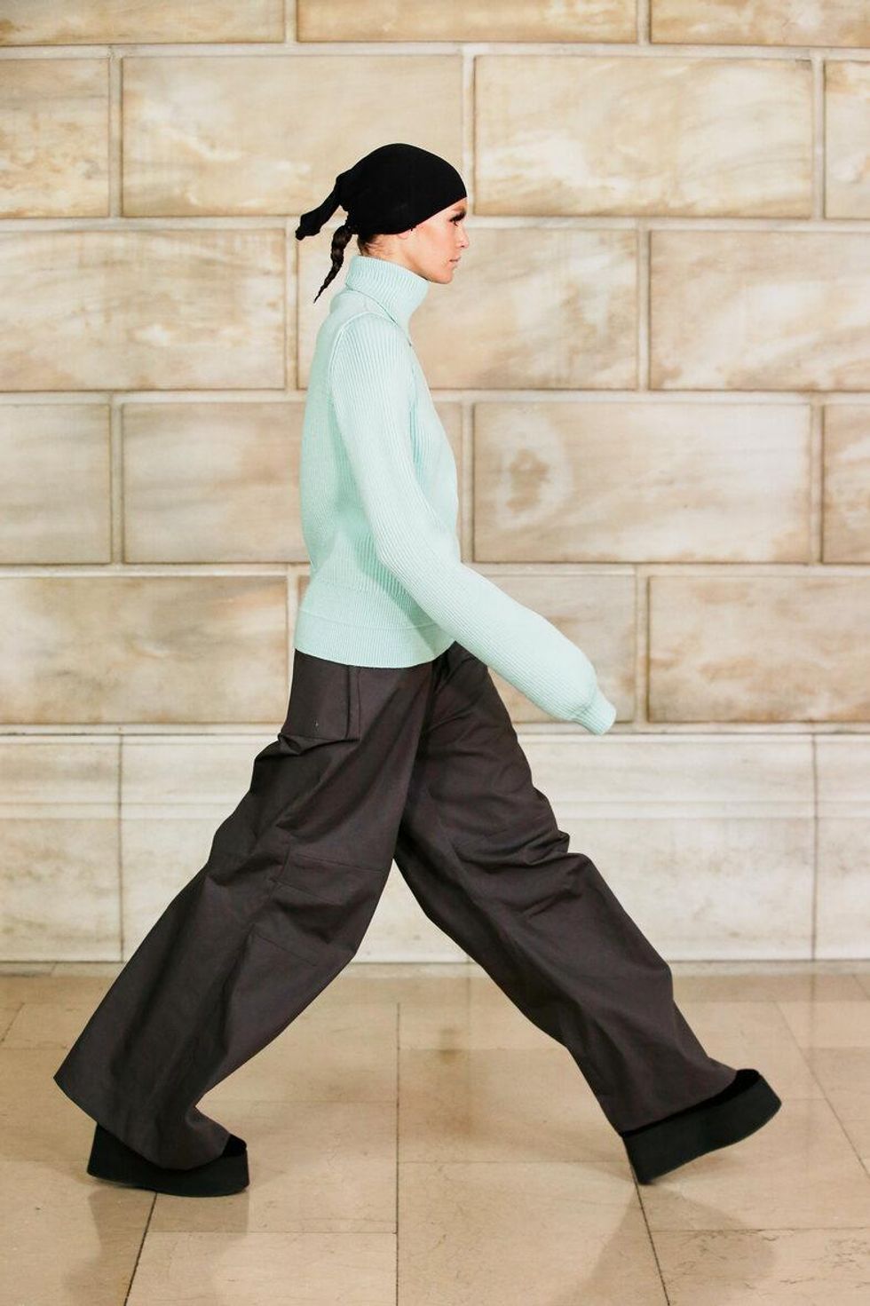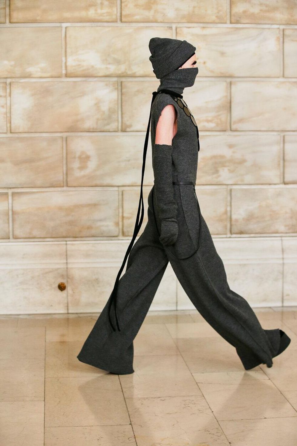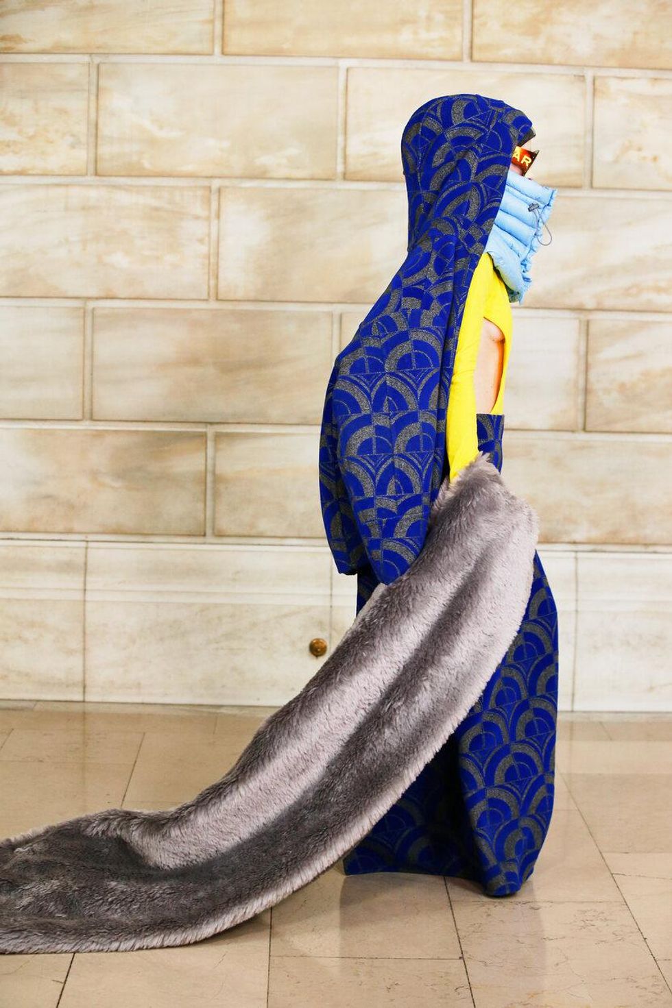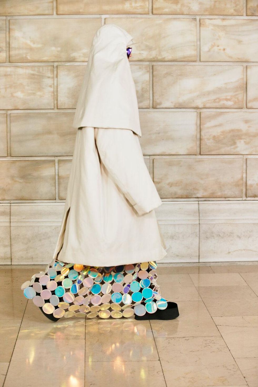 There were 70 looks in total, with the official runway photographs taken from the side of the models rather than the front, perhaps to showcase the depth and unique proportions of the clothes, which featured long trains, sweeping coats, roomy puffers, giant platforms, colorful paillettes and graphic logos. See the full collection, below.