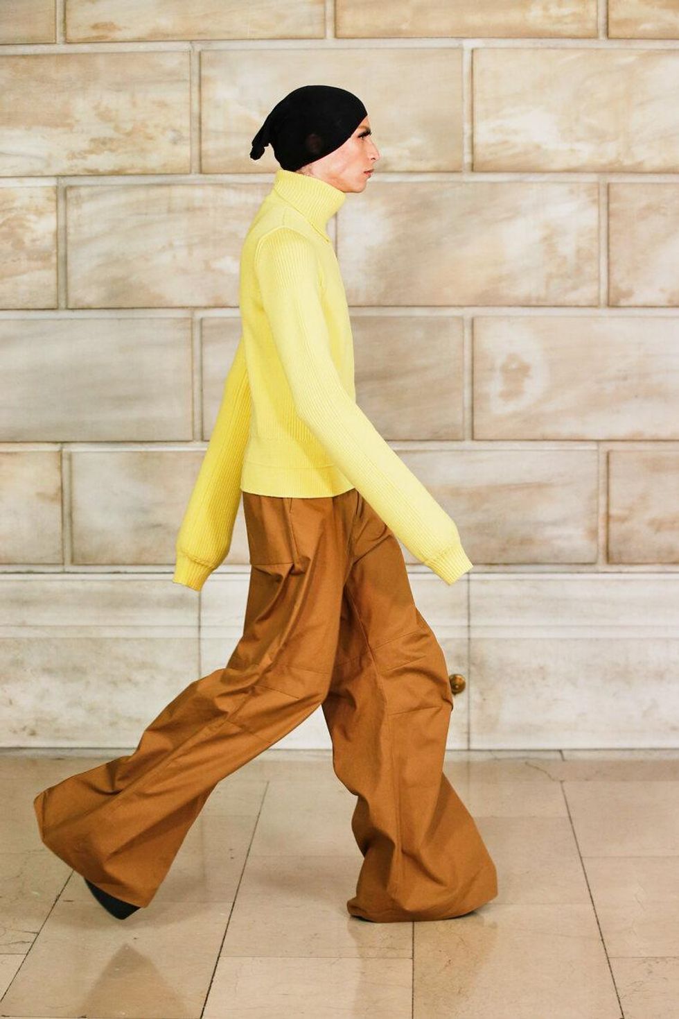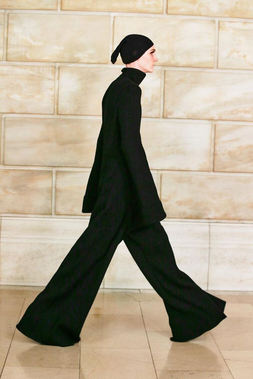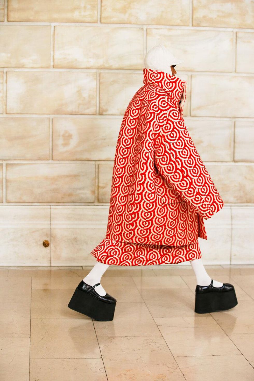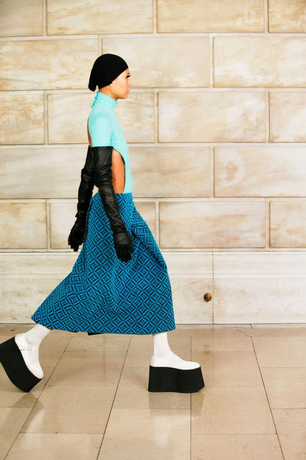 There were 70 looks in total, with the official runway photographs taken from the side of the models rather than the front, perhaps to showcase the depth and unique proportions of the clothes, which featured long trains, sweeping coats, roomy puffers, giant platforms, colorful paillettes and graphic logos. See the full collection, below.