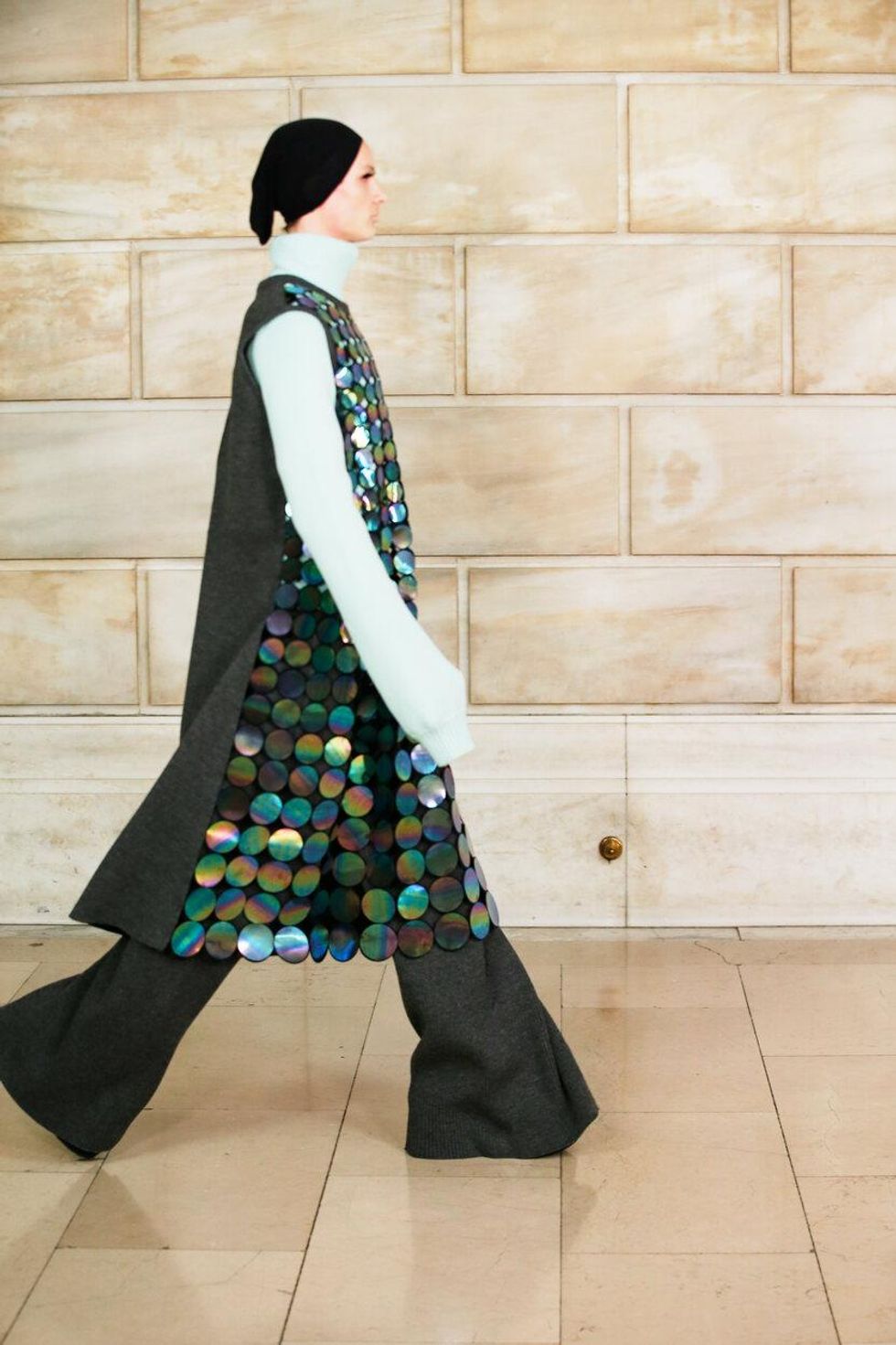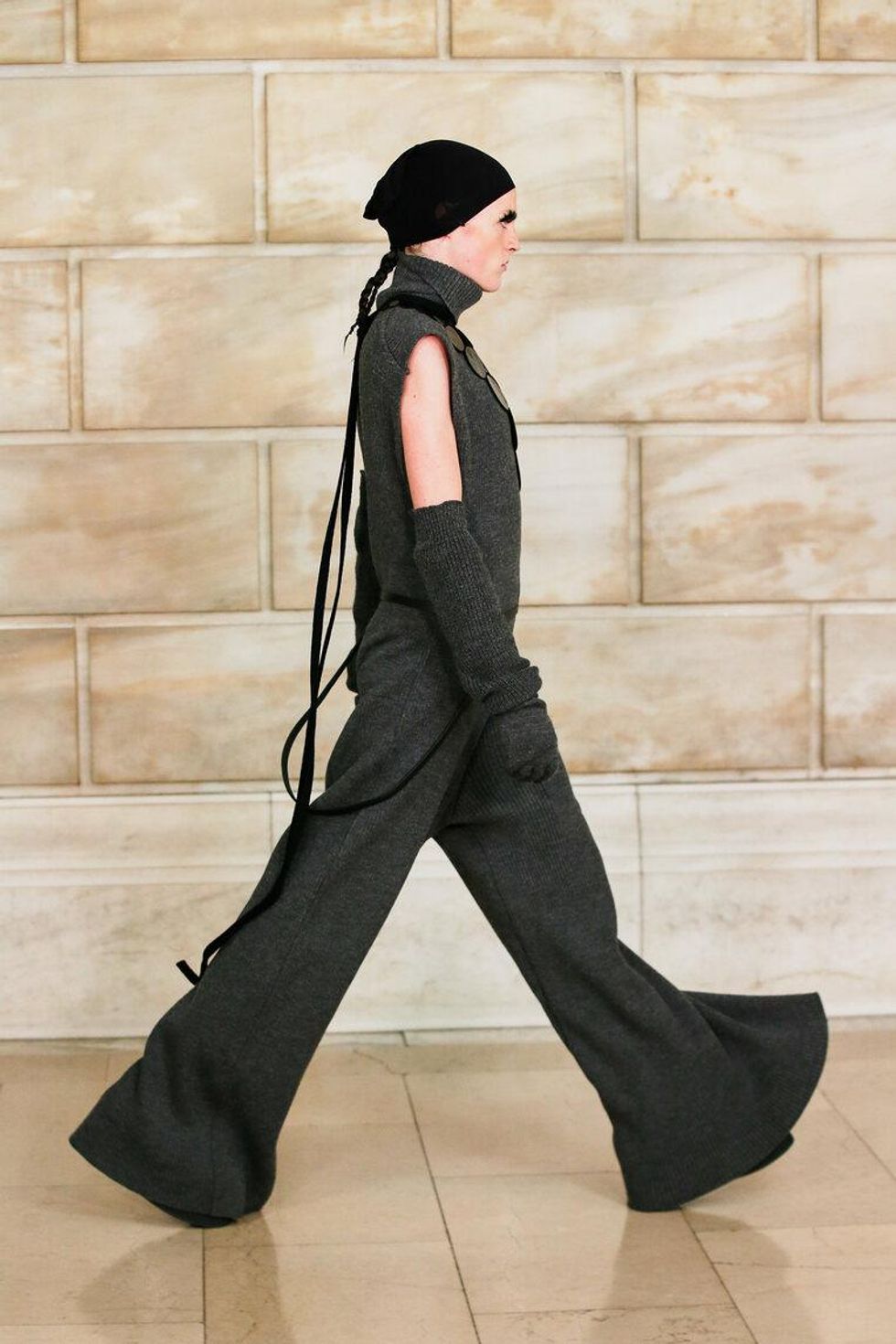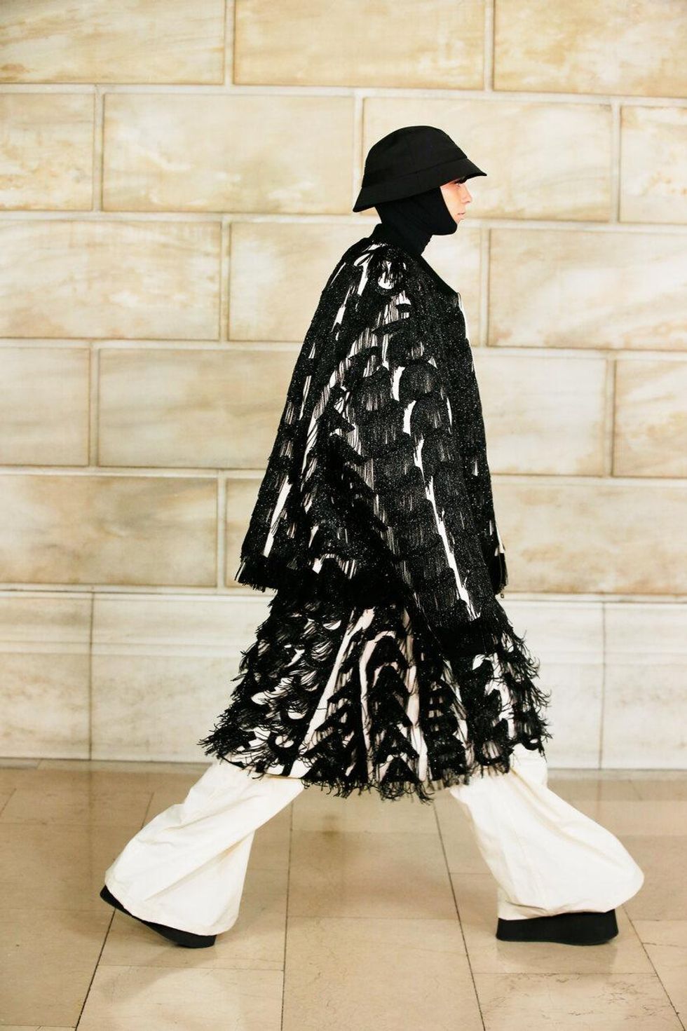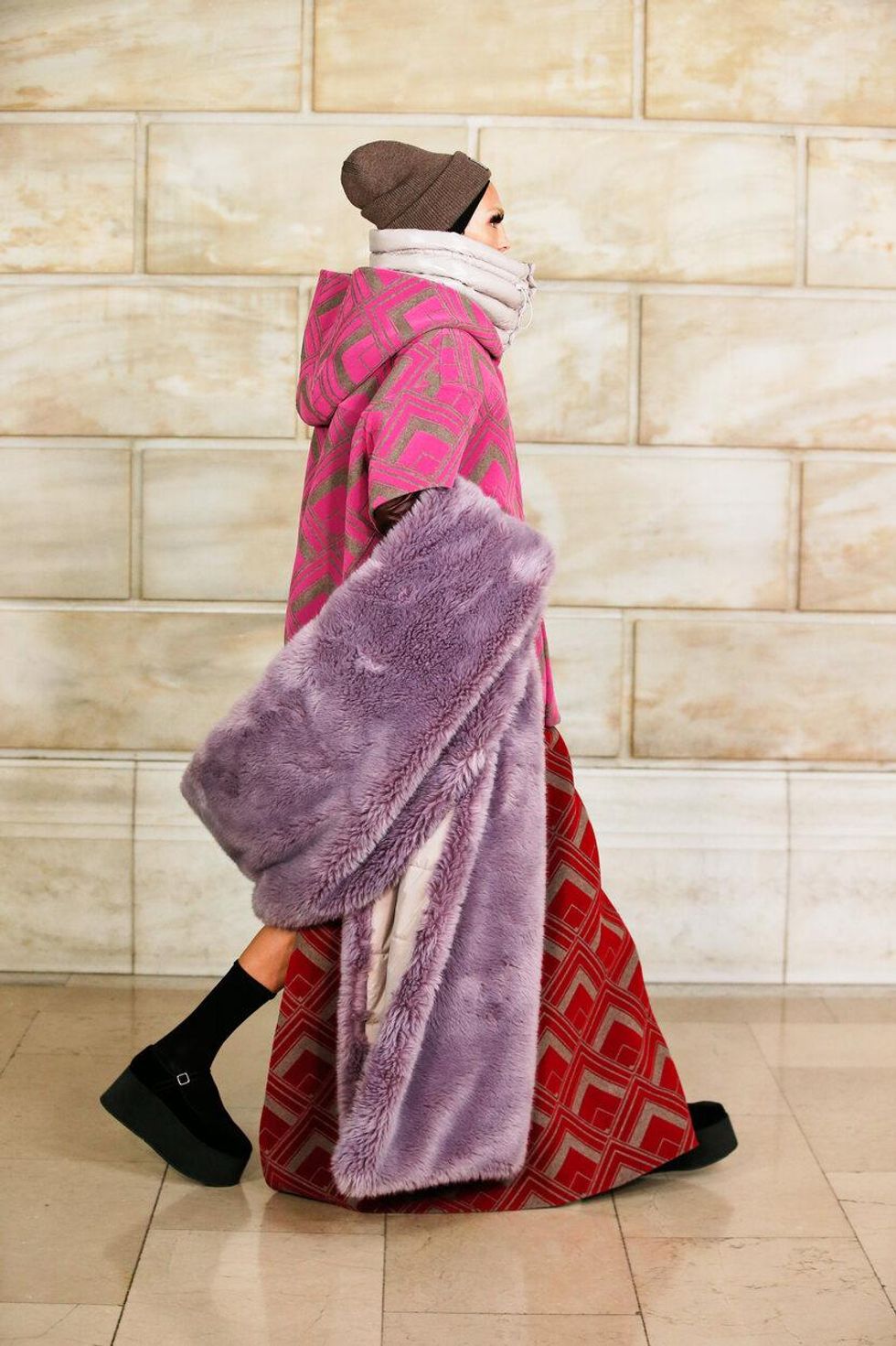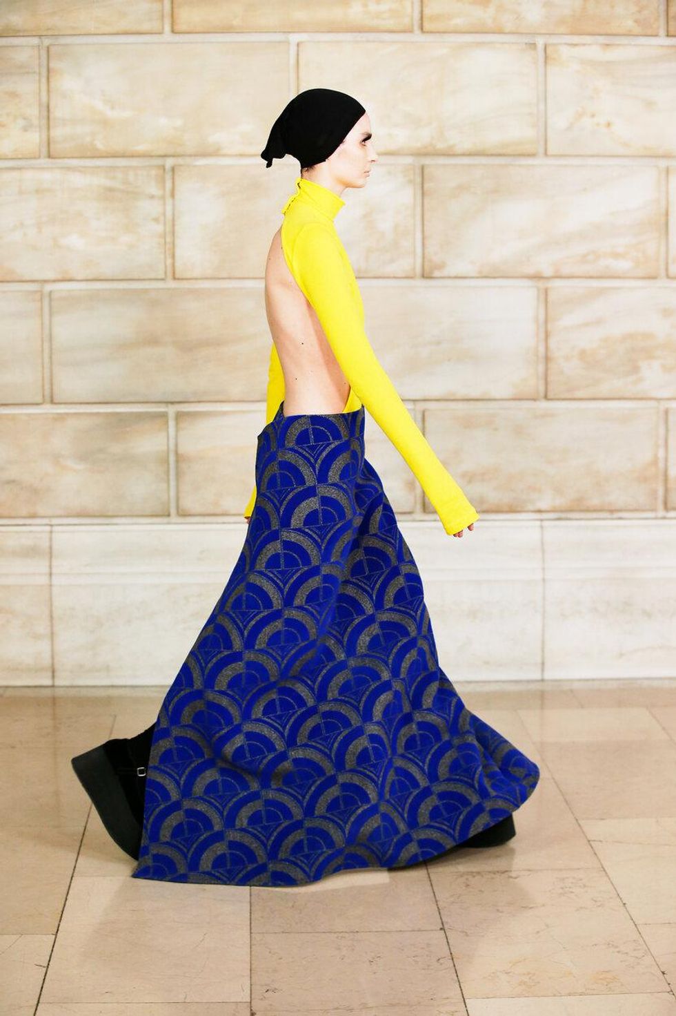 There were 70 looks in total, with the official runway photographs taken from the side of the models rather than the front, perhaps to showcase the depth and unique proportions of the clothes, which featured long trains, sweeping coats, roomy puffers, giant platforms, colorful paillettes and graphic logos. See the full collection, below.