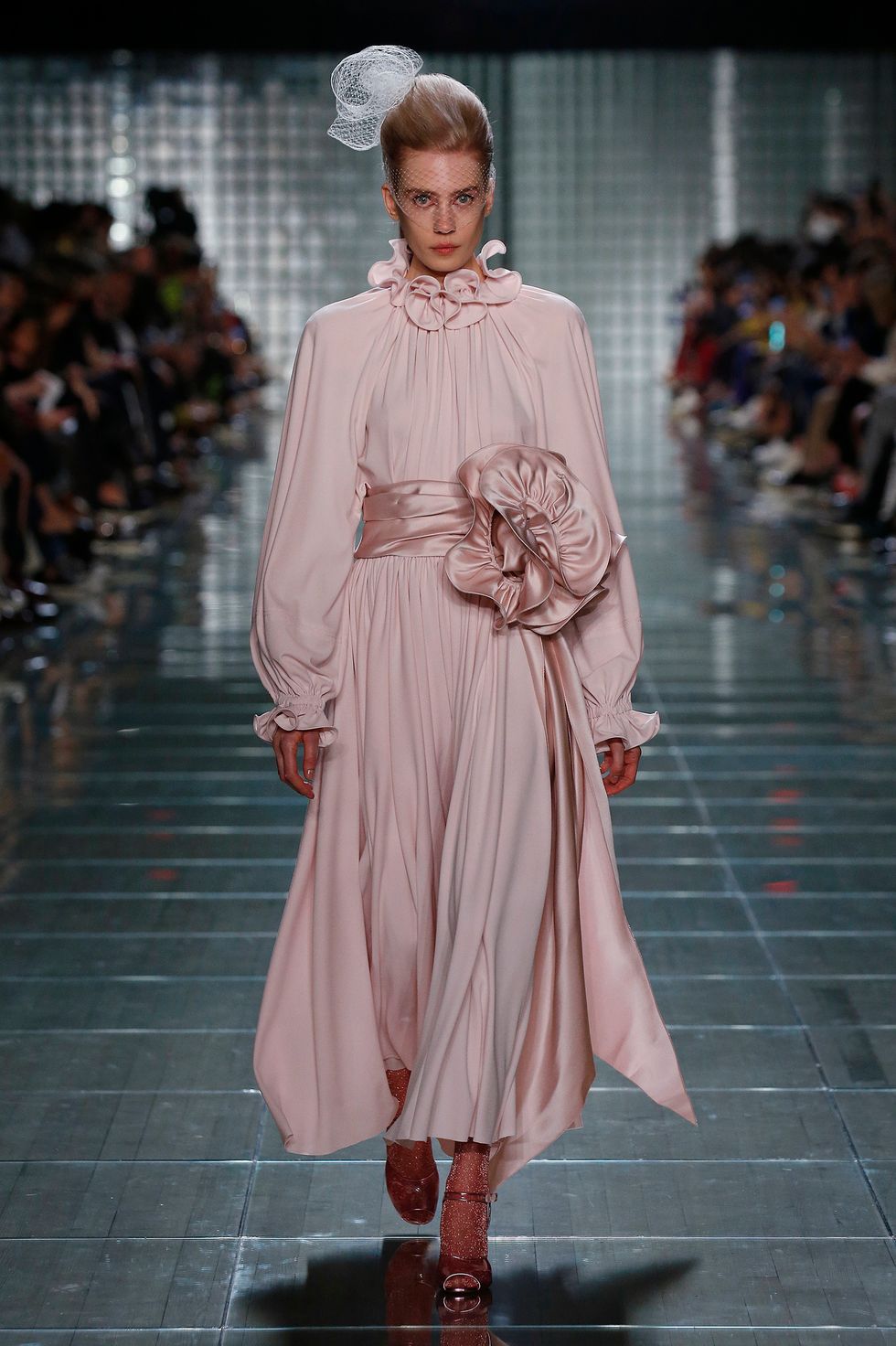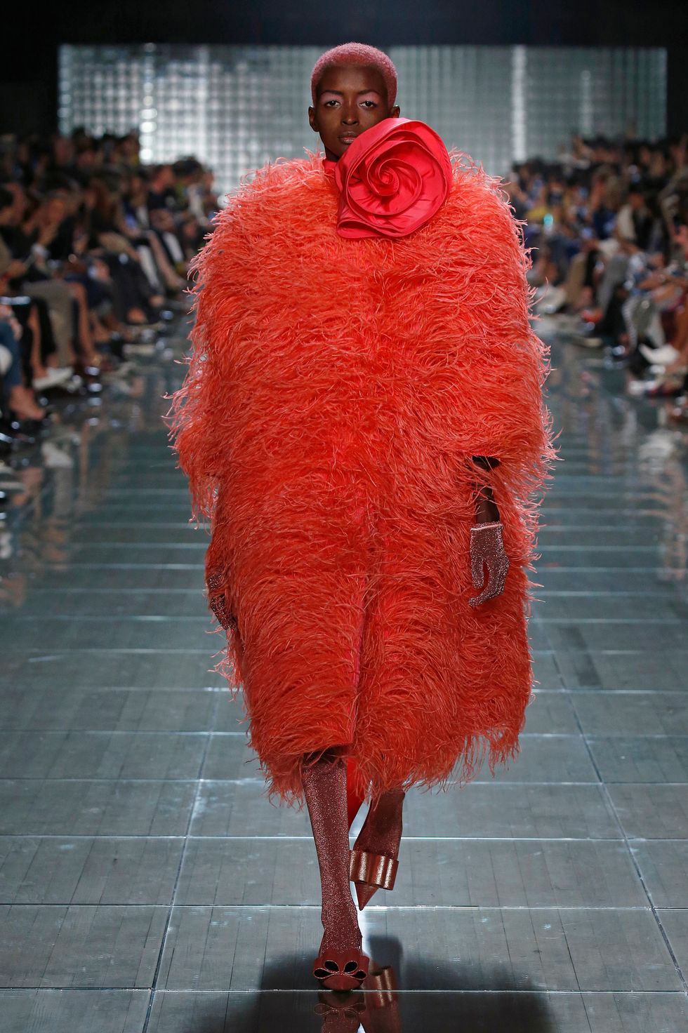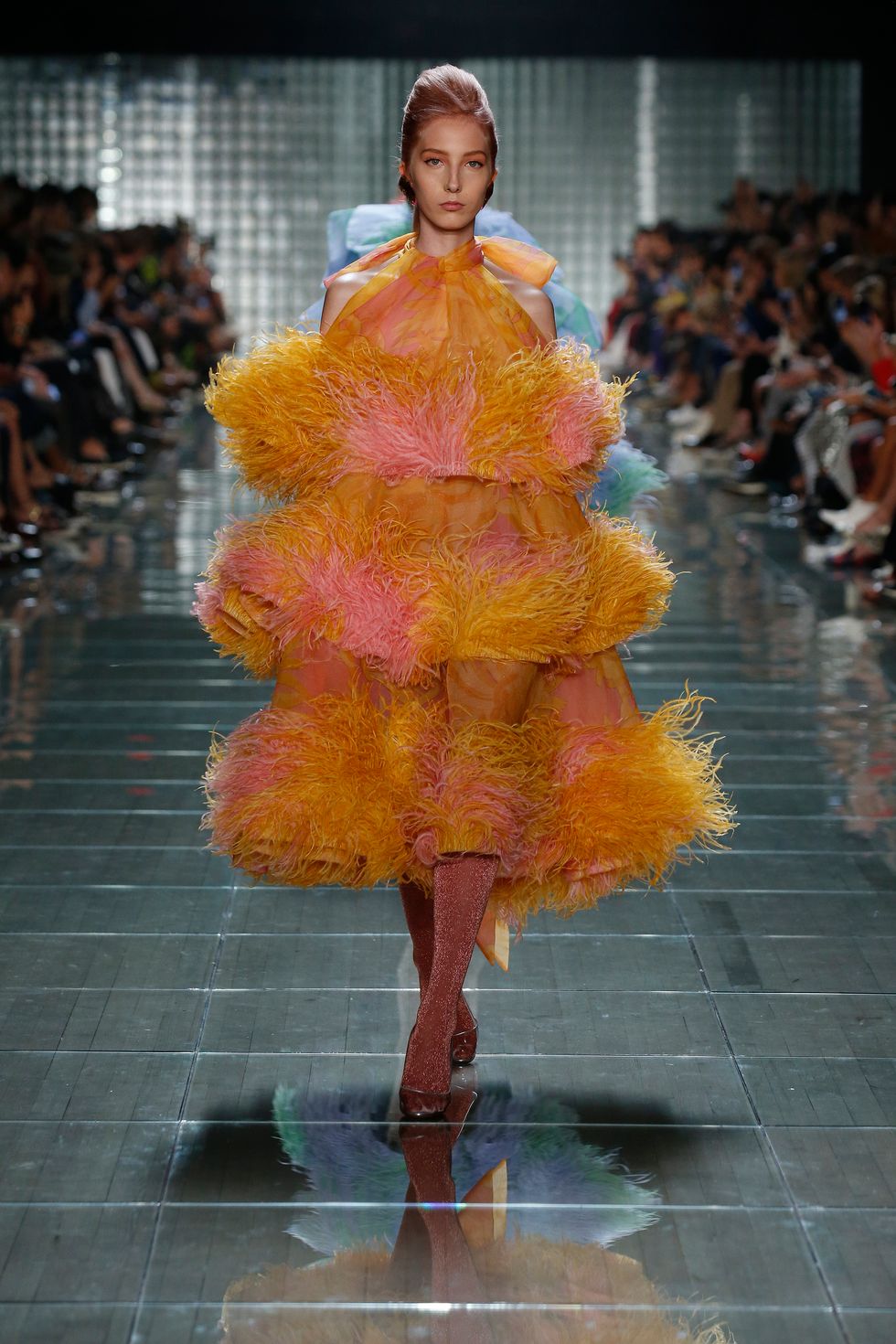 Saccharine shades of dandelion, blush, pistachio, red, peach, and azure make sweet silhouettes including tea length dresses, bishop sleeve blouses, and peter-pan collar coats, even sweeter. When choked with ruffles, multi-color ostrich feathers, and gathered tiers, the billowy confections read like haute clown costumes. Models with hair the same color as their outfits (courtesy of Guido Palau) compounded the theatrics.