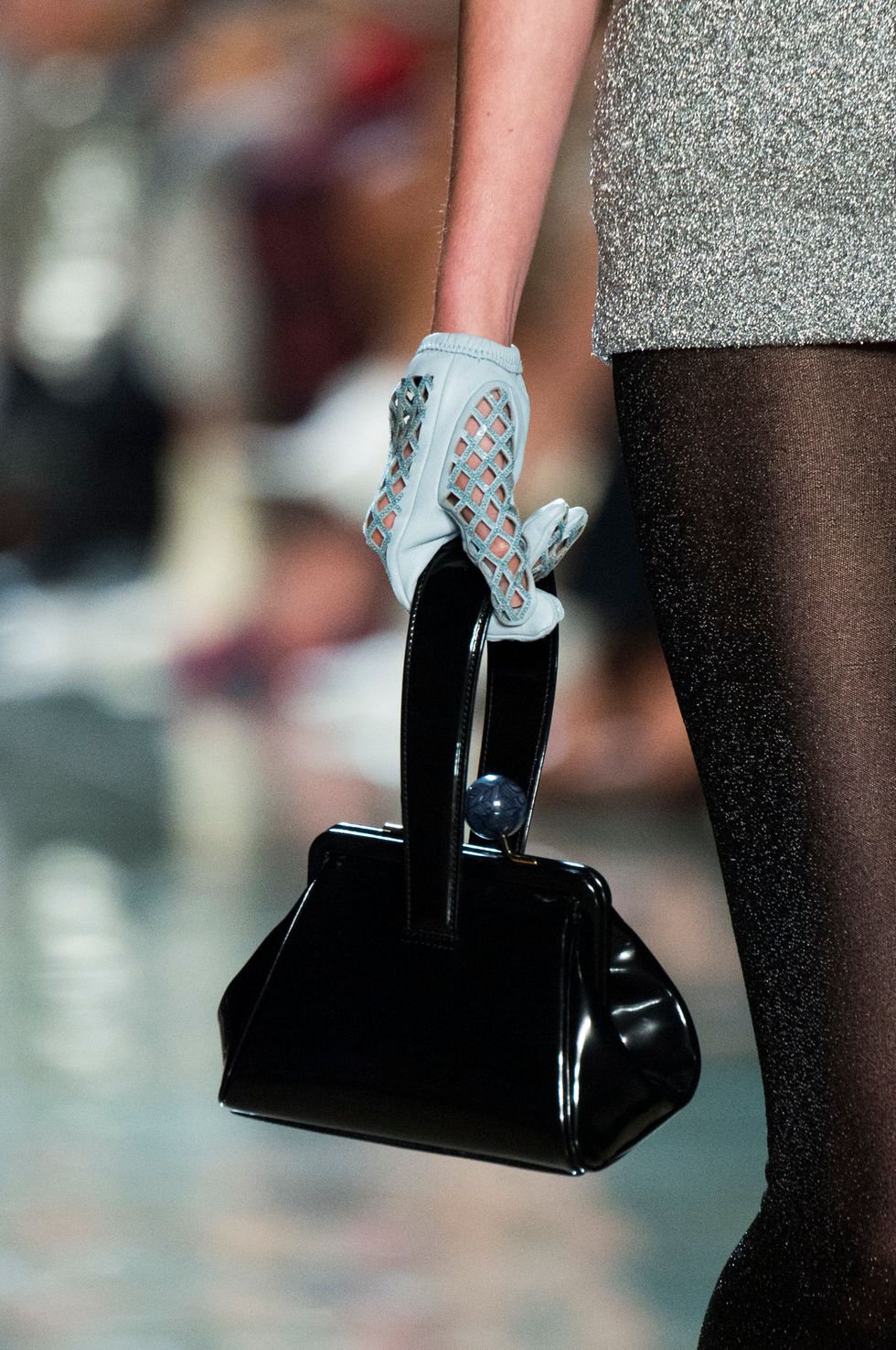 Jacobs added stylized tea-time accessories to each look. Box frame bags with loop straps were finished with translucent, orb-like clasps, gloves were executed with sequined lattice-work and sparkling mesh, and glimmering tights came in silver, gold, and pink.