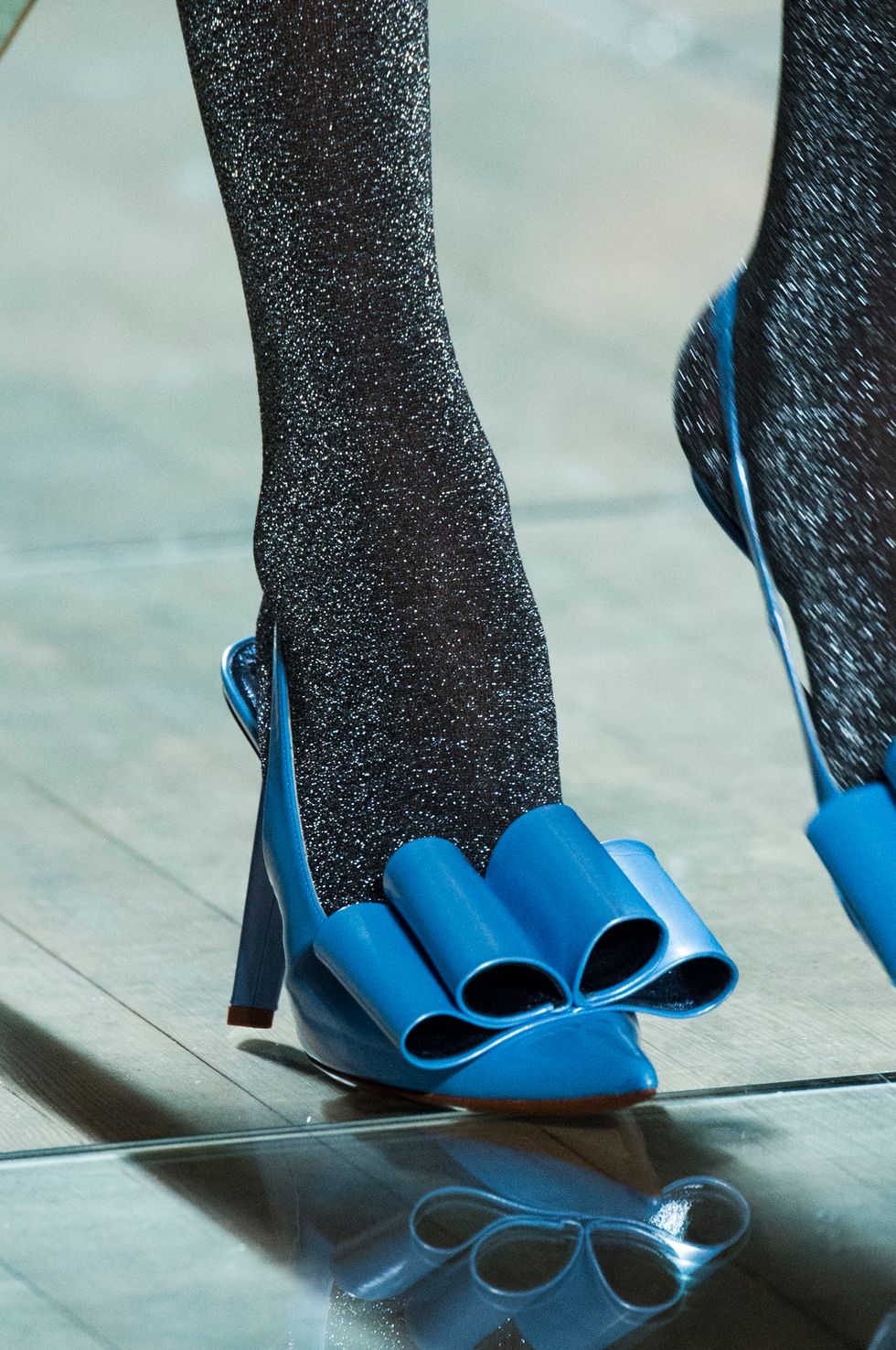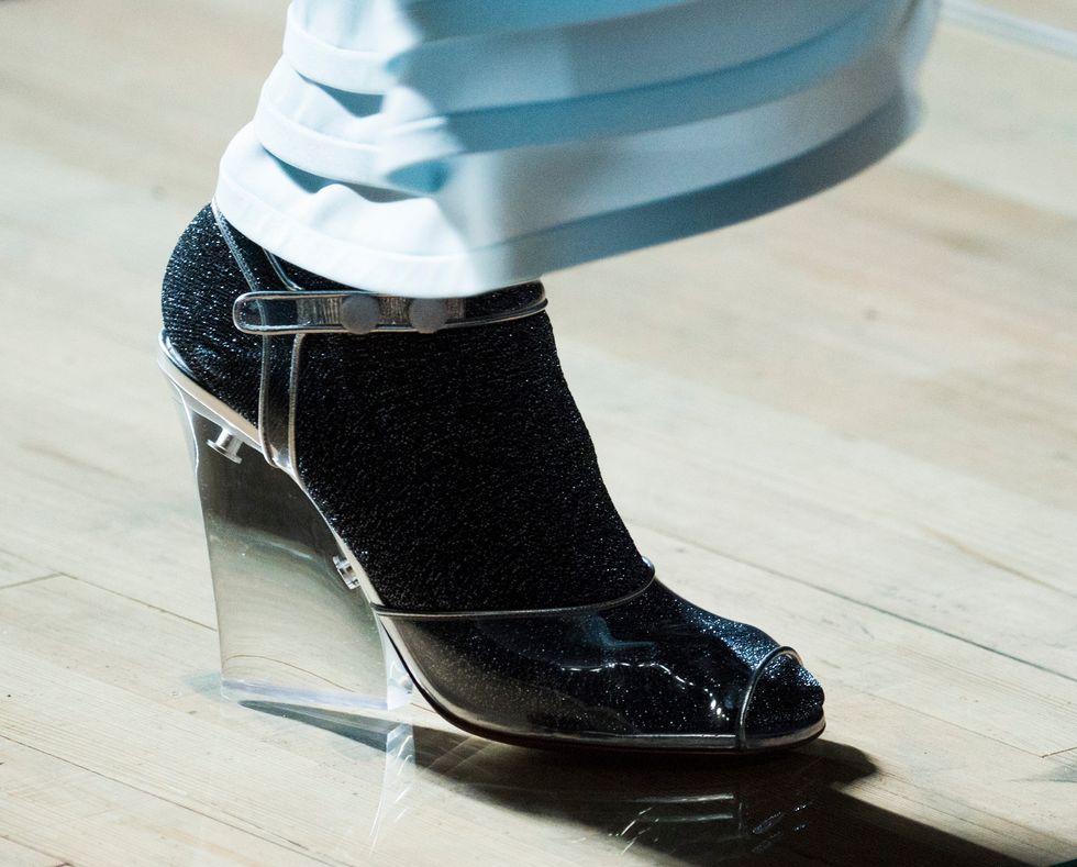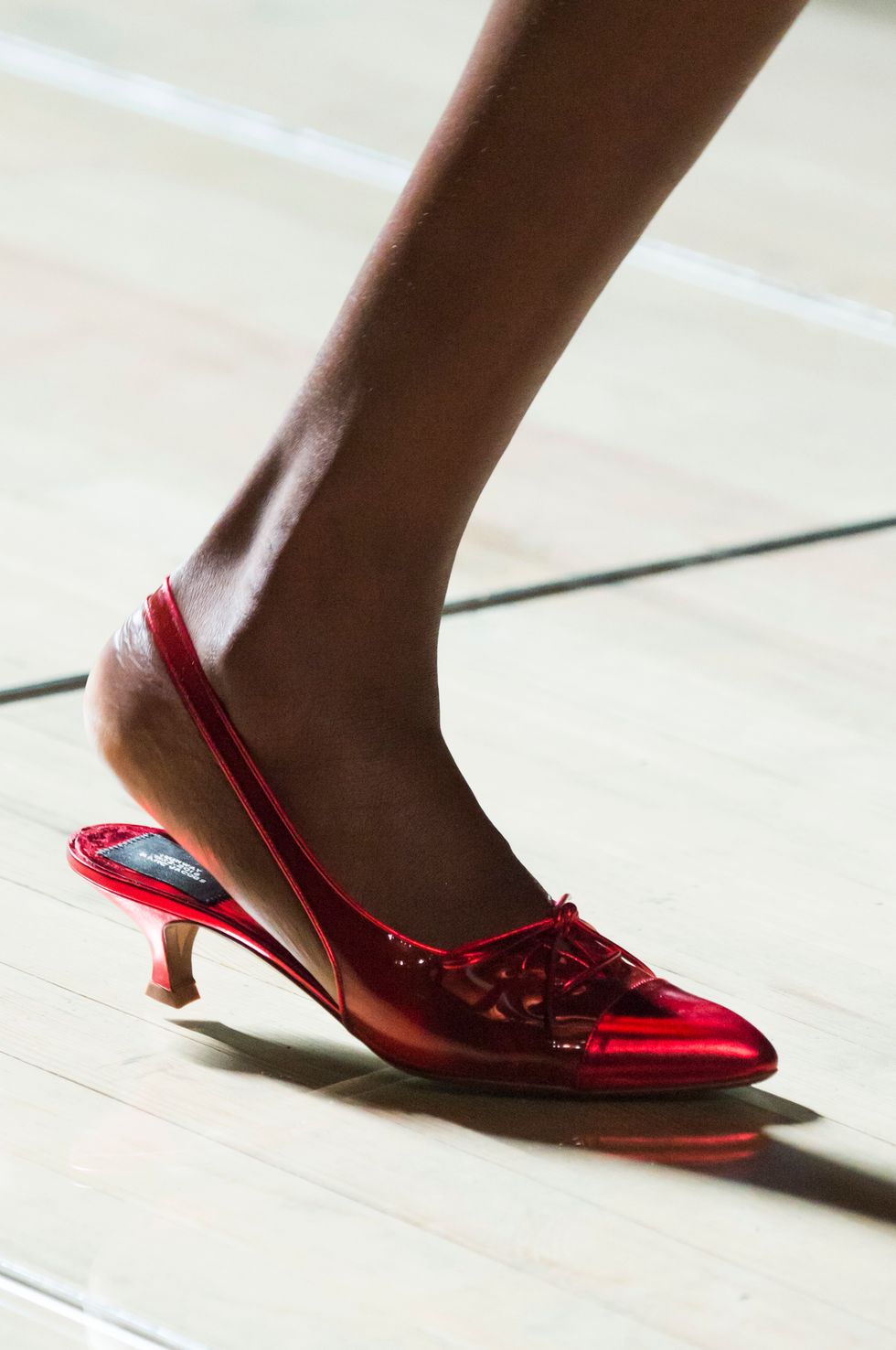 Jacob's footwear also commanded attention. Translucent peep-toe wedges (the jelly sandal's more formal sister), metallic slingback kitten heels, and patent leather pumps with topped with bows were equal parts prim princess and party girl.