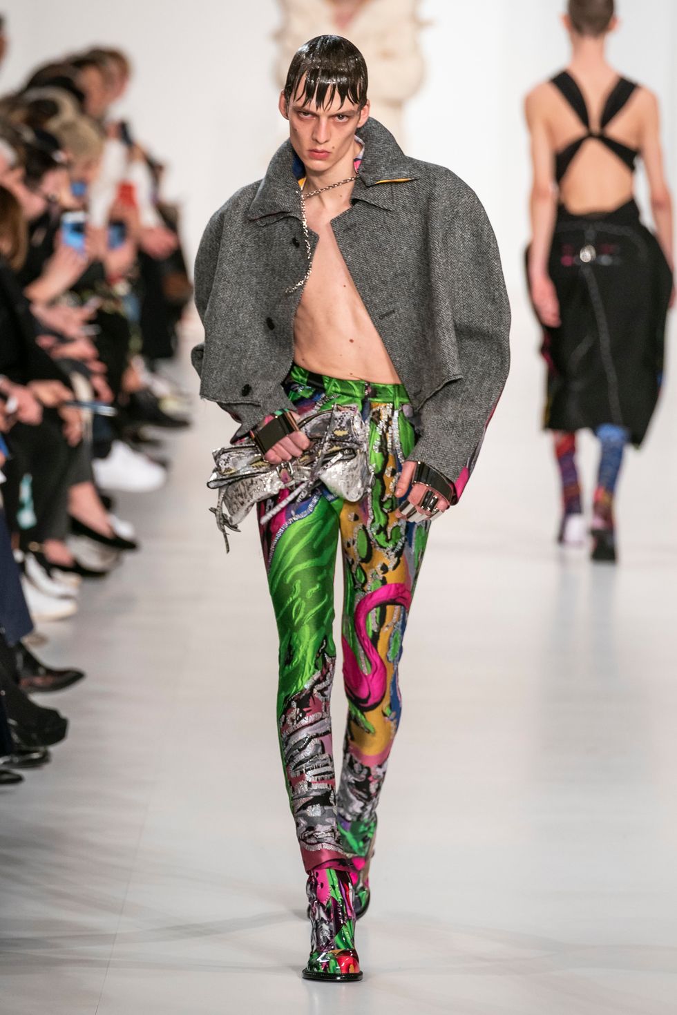It was business as usual on the runway when, serving up look 30 with gusto, model Leon Dame pumped down the runway with a disruptive, moody gait that totally stole the show. Clad in a pair of printed leggings and a cropped coat, the German model brought enough attitude for the whole cast of traditionally dead-pan runway walkers. Rocking a head of heavily gelled down hair and clutching a python bag at his hip, Dame's energy and commitment is a big mood for Fashion Month (and beyond).