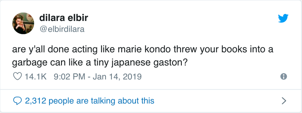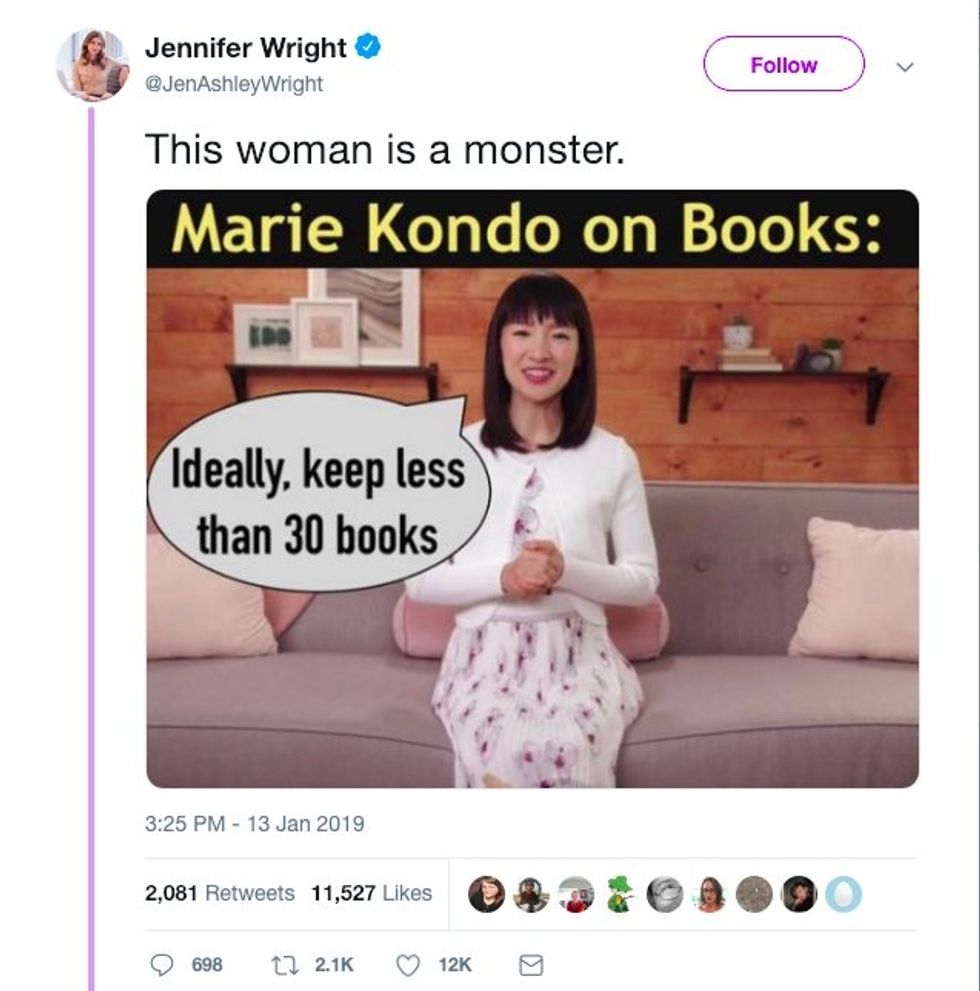 Marie Kondo became famous for her 2011 book The Life-Changing Magic of Tidying Up and has recently become a viral internet phenomenon with the release of her Netflix series Tidying Up with Marie Kondo earlier this month. Although her show was initially met with positive reaction and internet virality, the white public has suddenly turned against her. An avalanche of attack pieces, tweets, and comments largely by white people has been launched at Kondo. This backlash was initially triggered by statements that Kondo made regarding books in episode five of her show. In numerous viral tweets and pieces, white people alleged that Kondo was forcing people to keep under thirty books, telling everyone to throw out all of their books, and was a threat to literature. A viral tweet by a white woman, Jennifer Wright, who later apologized in response to criticism, called Marie Kondo a "monster" and photoshopped a speech bubble onto an image of Kondo stating that she was telling people to keep under thirty books.