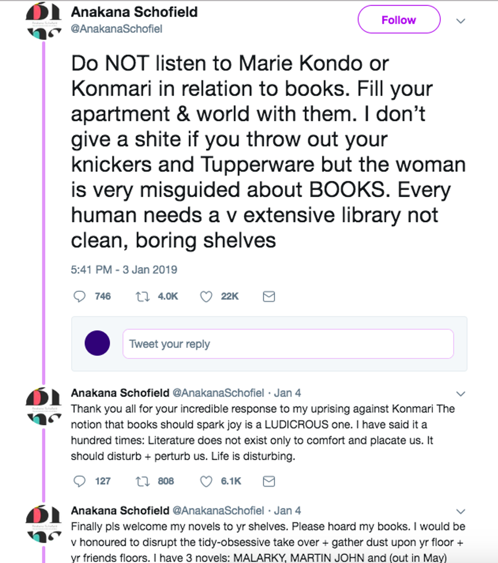 In addition to the book controversy came a wave of outraged pieces by white people mockingly fixating on Kondo's "spark joy" phrase and jeering at her philosophy as "moral righteousness." Anakana Schofield, another white woman, whose viral tweets started the book controversy, used coded racist language —"fairy finger" "woo-woo nonsense"— to disparagingly refer to Kondo's Shintoism-influenced methodology in her piece in The Guardian. Then came further endless tirades by, you guessed it, more white people eviscerating Kondo's method for not working perfectly for their hyper-specific personal situations, projecting extreme malice onto Kondo, and launching patronizing vitriolic attacks such as, "[T]ake your tidy, magic hands off my piles."