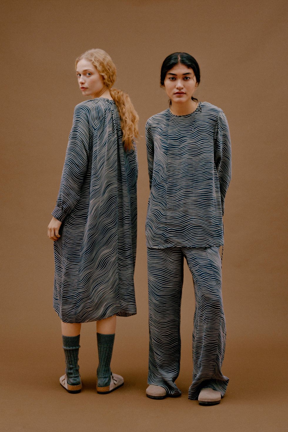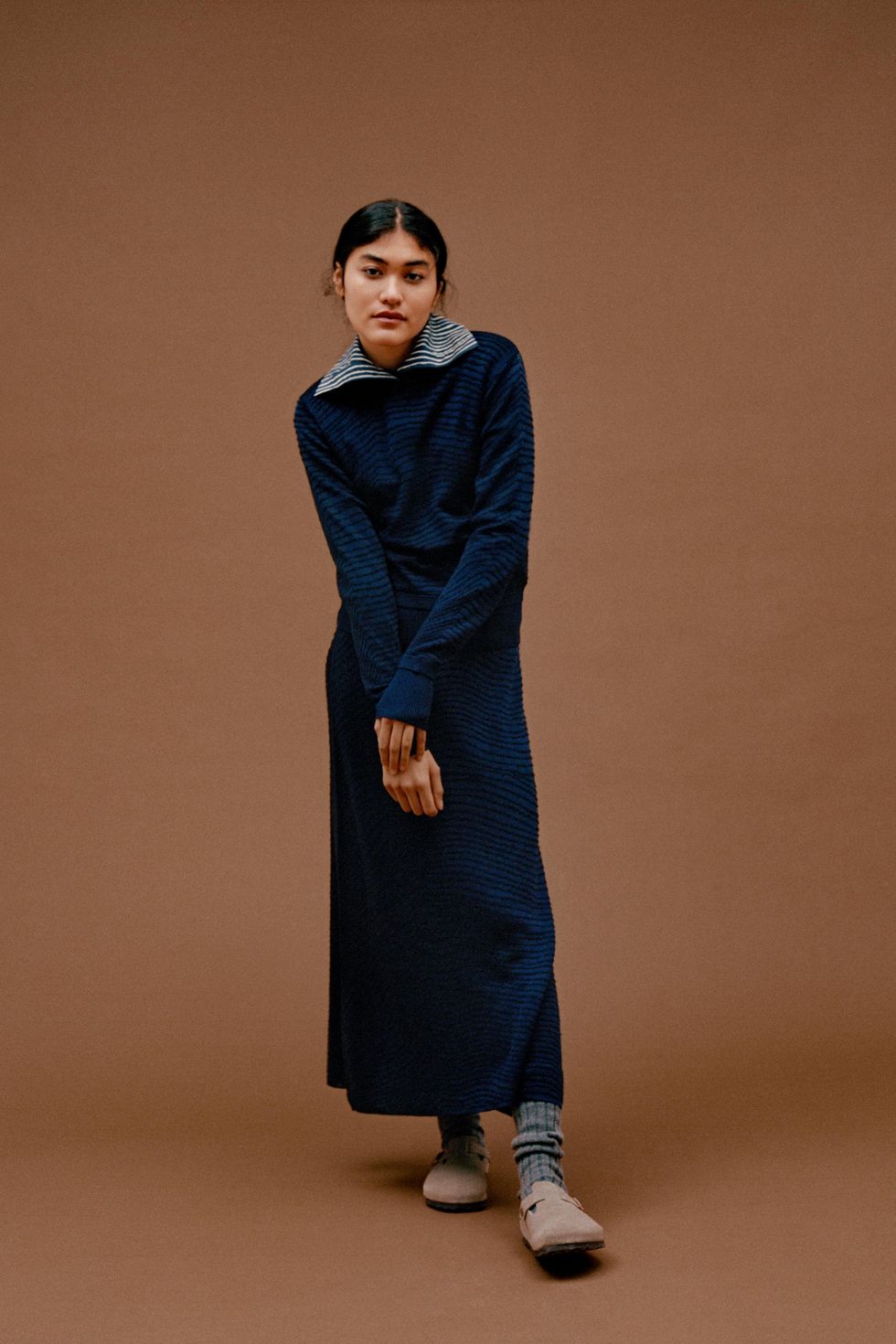 Simple structures meet modernity in A-line skirts with a folk print, midi dresses with accentuated waistlines, and trim, tailored silhouettes. Wavy ribbing and asymmetricality plays with the traditional designs of folk wear, while matching sets and layered looks complete the collection with a distinctly Scandinavian finish.