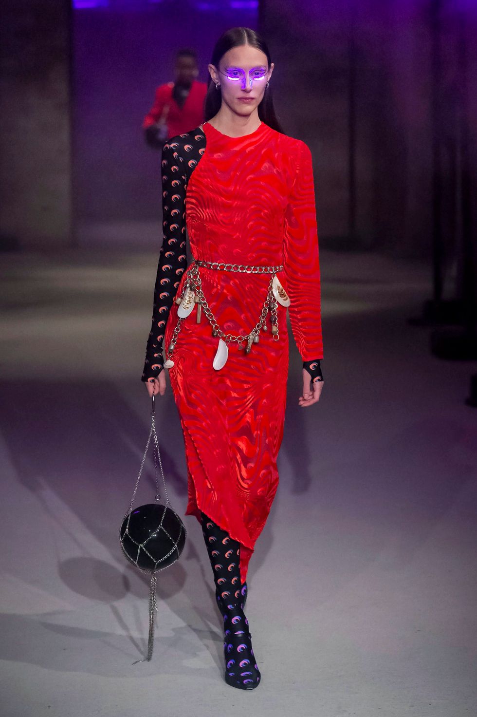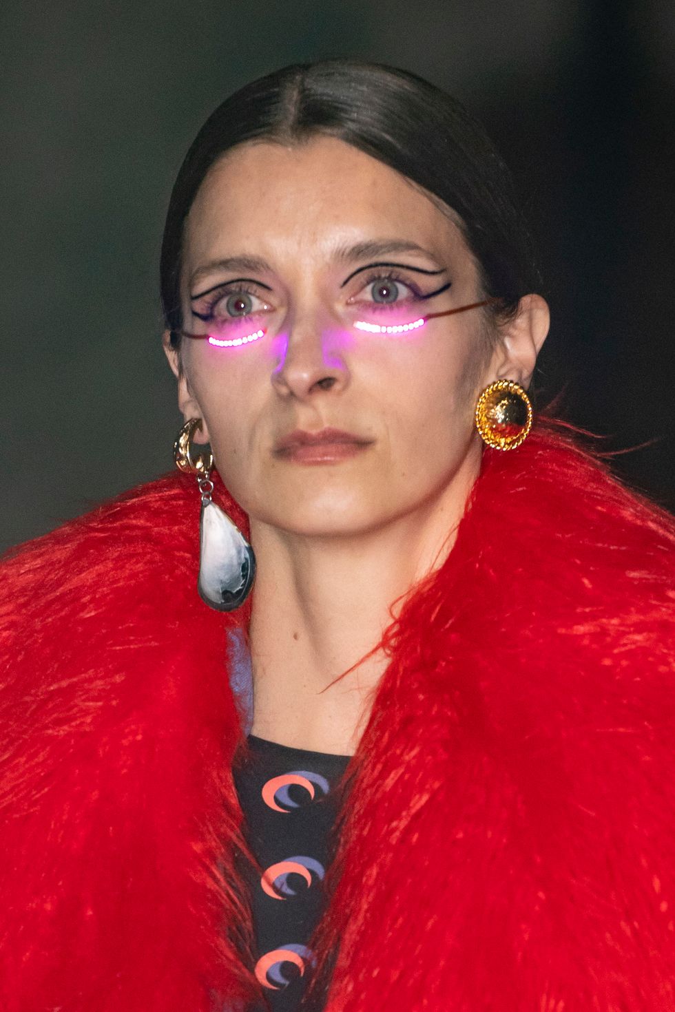 Marine Serre, surely the most important young designer "of the moment," presented her fall collection today in the depths of a Parisian cellar. Most collections at her young label have focused on concepts of upcycled sustainability and what she calls "futurewear" — clothing that suits the Anthropocene. Her glorious fall show, titled "Radiation" and held in the midst of a February heat wave, leaned into the idea that soon we all shall die, with UV lights and hacker greens that implied a field of nuclear waste. And the facial accessories really brought it home.