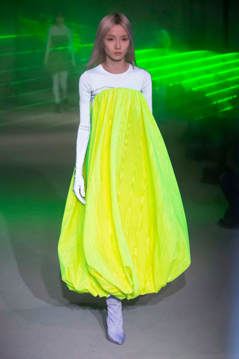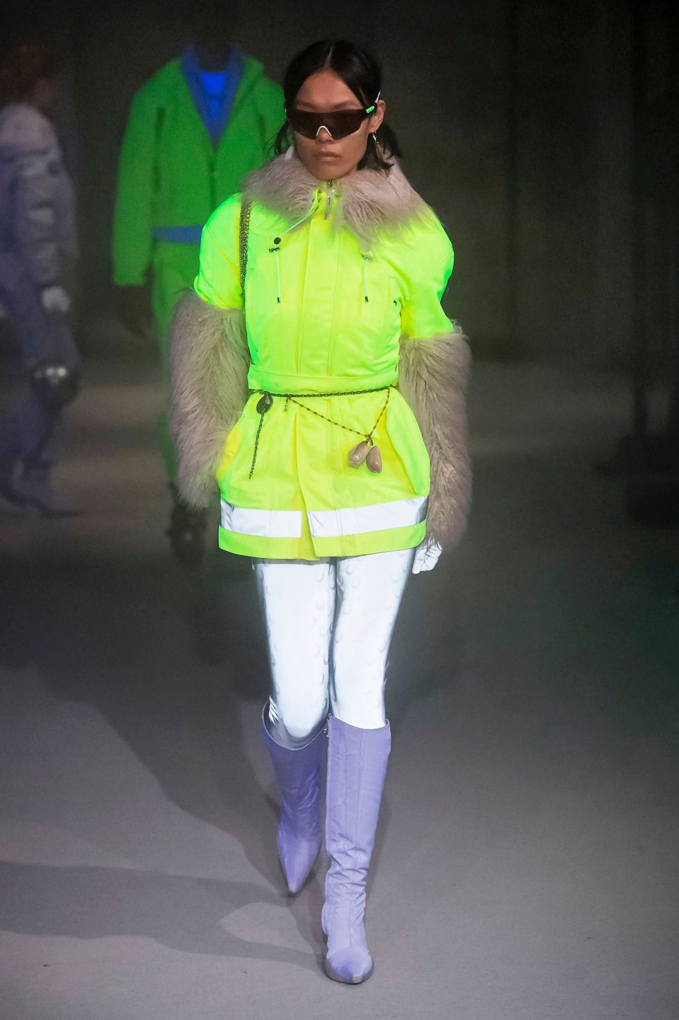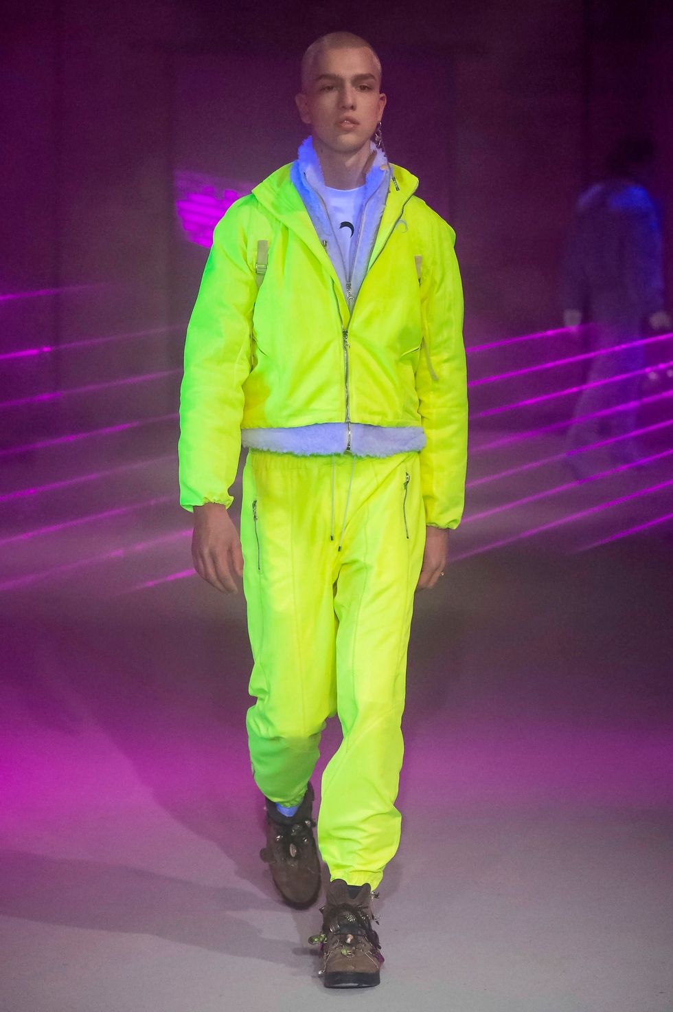 Neon, a trend we've seen at a lot of fashion month shows since the season kicked off in New York, was shown here too. Blinding, glowing highlighter yellow pants, outerwear and a dress was shown on both genders.