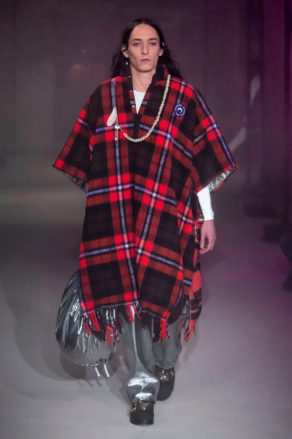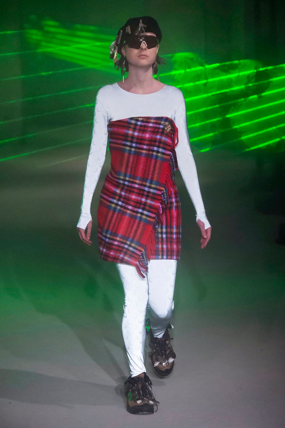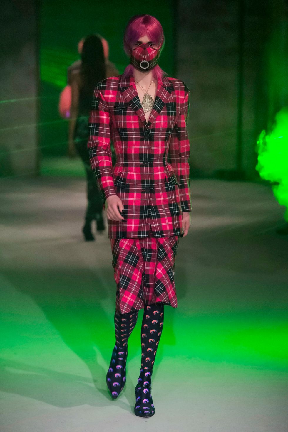 In deep green and red, Serre presented a couple of neatly tailored looks in bold tartan plaids. With the addition of color coordinating hair and protective face masks, the aesthetic became more post-apocalyptic than conventional.