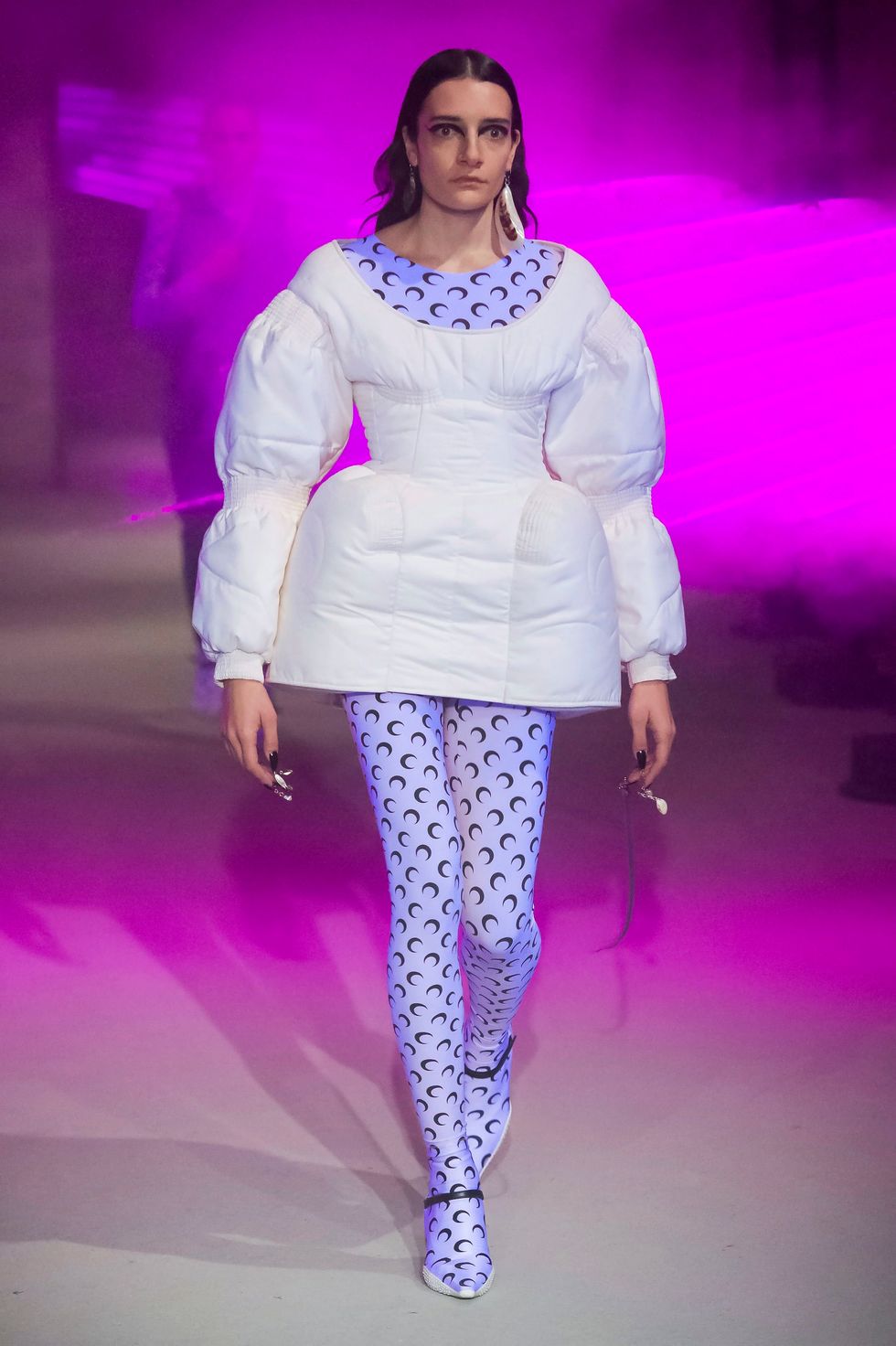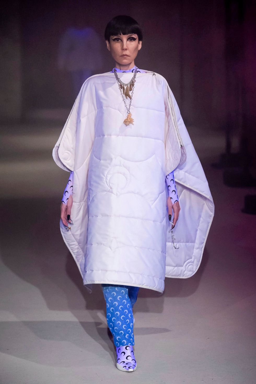 The puffer has reached an all time high this season. At Marine Serre, it came trimmed in vibrant faux furs and manipulated into new forms of quilted fabric, including: one clerical looking cape-like gown and mini dress.