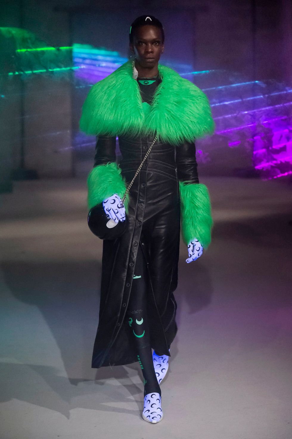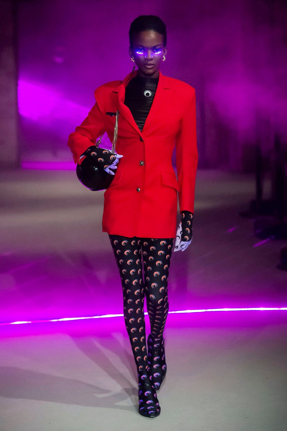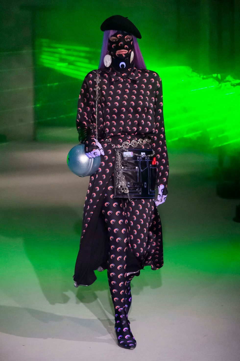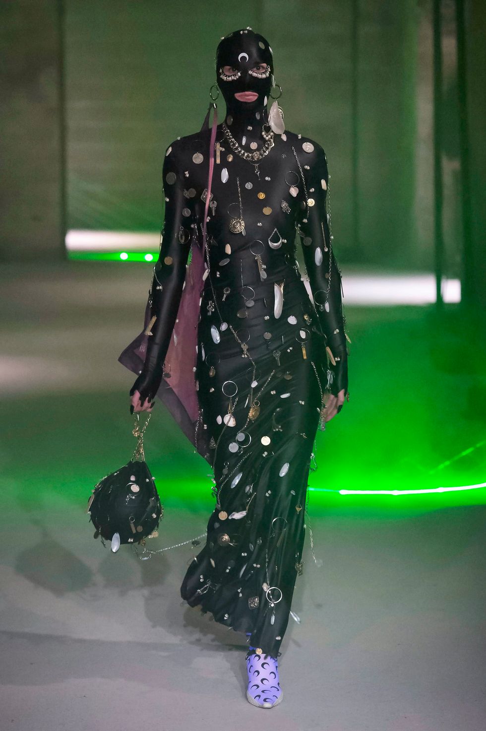 In a former wine cellar on the outskirts of Paris, rising designer Marine Serre presented her latest collection pegged to an apocalyptic future, with face masks, laser eyes, body suits and glowing neon garments. "It's after the apocalypse, a group of friends are underground — a community coming together. It's a safe zone in which a new world is being created, a future world, a new way to see fashion," said Serre about the fall 2019 collection. Here's everything else you need to know about the show.