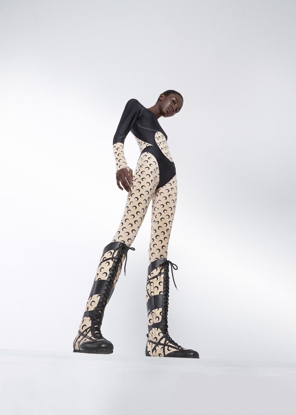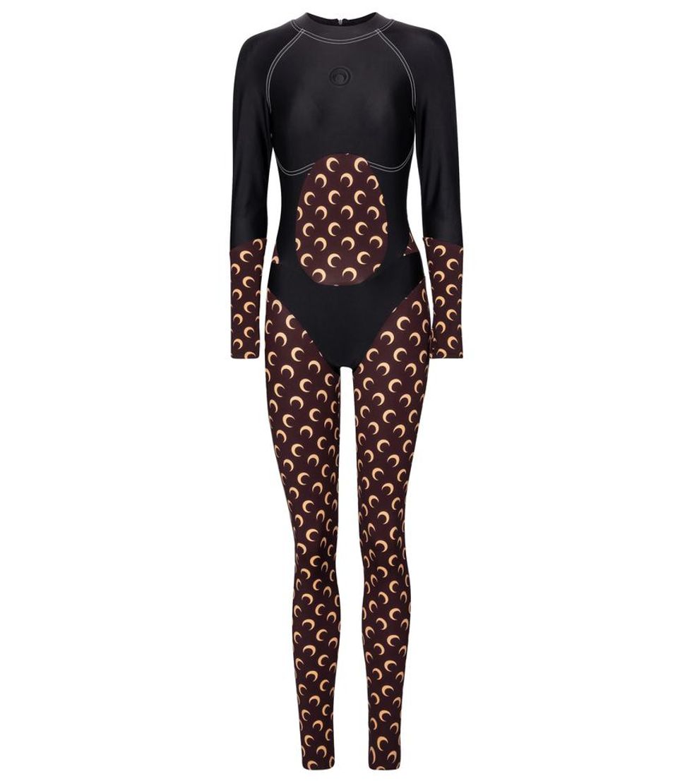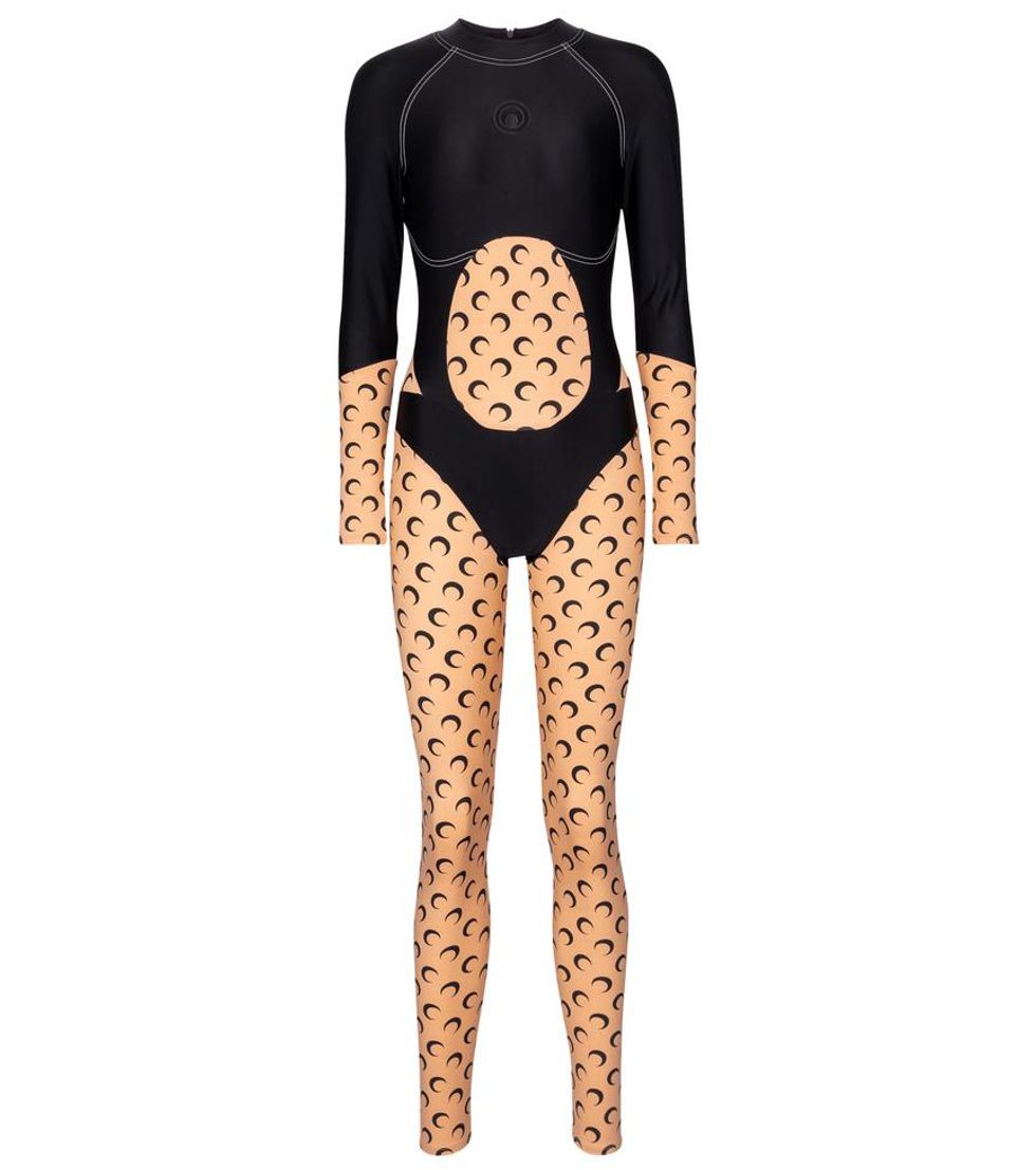 As such, she divided the collection into two complementary themes. The first focuses on athletic jersey items including second-skin cycling gear and crescent moon-printed leggings, body-con catsuits featuring sporty cuts and a catsuit with a trompe l'oeil moon pattern effect. "We chose the color combination to have a large representation of different skin tones," she adds.
