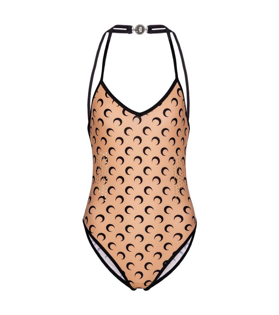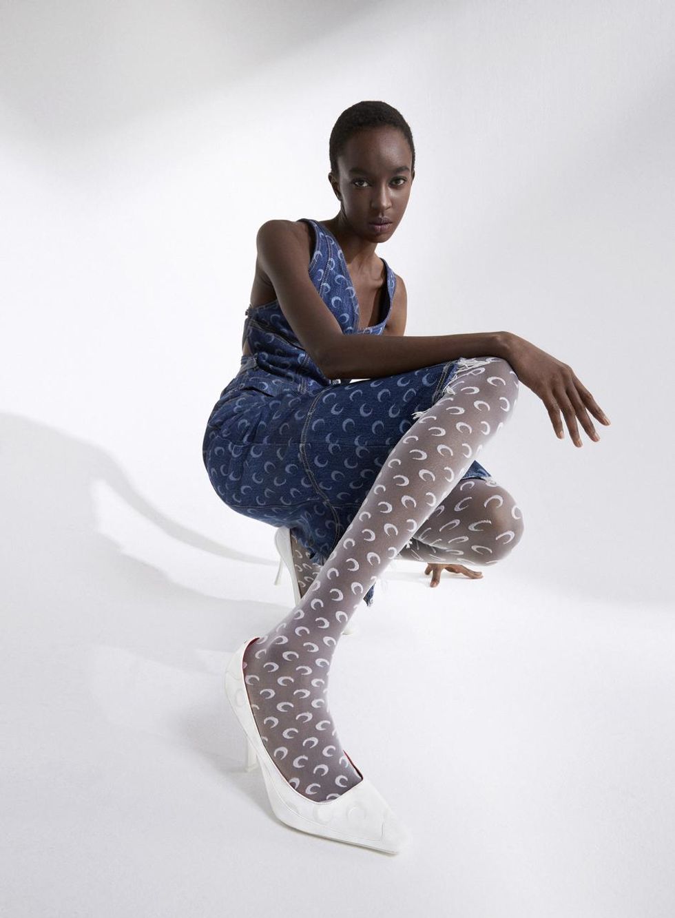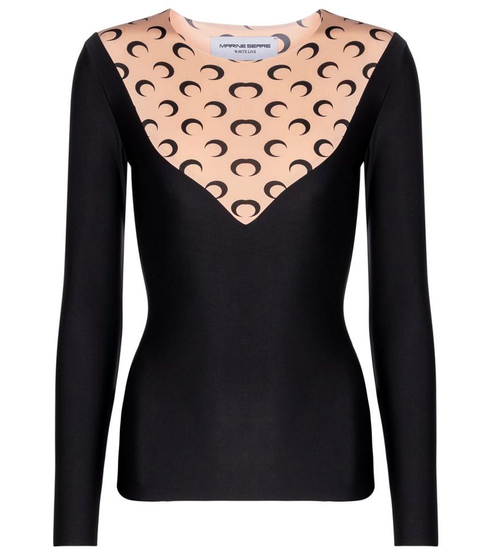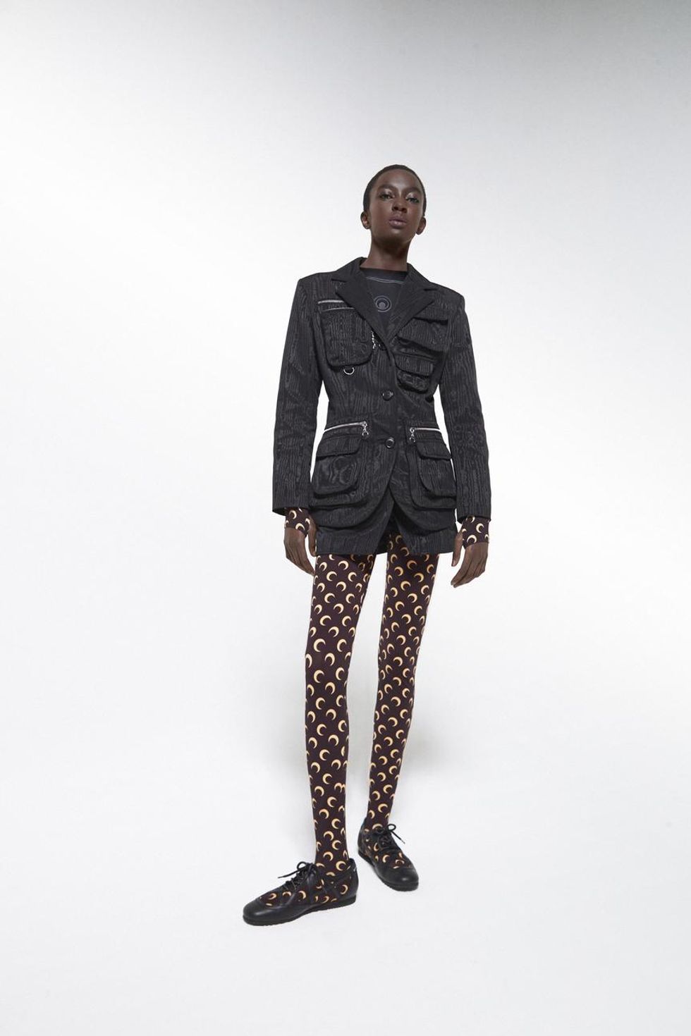 As such, she divided the collection into two complementary themes. The first focuses on athletic jersey items including second-skin cycling gear and crescent moon-printed leggings, body-con catsuits featuring sporty cuts and a catsuit with a trompe l'oeil moon pattern effect. "We chose the color combination to have a large representation of different skin tones," she adds.