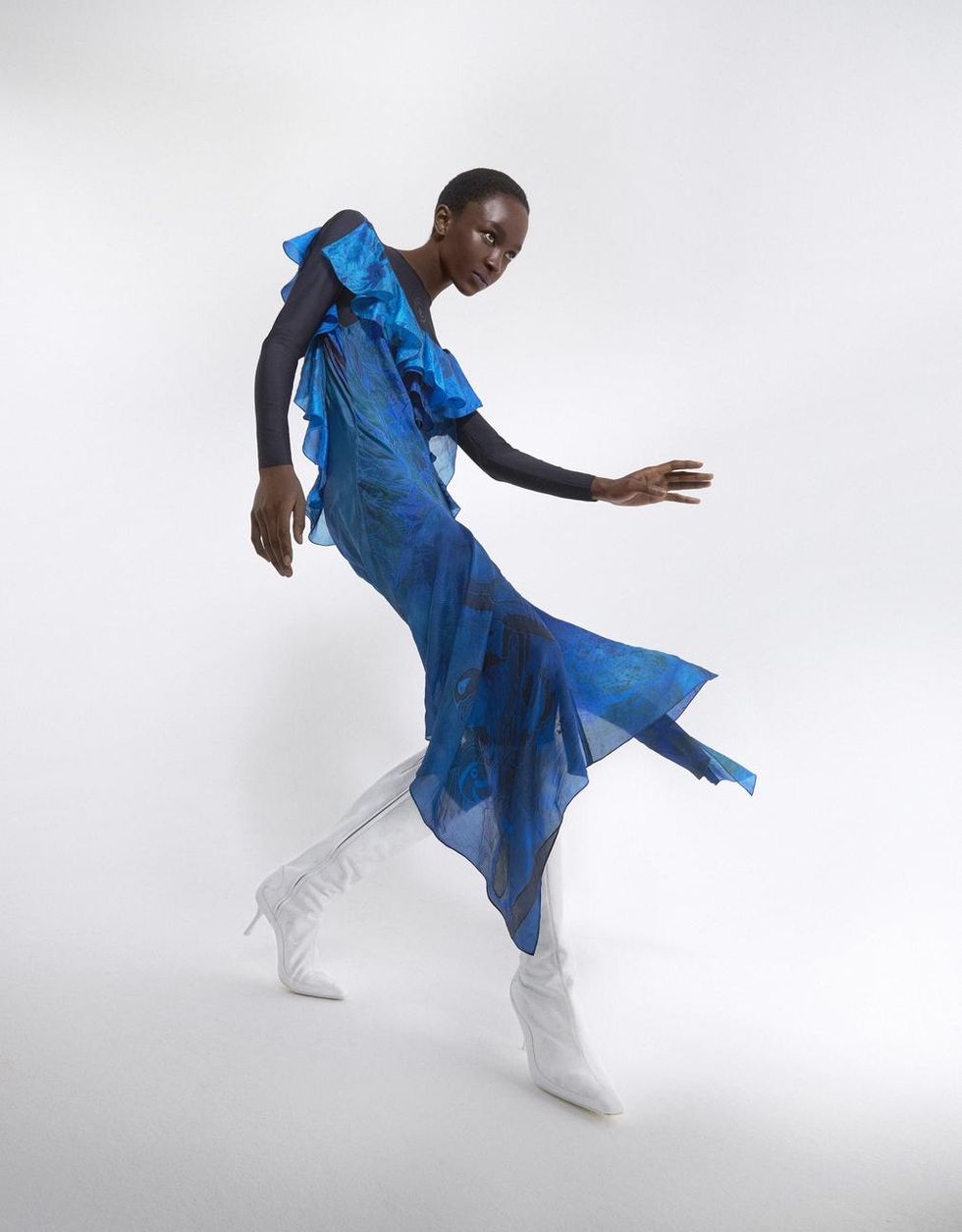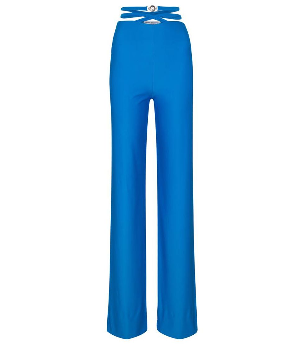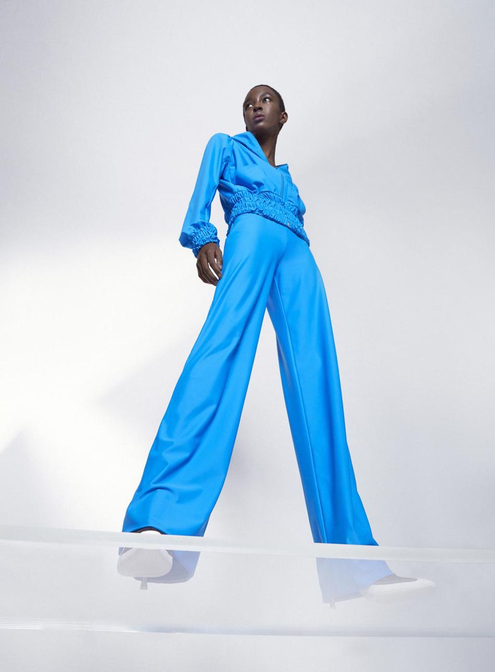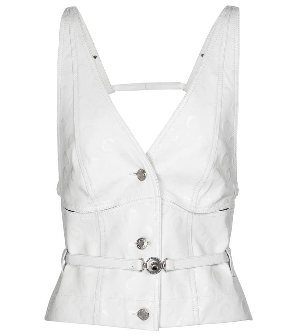 The second theme centers on a white and icy blue color palette on items like the hybrid all-in-one jersey catsuit layered with bias-cut regenerated silk scarves. Some pieces are also made from regenerated bedsheets and white deadstock leather with engraved moon prints that were made exclusively for Mytheresa.