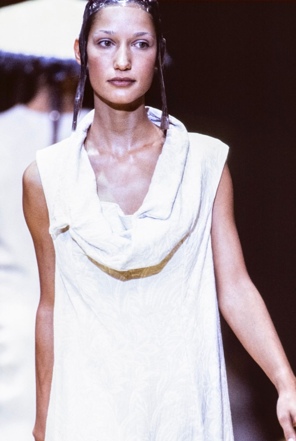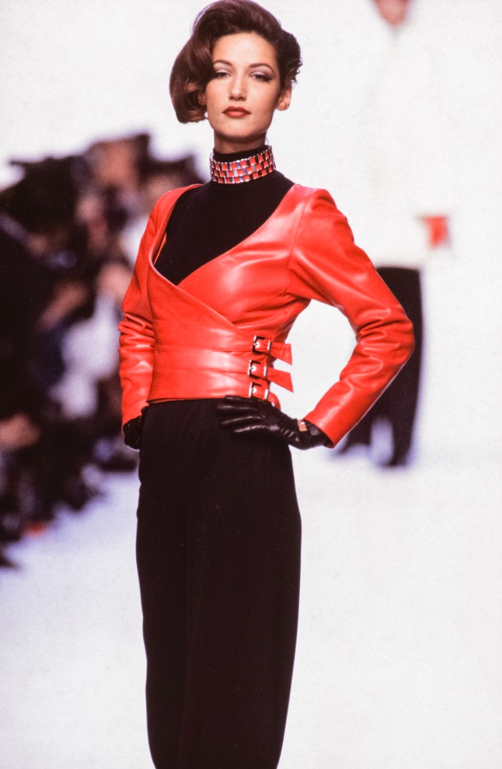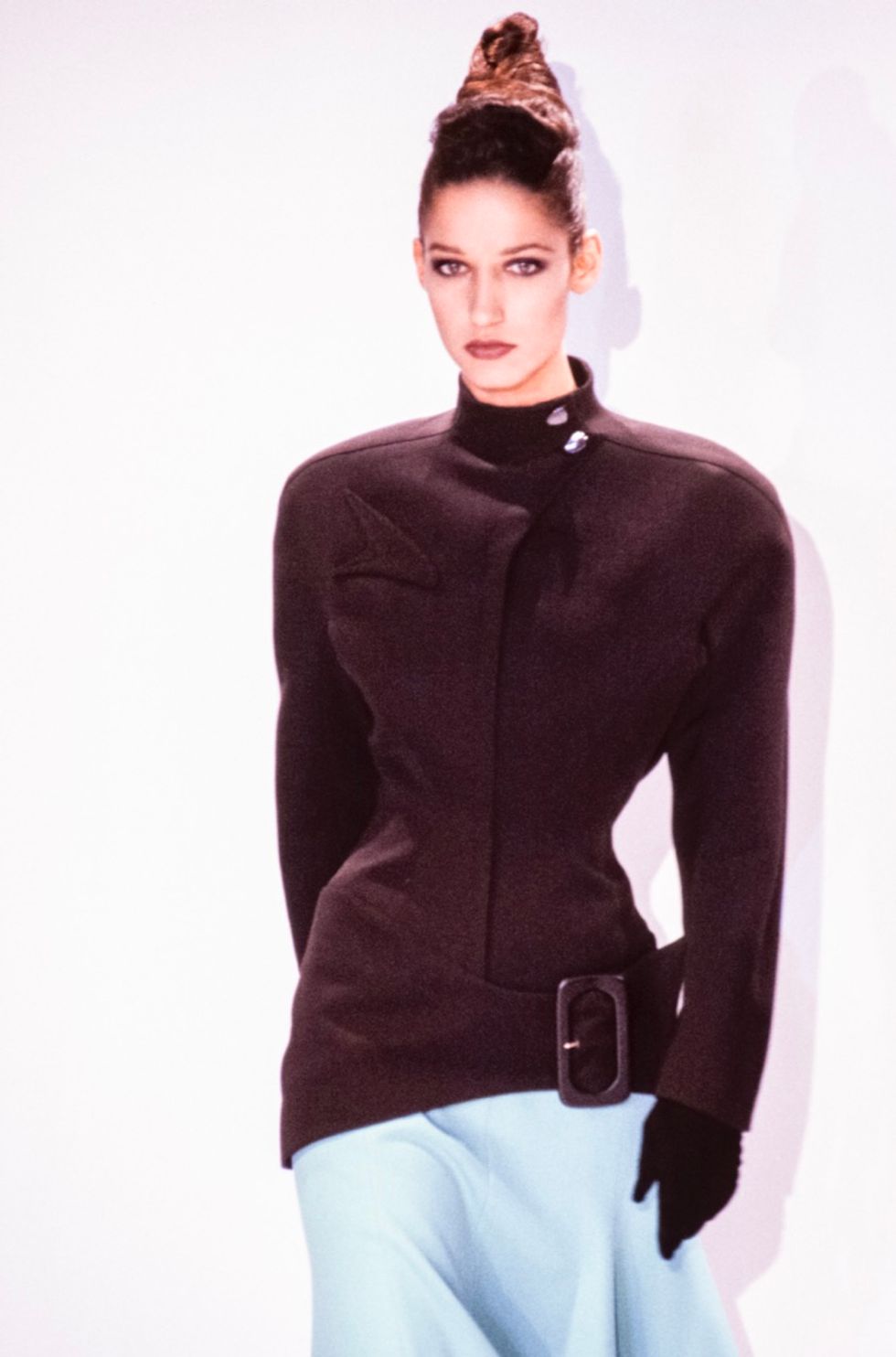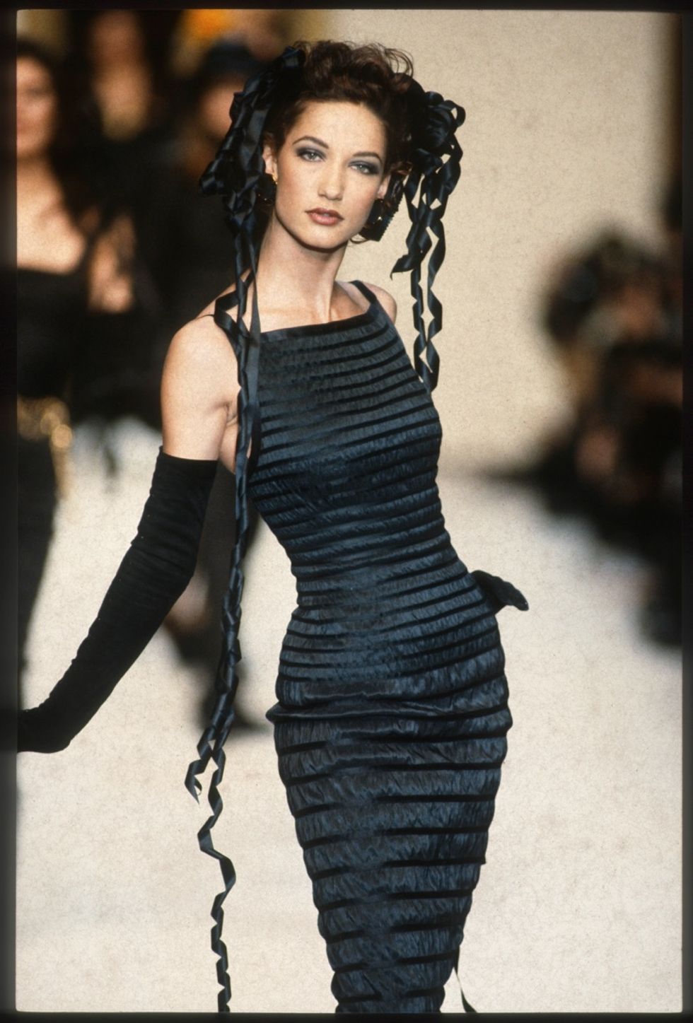 Mugler: The sweetest guy who had the vision of staging the most outrageous theatrical shows. My first one was when Pat Cleveland descended from heaven whilst pregnant! I only had a minor role as a cherub seated on the podium in that show but also had some of my most iconic runway moments thanks to Thierry, playing the bondage Dominatrix.