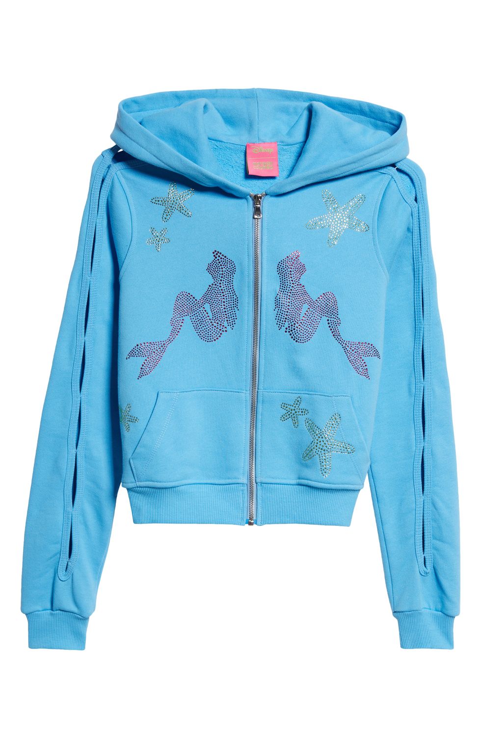 The collection includes colorful pieces that would fit right in on the streets of Bushwick. There are leggings reminiscent of a mermaid tail, complete with a belly button ring, an underwater motif strappy dress, baby tees with rhinestone seashells printed on them like Ariel's iconic bra, a miniskirt with a double-tiered ruffle hem, a sleeveless baby tee and silk scarf emblazoned with Ariel, colorful takes on Columbia's famous bags with Flounder and Ariel keychains and a cropped hoodie with rhinestone embellishments of Ariel, starfish and shells.