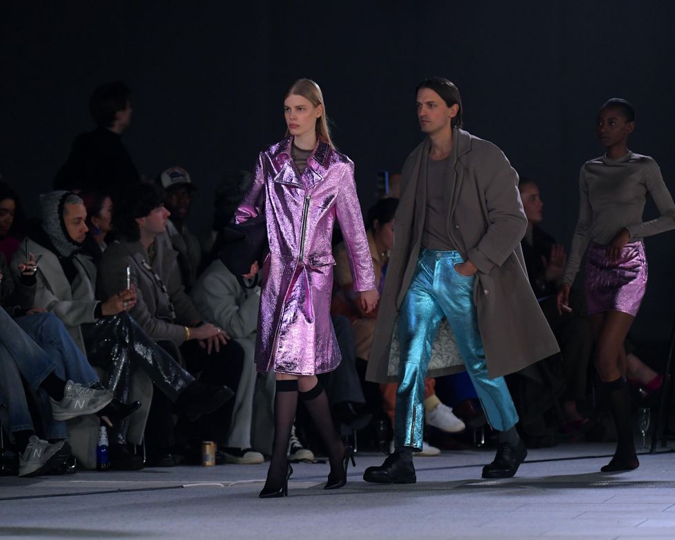"Basically I made a collection that could be worn by whoever and however, that's kind of the concept for the new collection," he says. Among the more "women's focused" pieces he introduced are mini skirts in metallic leather, slip dresses and flowy sequins. His signature androgynous energy is still there, as seen on the tailored suits with bursts of asymmetrical pleats and exposed linings protruding from sleeves and hems. (He titled the collection "Progressive Mix.")