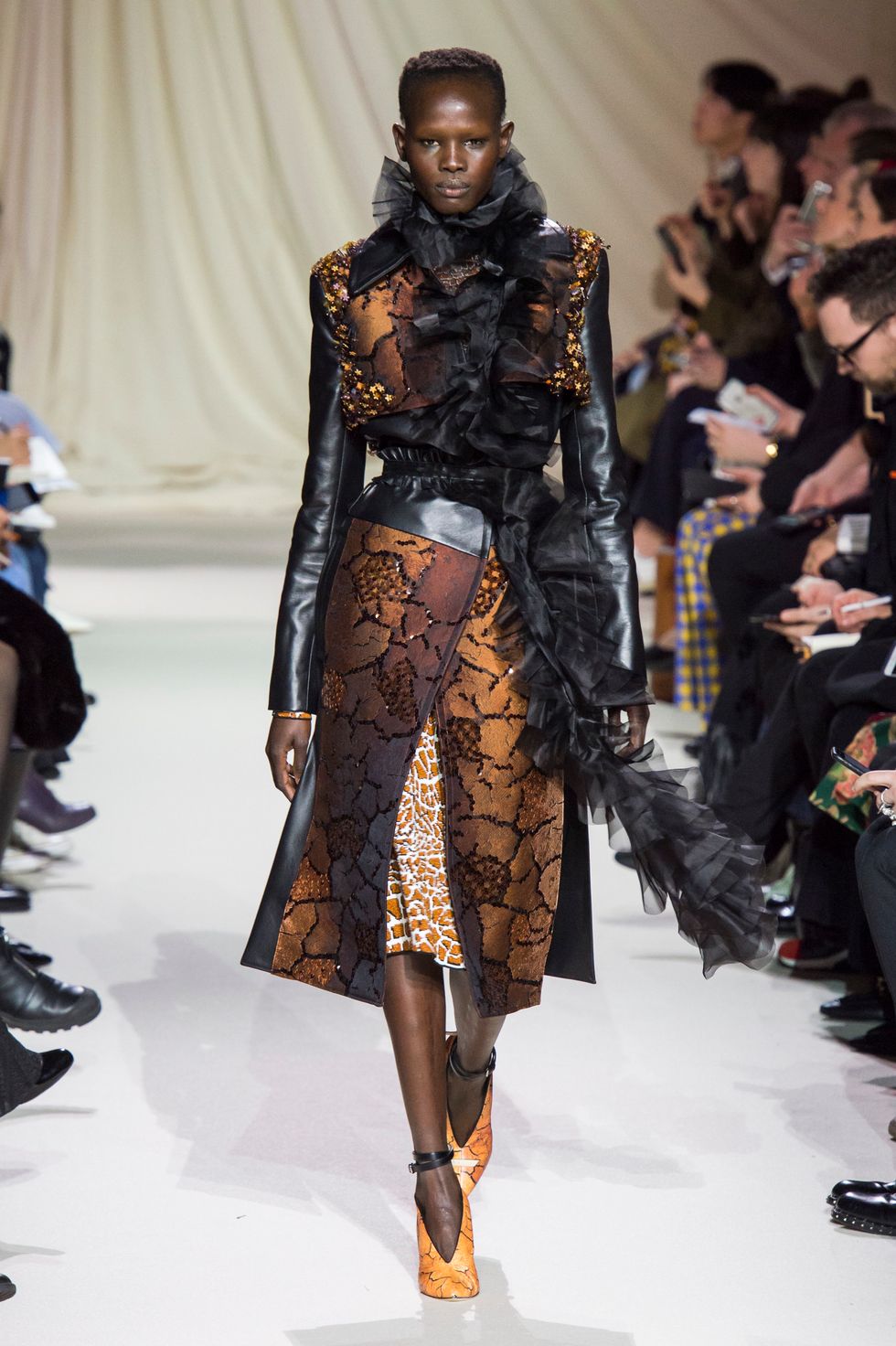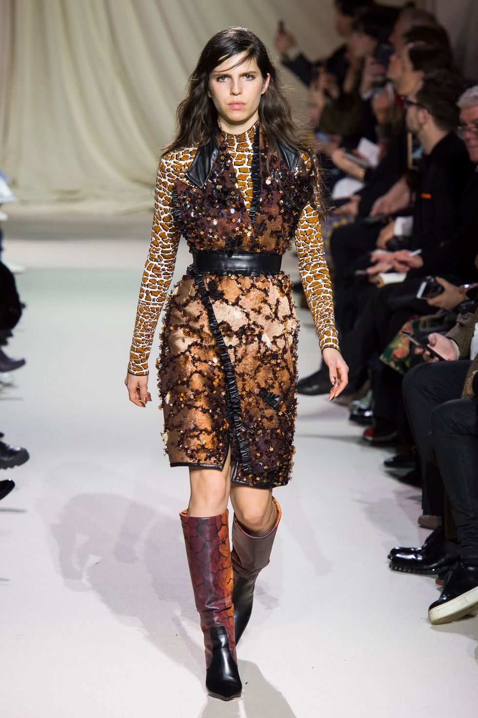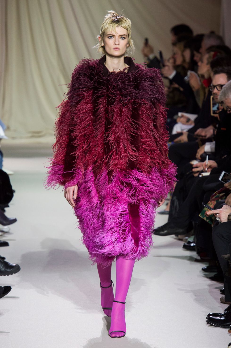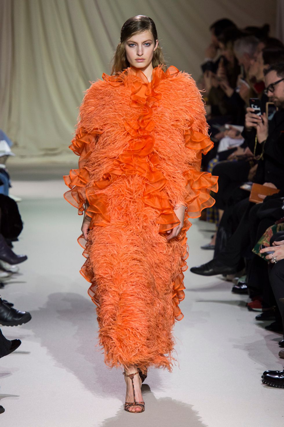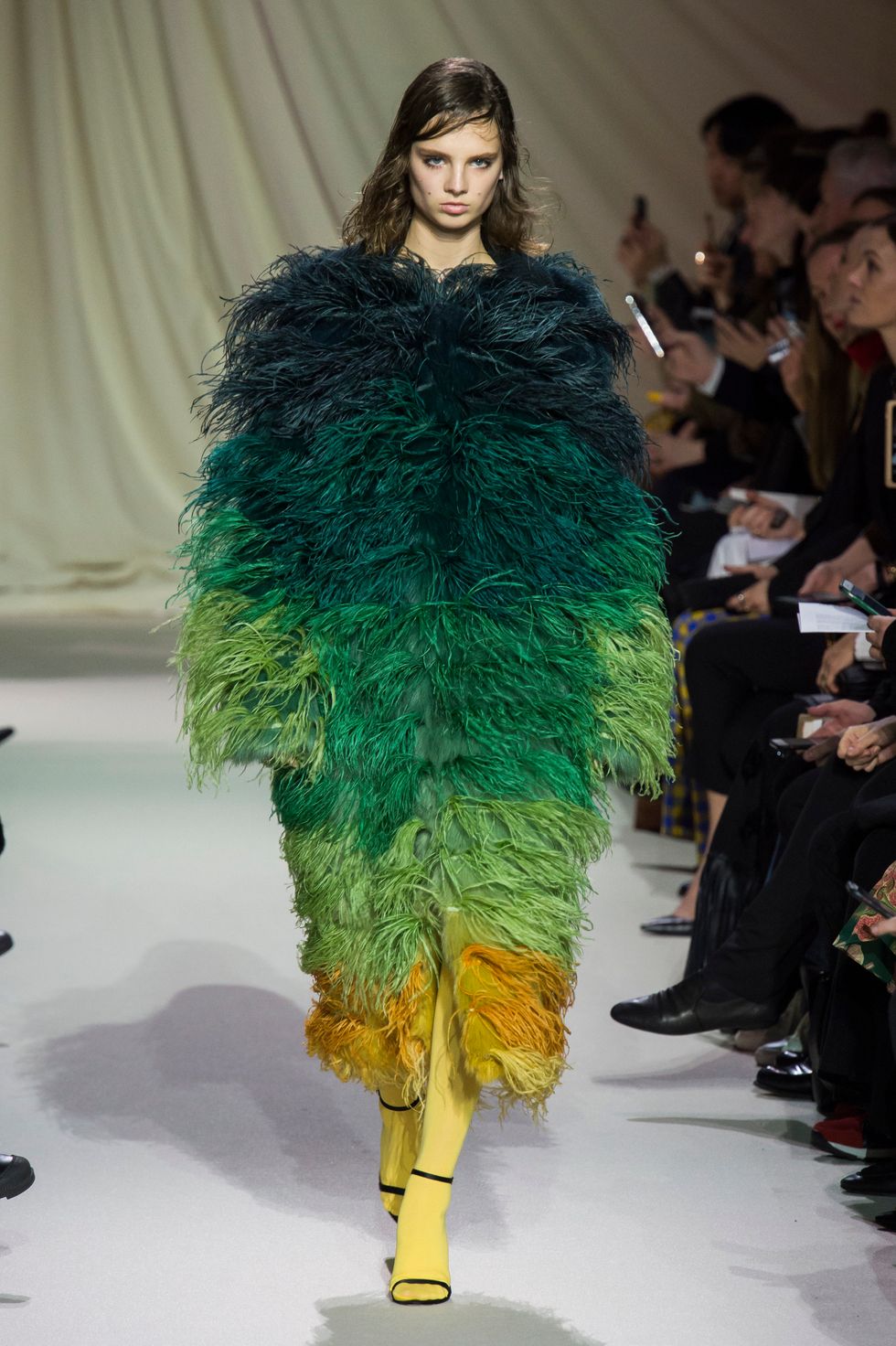 Color, print and pattern dominated the collection along with supernatural textures. Many of the pieces — floor-length gowns, blouses and coats — were covered in colorful fluffy feathers.